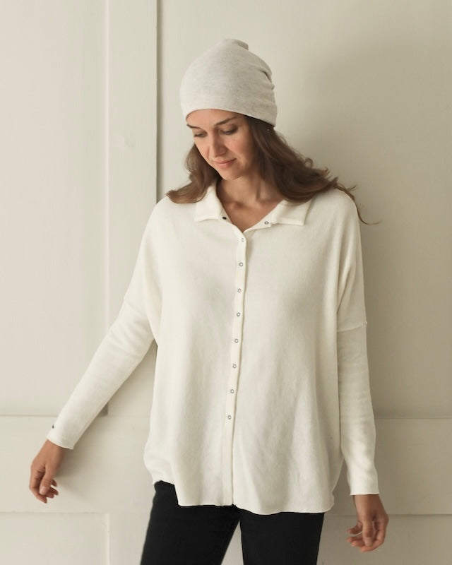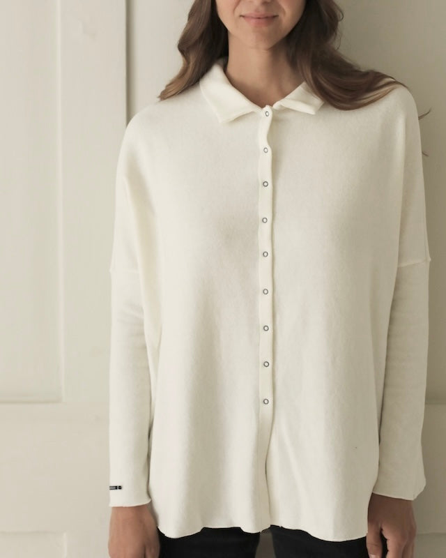 The Polo Aperta is a modern winter essential with a subtly structured silhouette. Crafted with a short standing collar and discreet snap button fastening, it offers a clean, minimal look with just the right amount of detail.