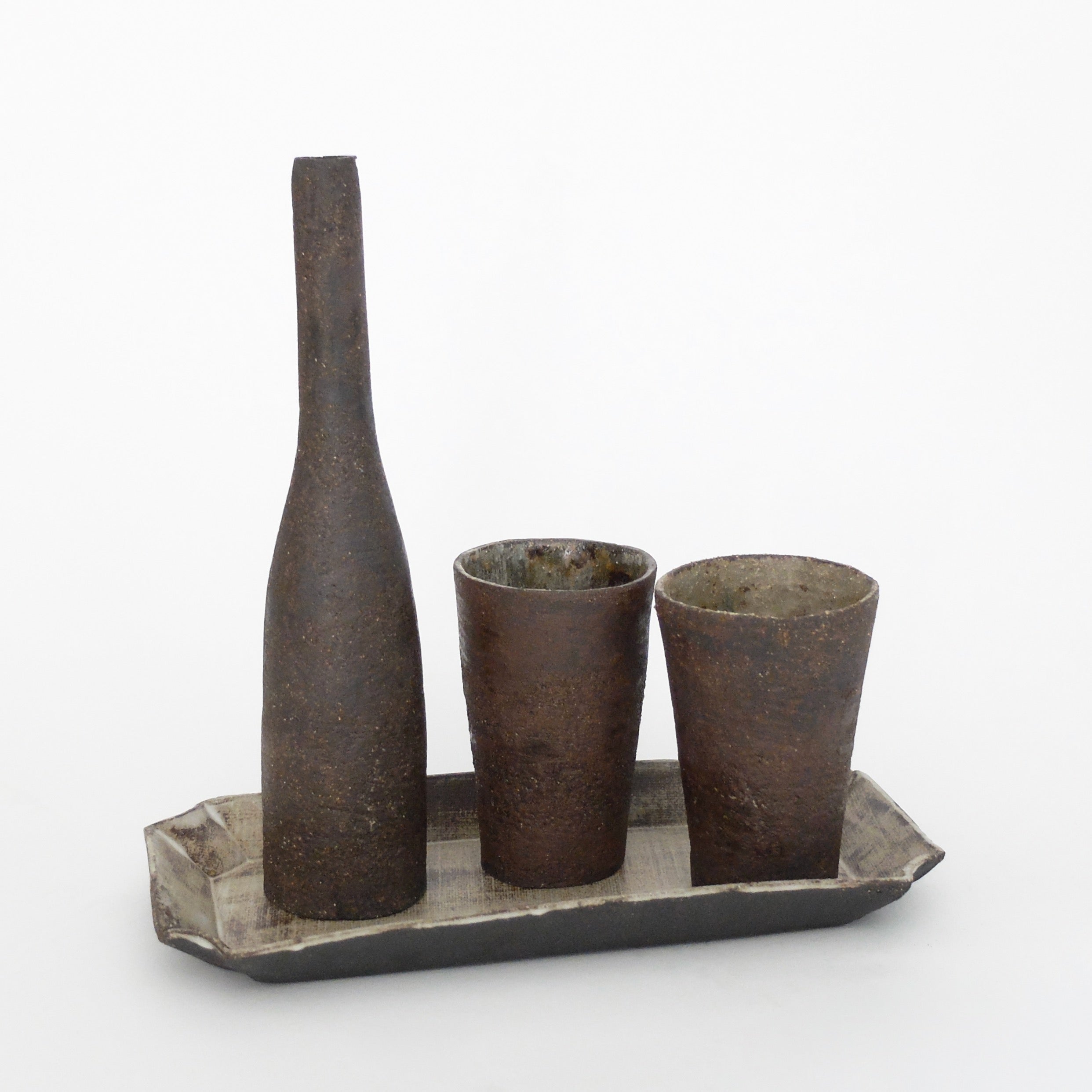 Description: Drinking set composed of 2 cups, 1 bottle and 1 tray hand-built by Alessandra Taccia. The muted hues and matt surfaces are achieved by applying dry glazes or simply leaving the exterior unglazed. Alessandra’s works are both functional and sculptural and can be used everyday, elevating the experience of daily rituals.