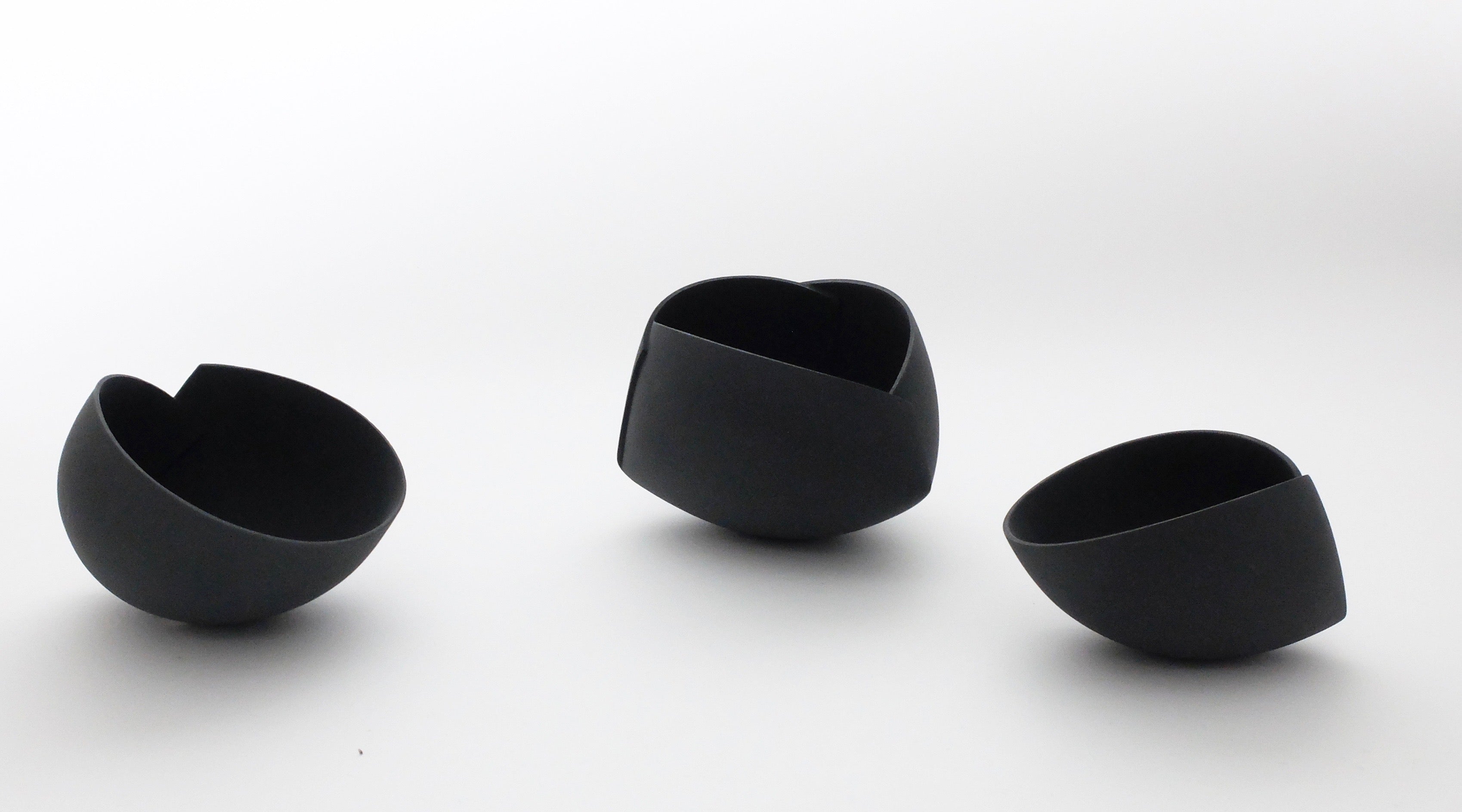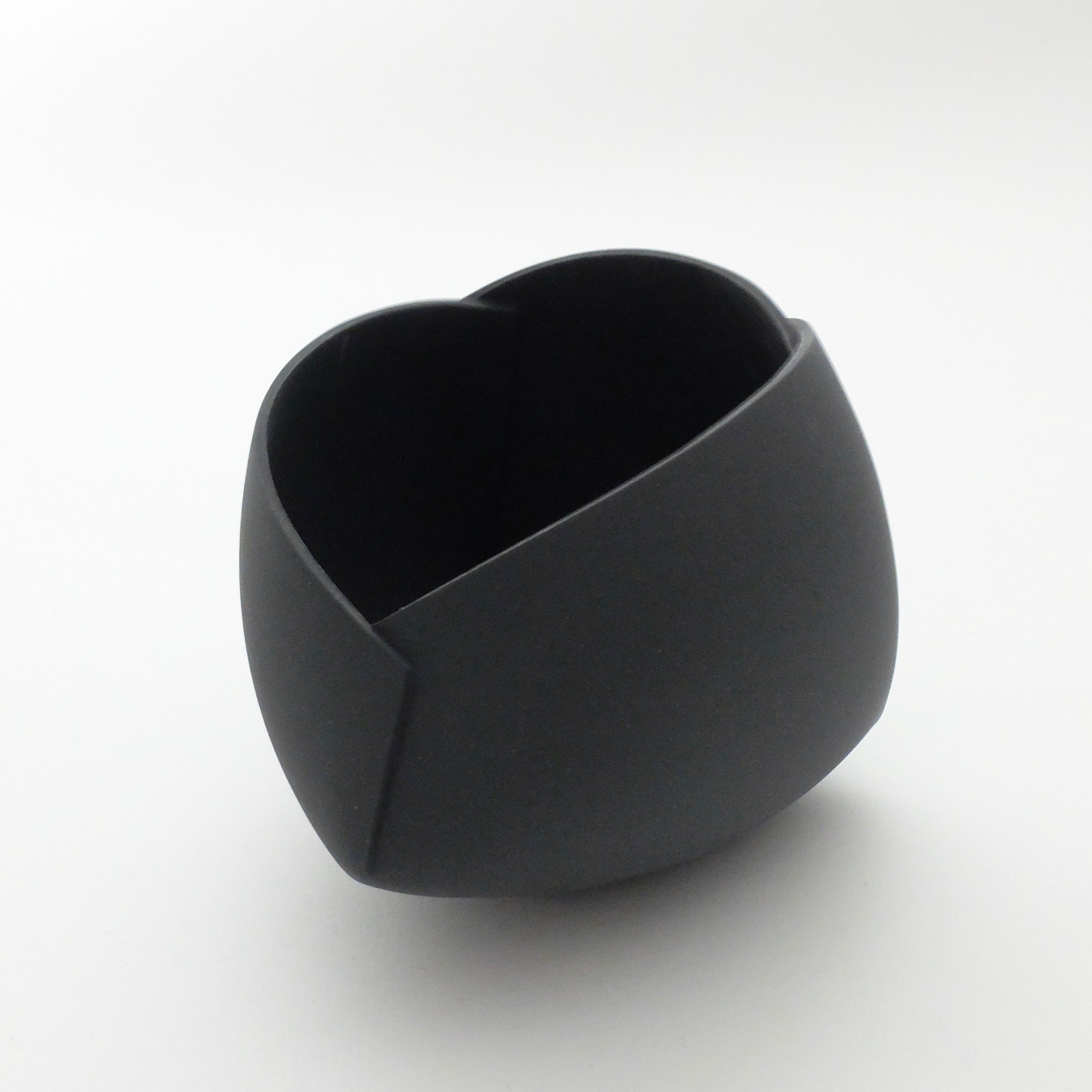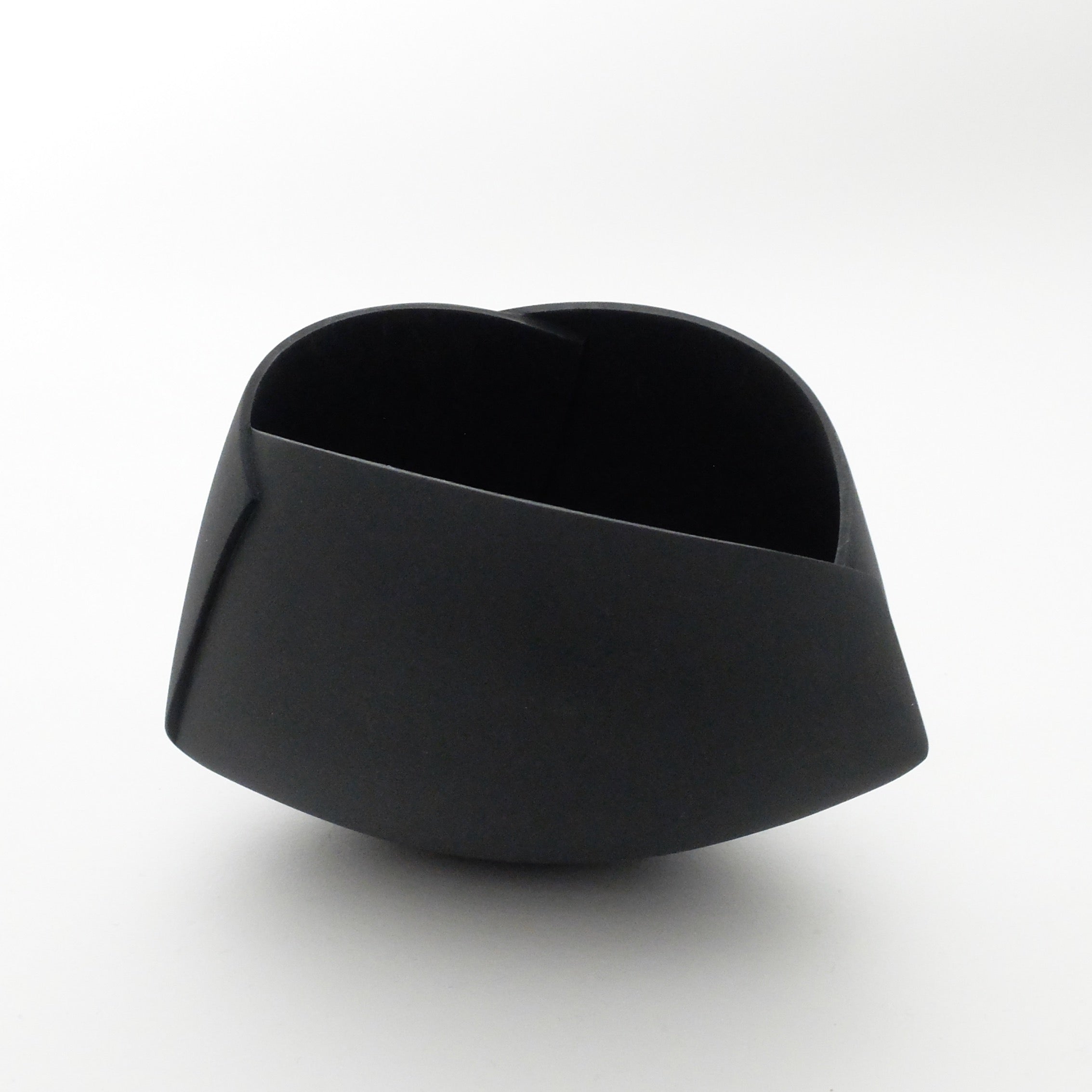 Description: To be displayed individually or as part of a group, this piece is perfectly balanced, with an enticingly smooth surface and a satisfying weight. Created using a smooth stoneware clay, these pieces are hand-built by rolling out perfectly flat, thin slabs, which are then moulded into one of several forms. Once the pieces are formed, they are cut and reassembled into intriguing origami-esque sculptures. The process results in endlessly unique silhouettes with the perfect blend of soft, easy curves and crisp edges and folds. The stoneware object is finished with a deep matt black engobe which catches light and shadow with a softness that accentuates the complex array of angles and faces within the form.