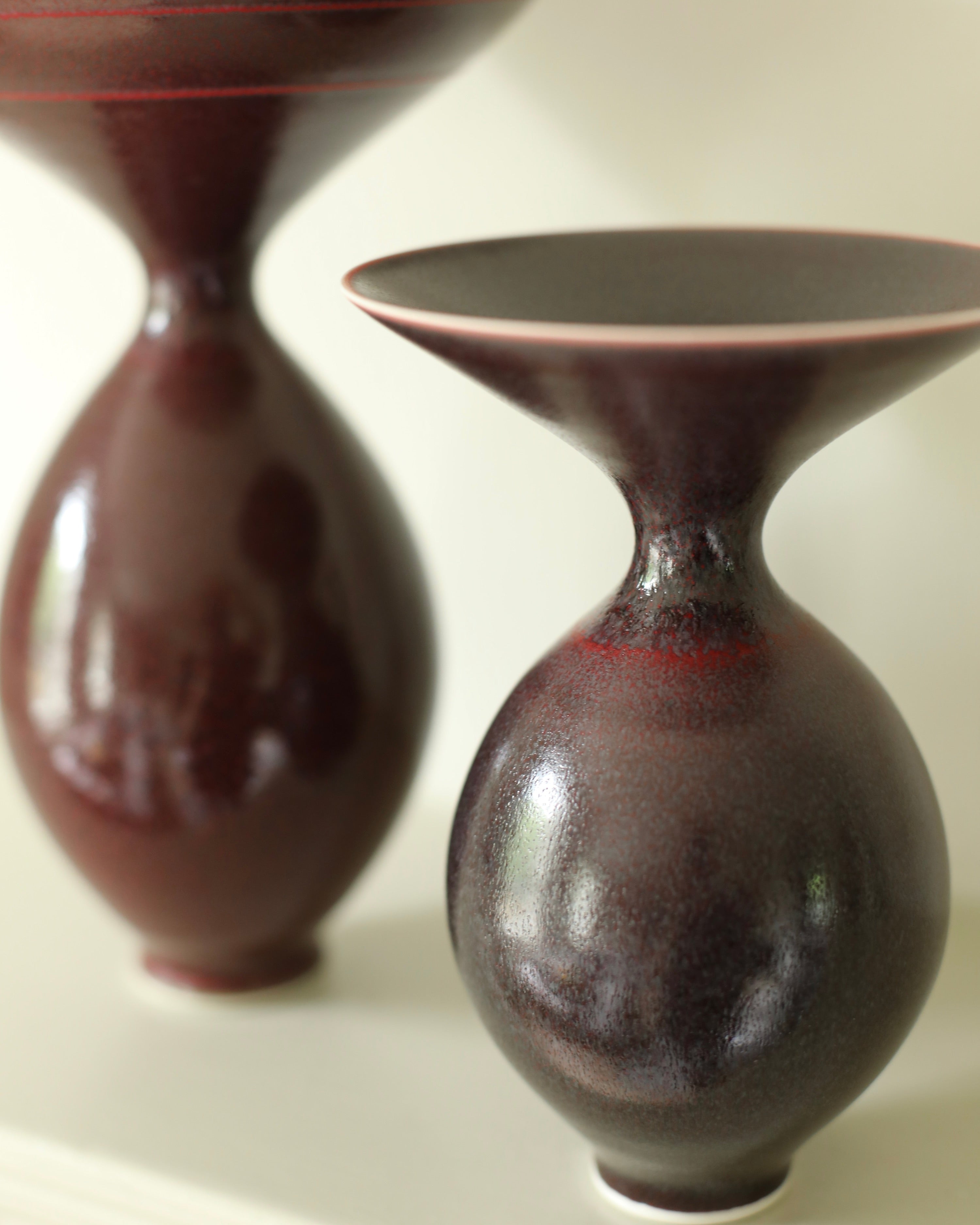 Materials: Porcelain with a reactive burgundy glaze and a raspberry banded detail.