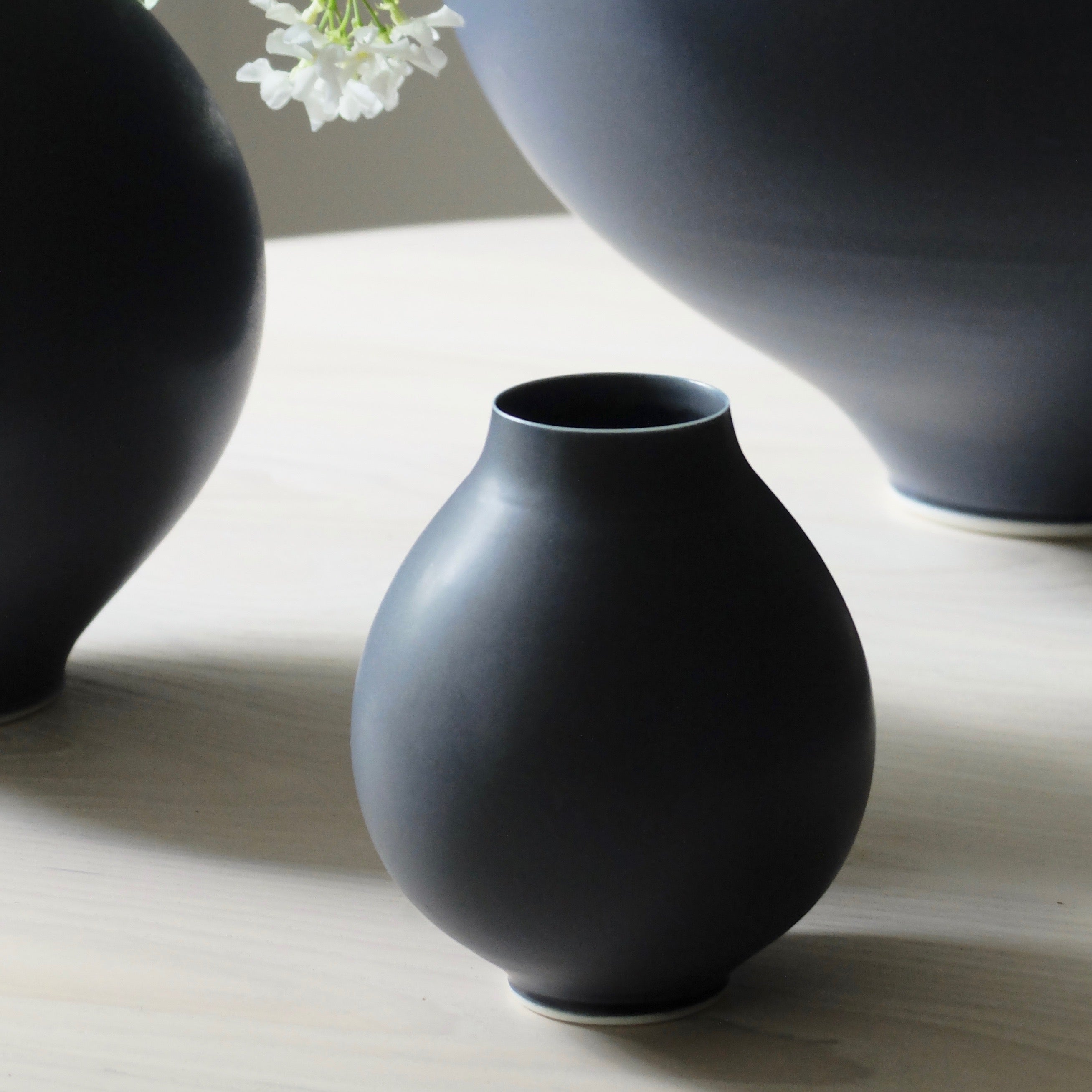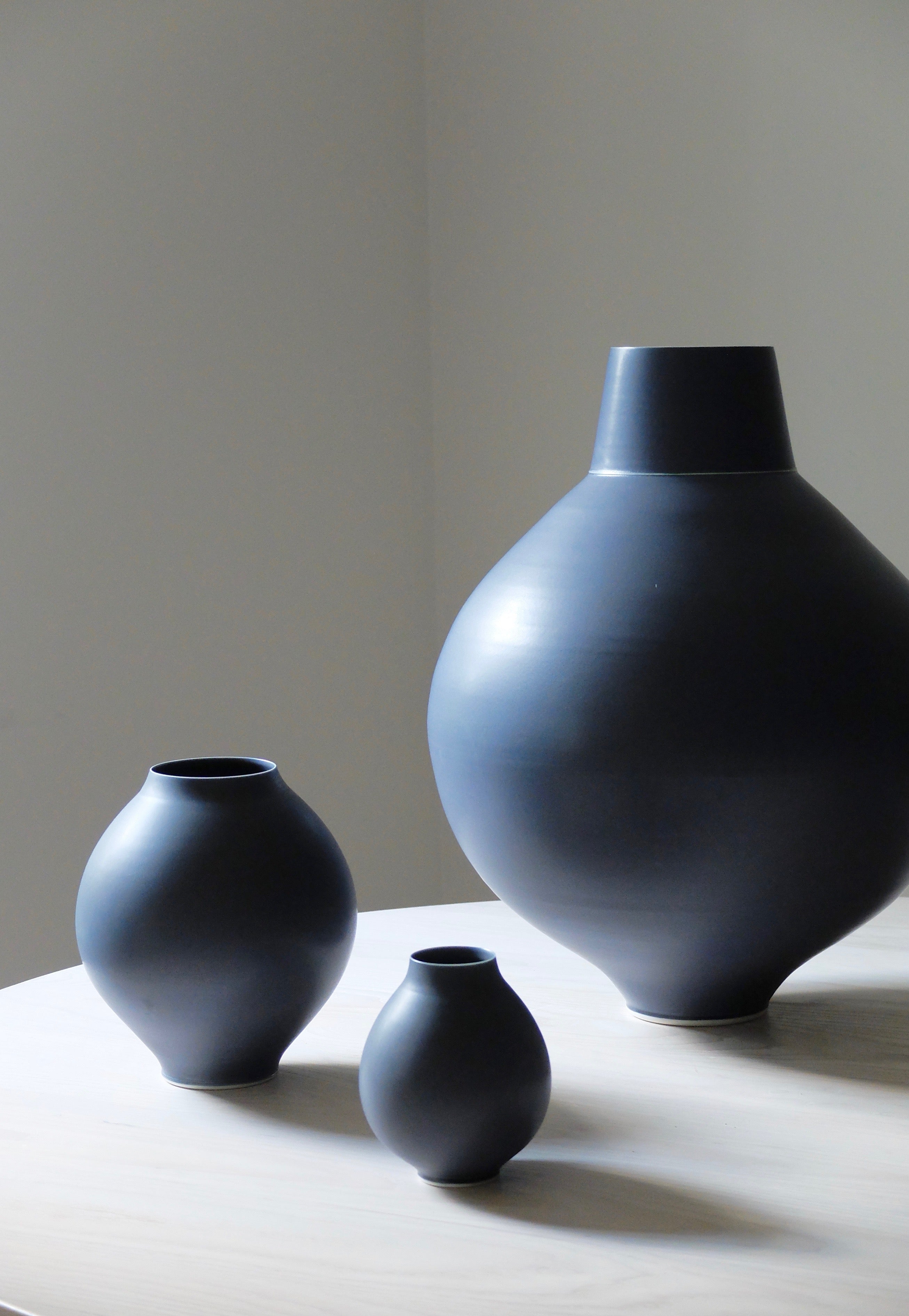 An enticing deep blue finish with subtle hints of purple, and lightening around the rim and base that edge give this bold form a delicate touch. Hand crafted by Anna Silverton, this beautifully soft form has a clean, unobstructed silhouette and a weight that adds depth to the rounded body, contrasting wonderfully to the slim rim.