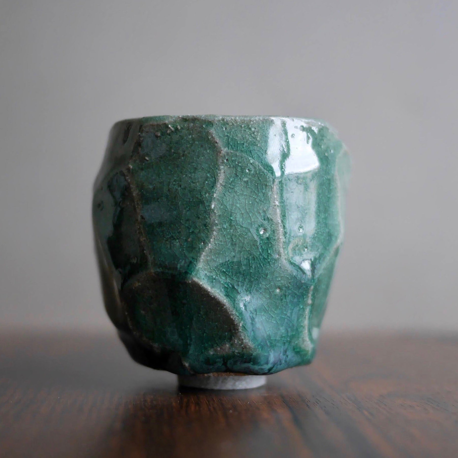 This precious cup is by Annette Lindenberg, made from grey clay with toasted edges in deep green. The piece is based on watching rivers and streams flow and trickle, softening edges of rocks, gently swaying plants beneath the surface.