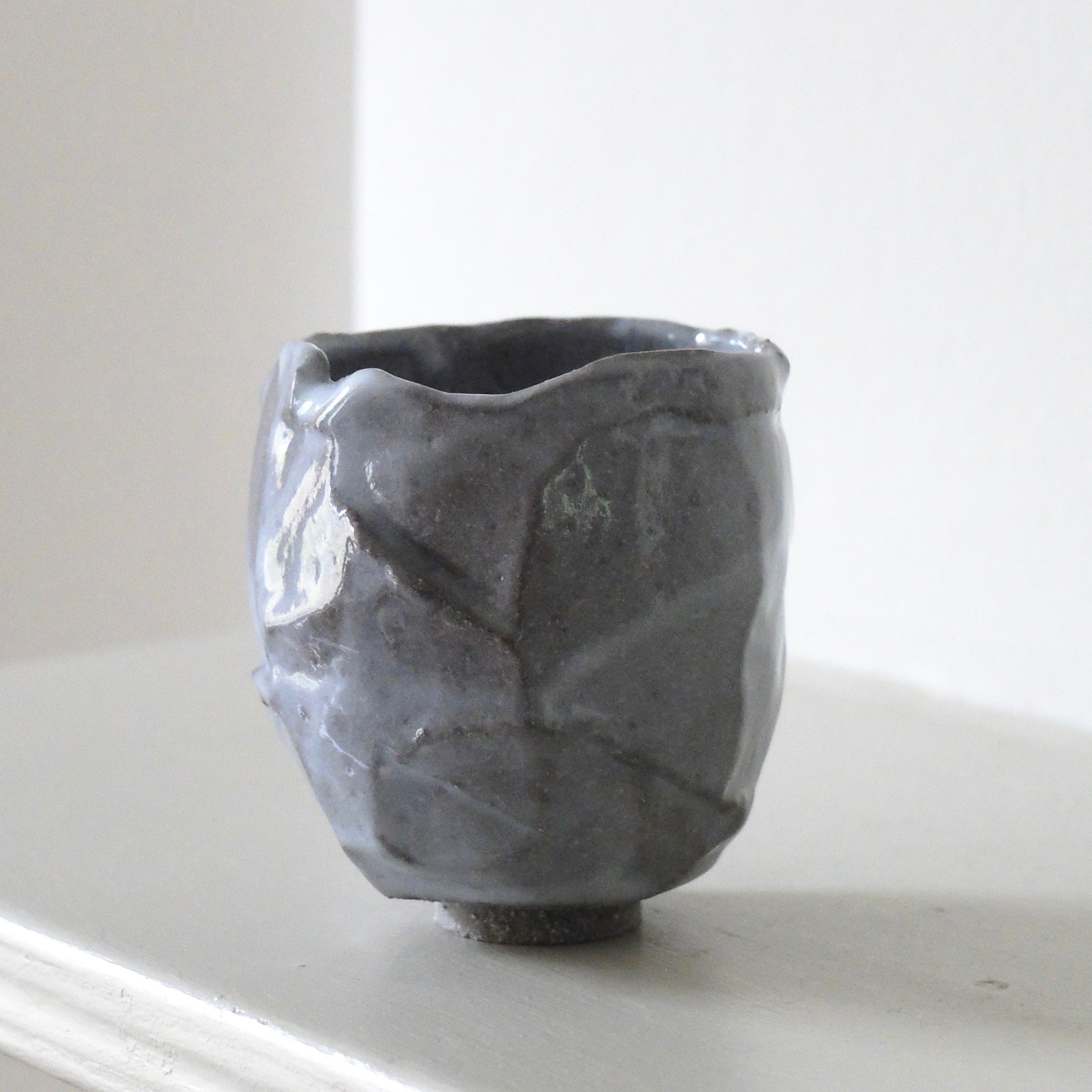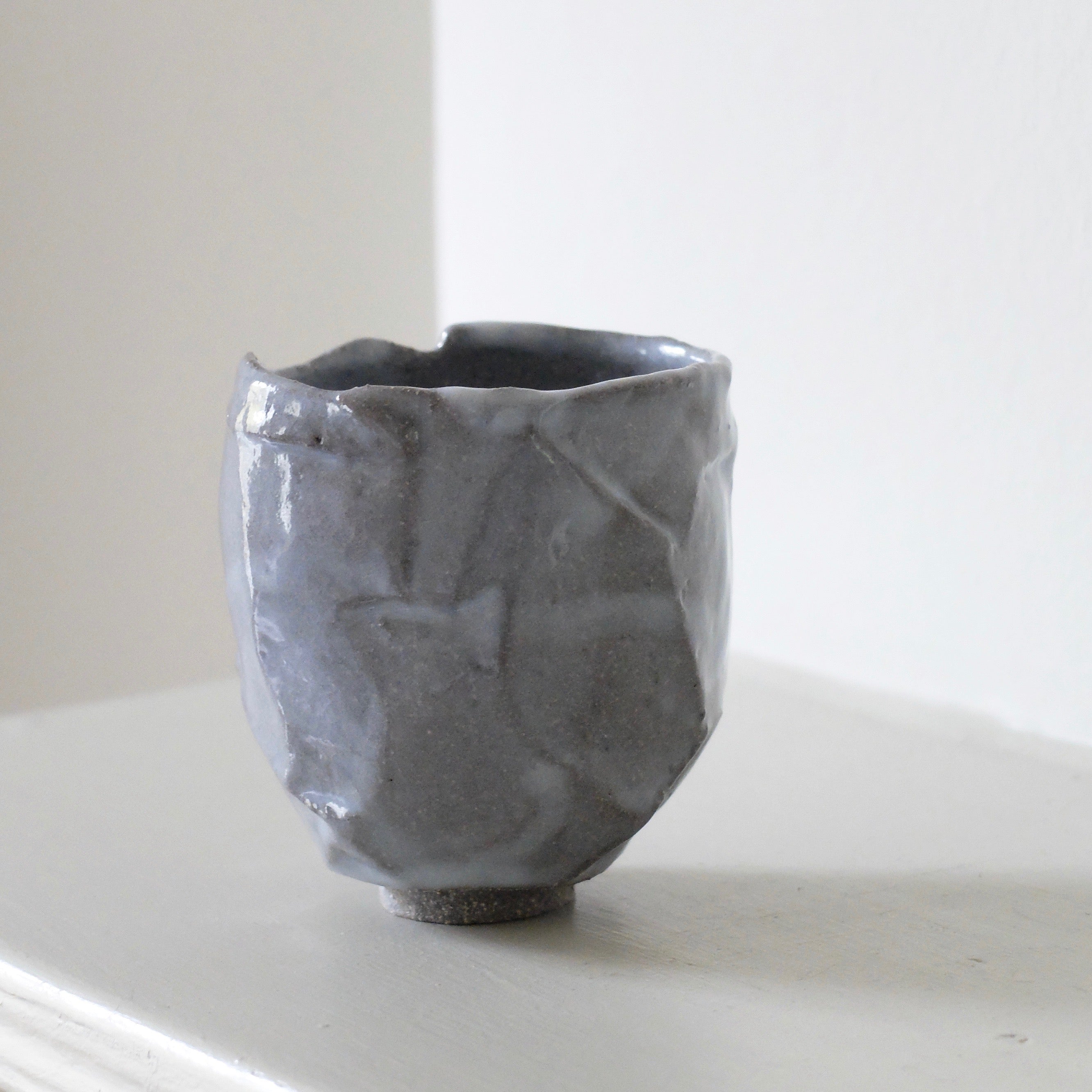 The beautiful yunomi cup is finely handcrafted by artist Anette Lindenberg using kurinuki, the traditional Japanese technique of carving from a single block of clay. The cup is made with mid-grey clay and glazed in Lindenberg’s pale blue glaze, applied to show variation in the colour tone of the glaze and capturing the fluidity of glaze before firing. The pale glaze gathers following the edges of the facets, capturing a sense of quiet movement and temporal in-betweenness. The subtle crackles of the glaze enhance the whimsical playfulness accompanying the tonal modulations. More evenly applied glaze on the smooth interior of the bowl shows a faint hint of a warm lilac hue, giving it an almost luminescent quality, while white specks visible through the thinly applied tinted glaze hint at the sandy texture of the body protruding along the edges of the kurinuki cuts. The complex texture juxtaposes with the simple, finely sculpted asymmetrical form of the cup — the rounded belly comfortably curves into the palm.