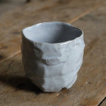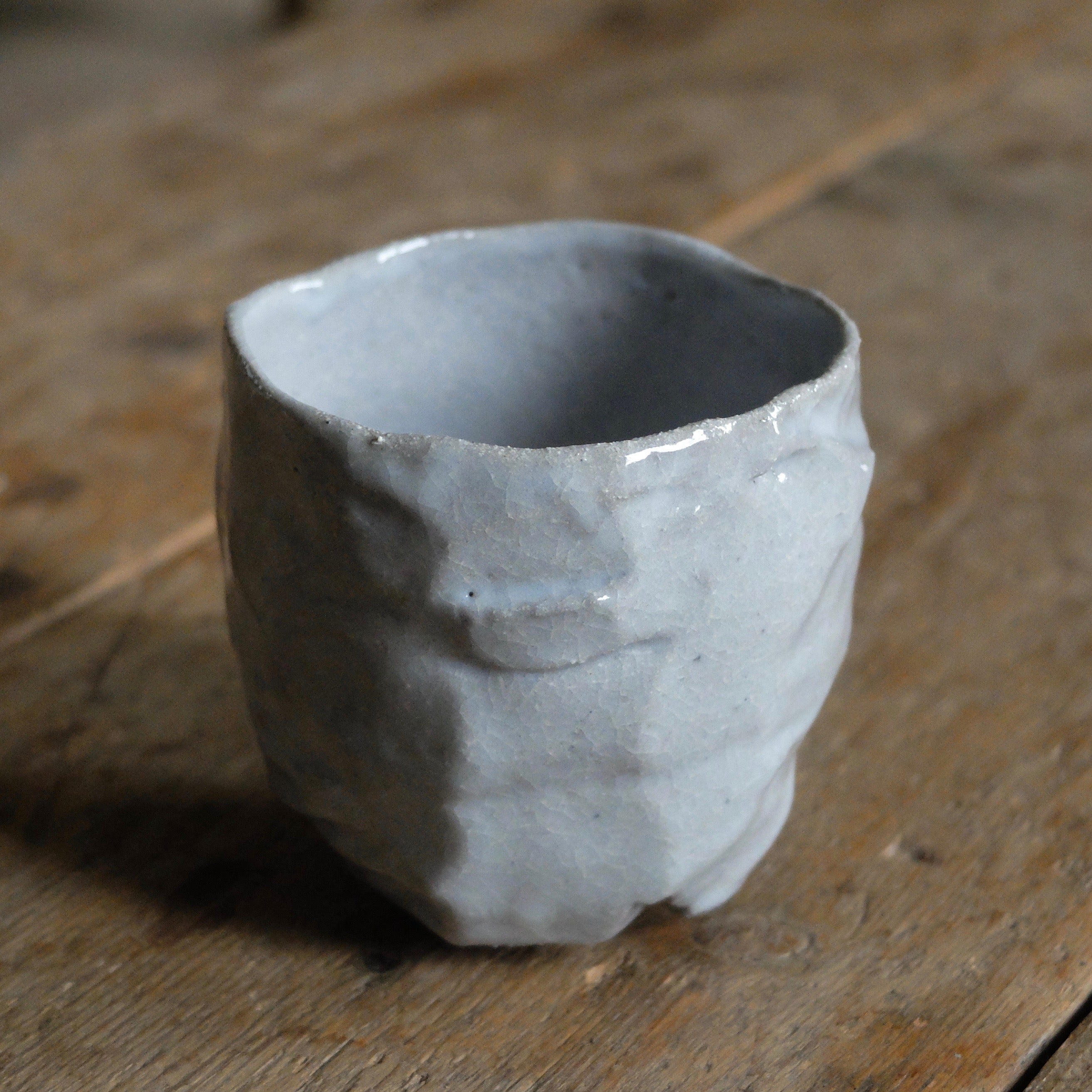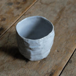The beautiful cup, the artist’s personal favourite piece from her Quiet Thoughts collection, is finely handcrafted by artist Annette Lindenberg using kurinuki, the traditional Japanese technique of carving from a single block of clay. The cup is made with hand mixed pale grey clay glazed in a gentle crackling garden glaze. The simplicity is matched by the quiet subtle blue tint of the grey glaze with lilac hue when viewed under certain lights. Understated small crackles in the glaze catches the tints of colours and adds complexity to the piece. The cool tones are set off by the warmth of the thinly applied milky glaze which makes the piece smooth to touch, complemented by the curvature of the form which sits comfortably in a palm.