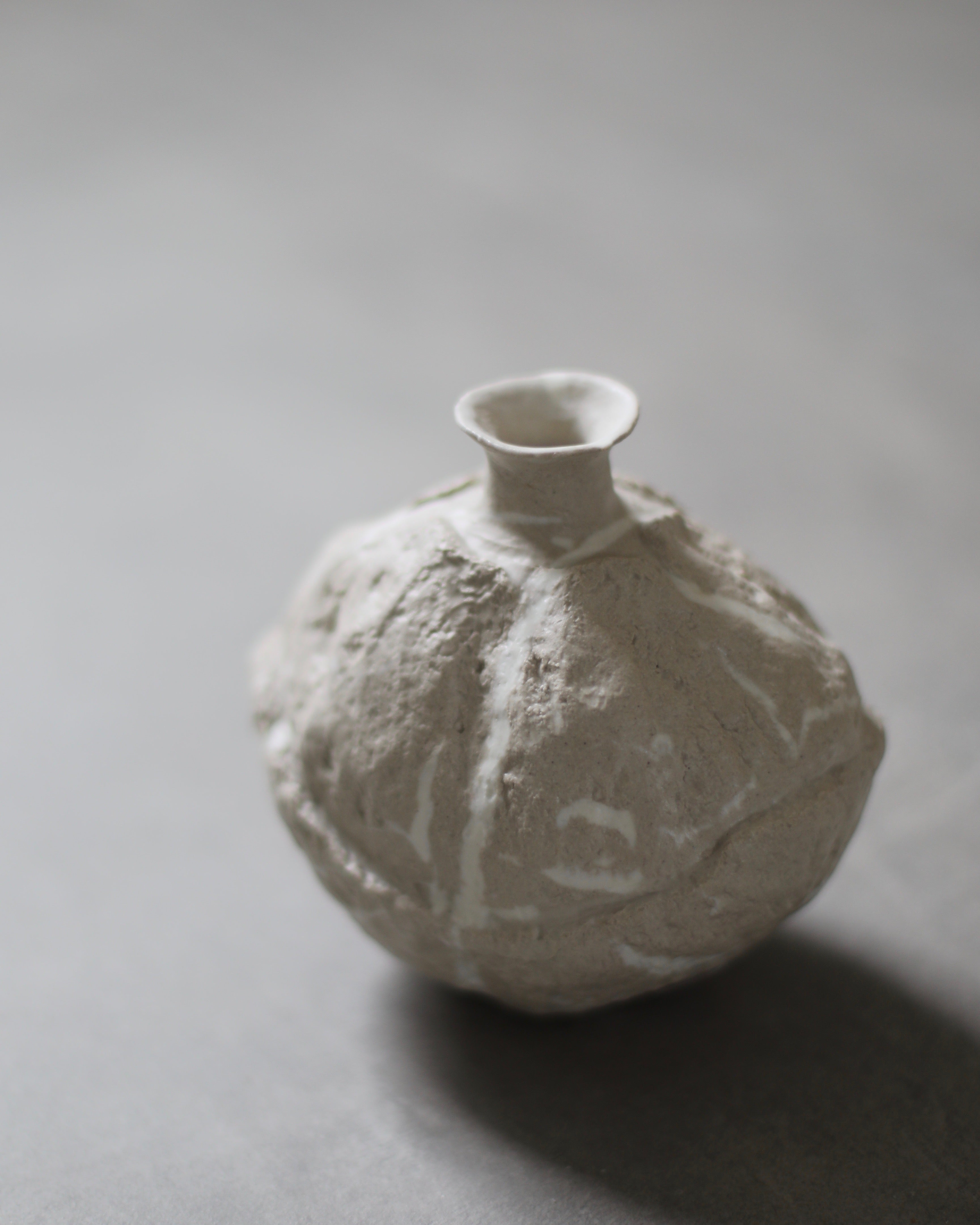 This bottle is carved from porcelain and hand mixed cream stoneware, glazed in matte. It elegantly balances complex textures with a finely sculpted jaggedness, reflecting the artist’s interest in natural geomorphic forms and textures.