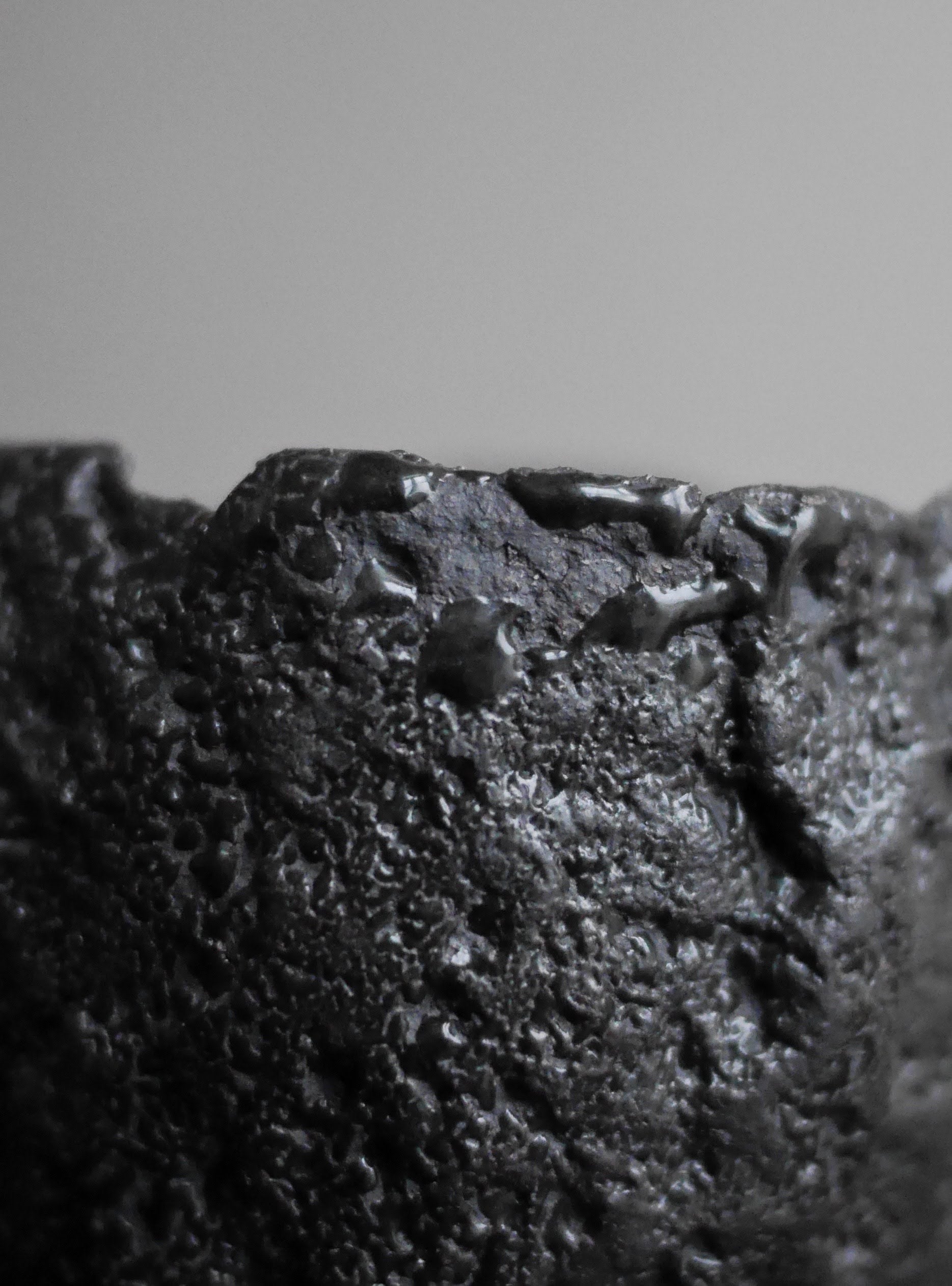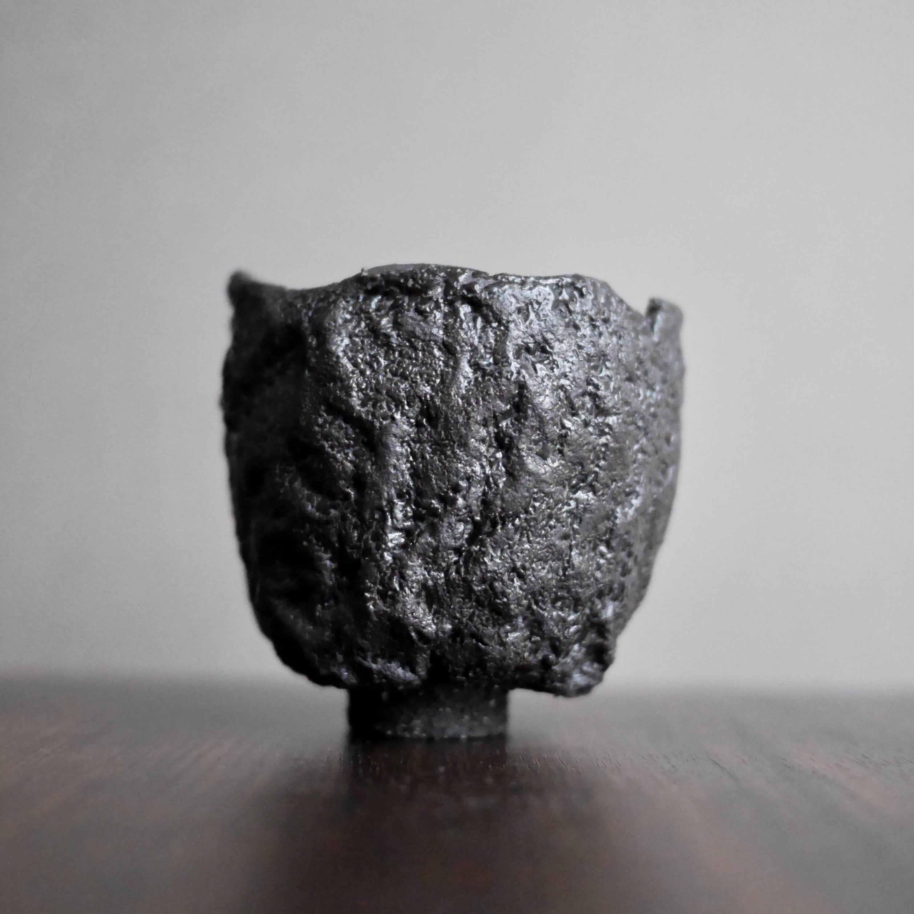This precious Yunomi cup by artist Annette Lindenberg is made from black stoneware with a "Yakisugi" glaze. This is inspired by the charring of wood combined with the carved texture of volcanic pebble in a black clay. Lindenberg chose to make the work lightweight as a way to reflect on the weight of volcanic stone and charred wood.