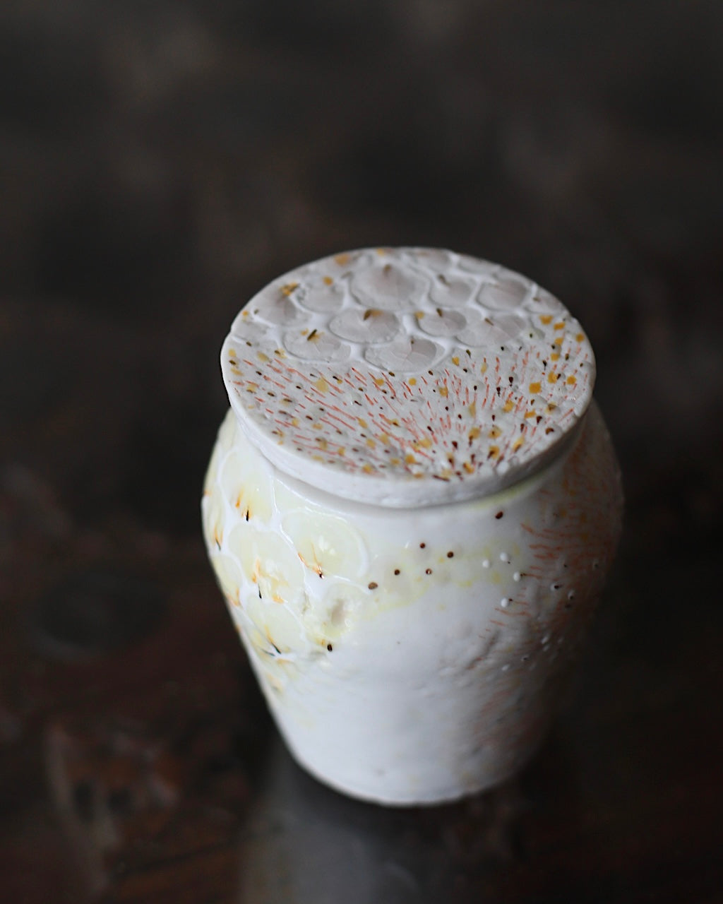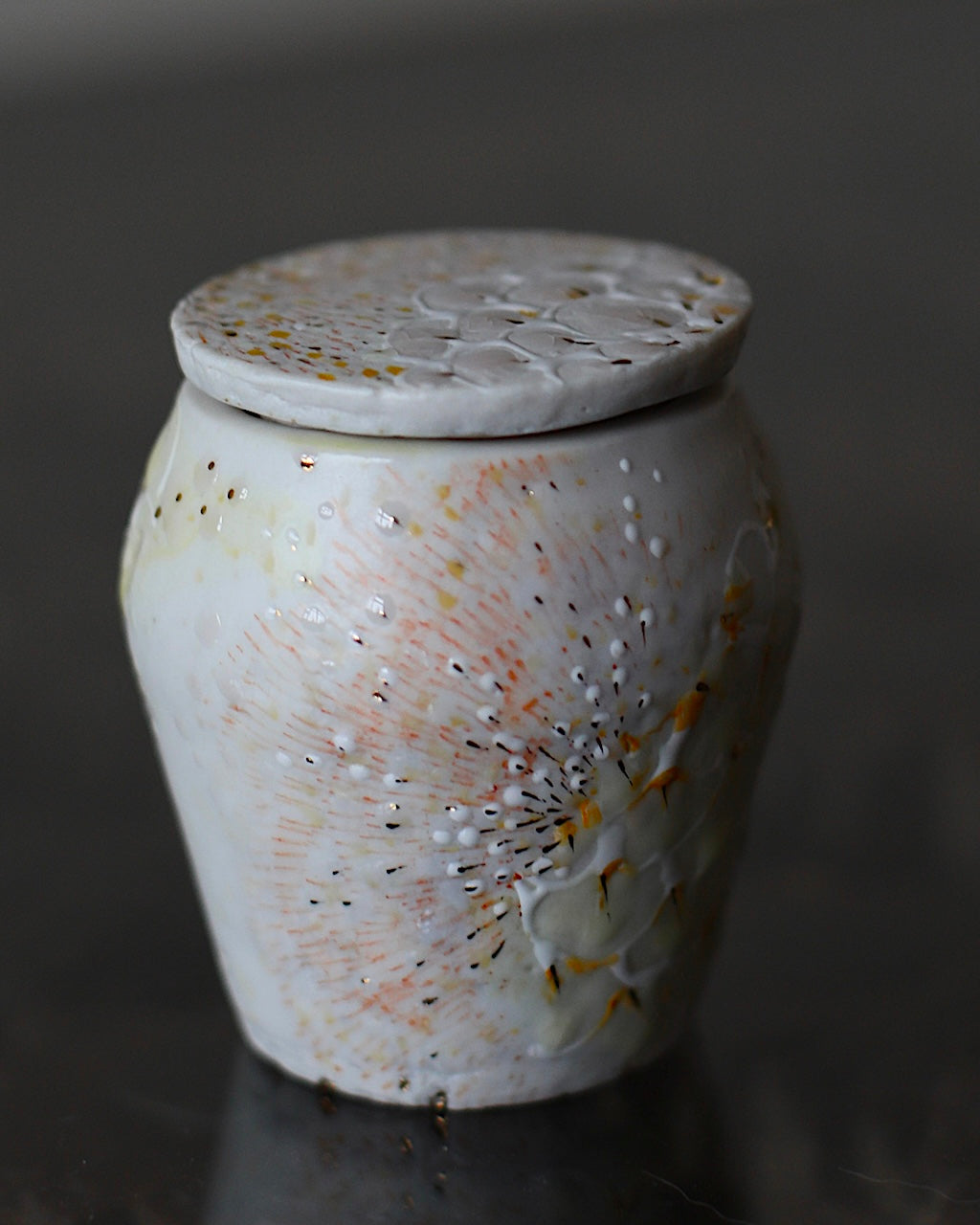 Asaho Kamiya’s ceramic collection features poetic forms with richly worked surfaces, where bare clay and layered glazes create depth and quiet contrast and areas of a stonelike matt finish meet intricate glossy glazes, providing additional depth and tactile surface variation. The palette ranges from vibrant colour to soft, ethereal tones, accented with subtle touches of gold. Intricate illustrations and gestural patterns referencing plants and natural forms are delicately drawn into the surface, sometimes clearly defined, sometimes dissolving into abstraction. Across the collection, form, image, and surface are closely integrated, creating vessels that reveal their details slowly over time.