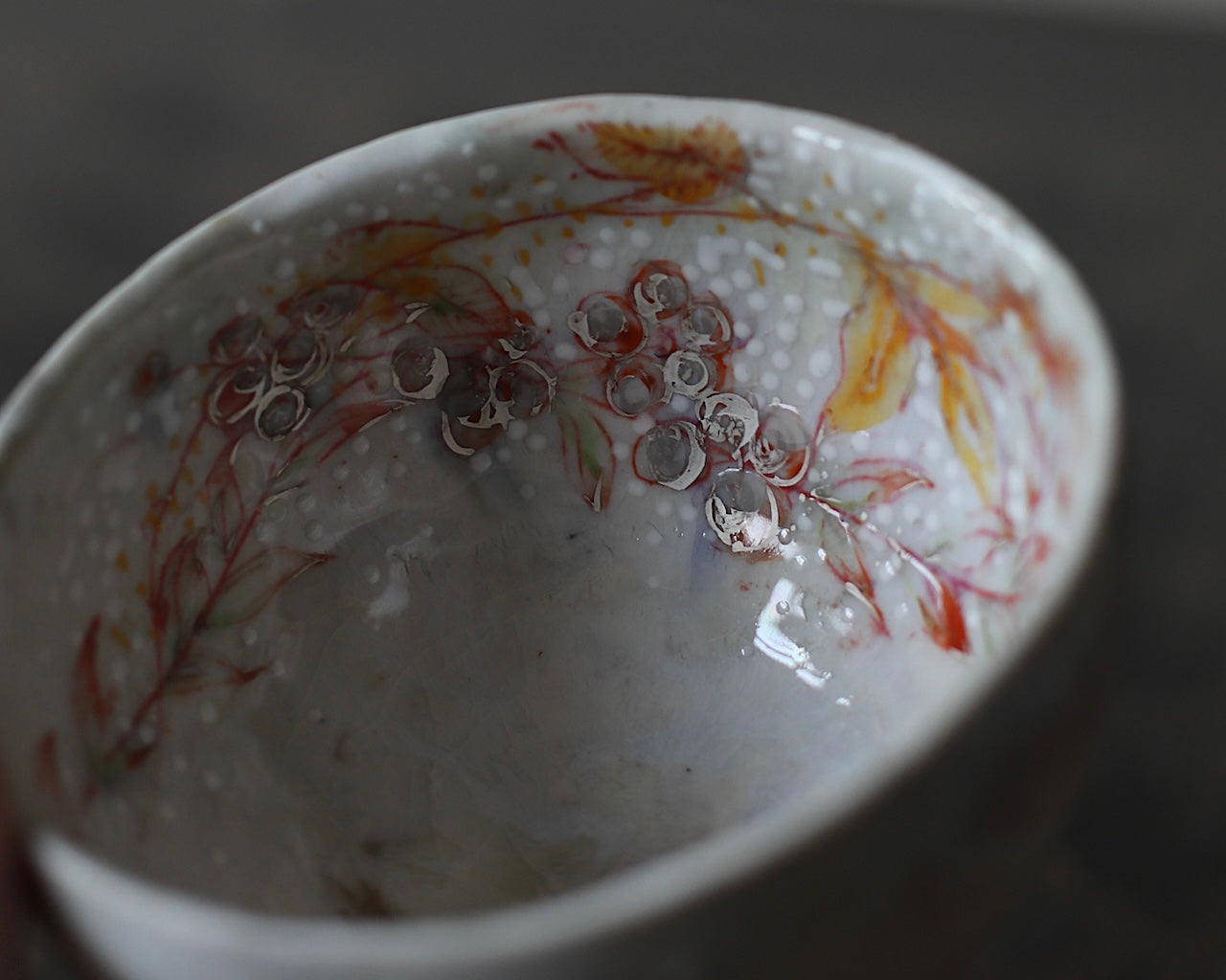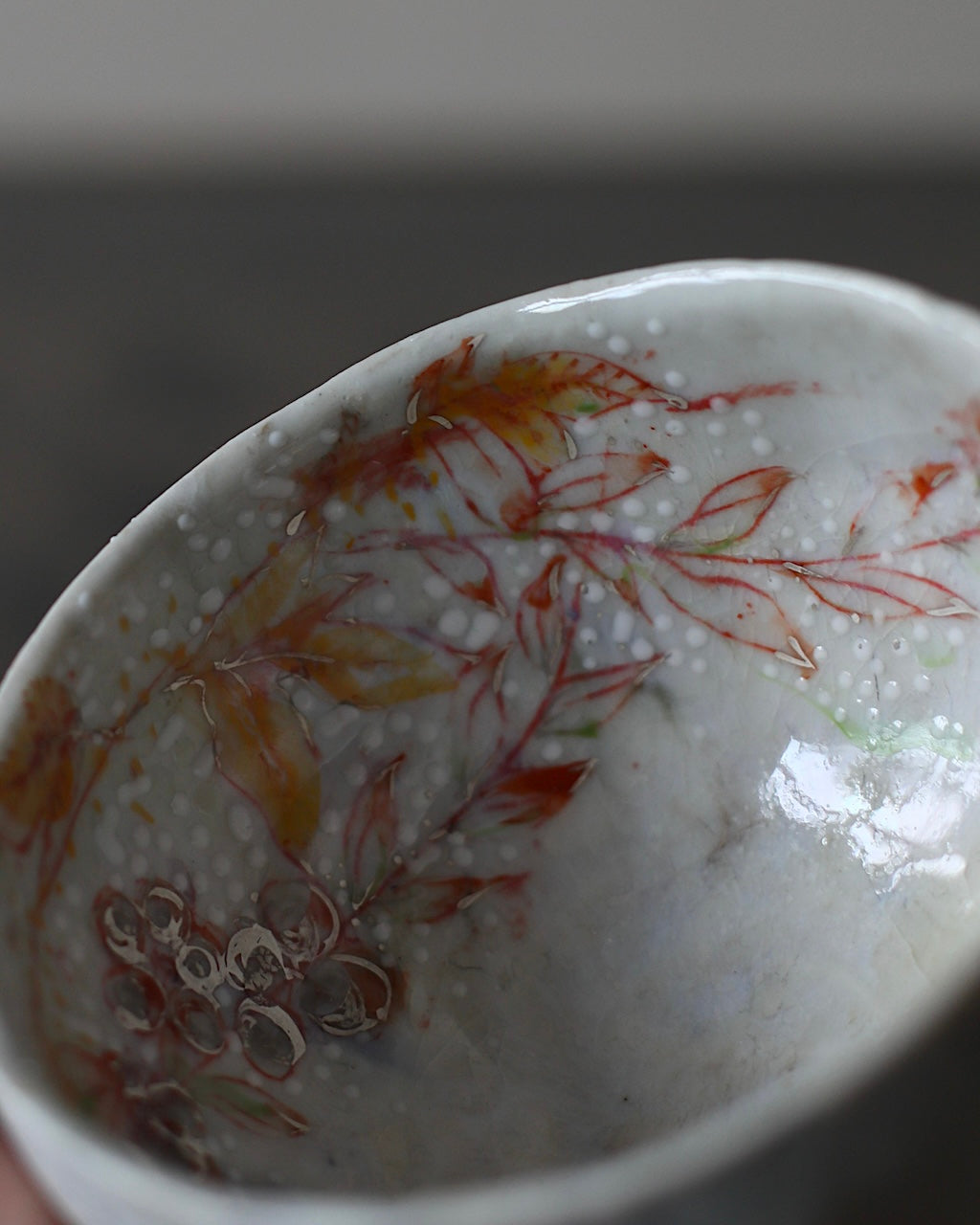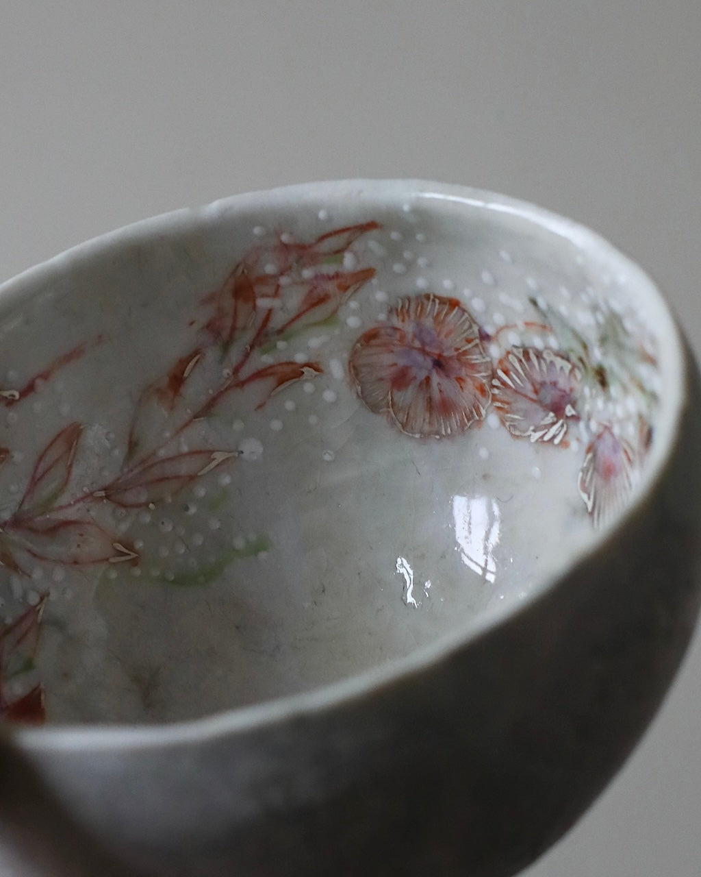 Asaho Kamiya’s ceramic collection features poetic forms with richly worked surfaces, where bare clay and layered glazes create depth and quiet contrast and areas of a stonelike matt finish meet intricate glossy glazes, providing additional depth and tactile surface variation. The palette ranges from vibrant colour to soft, ethereal tones, accented with subtle touches of gold. Intricate illustrations and gestural patterns referencing plants and natural forms are delicately drawn into the surface, sometimes clearly defined, sometimes dissolving into abstraction. Across the collection, form, image, and surface are closely integrated, creating vessels that reveal their details slowly over time.