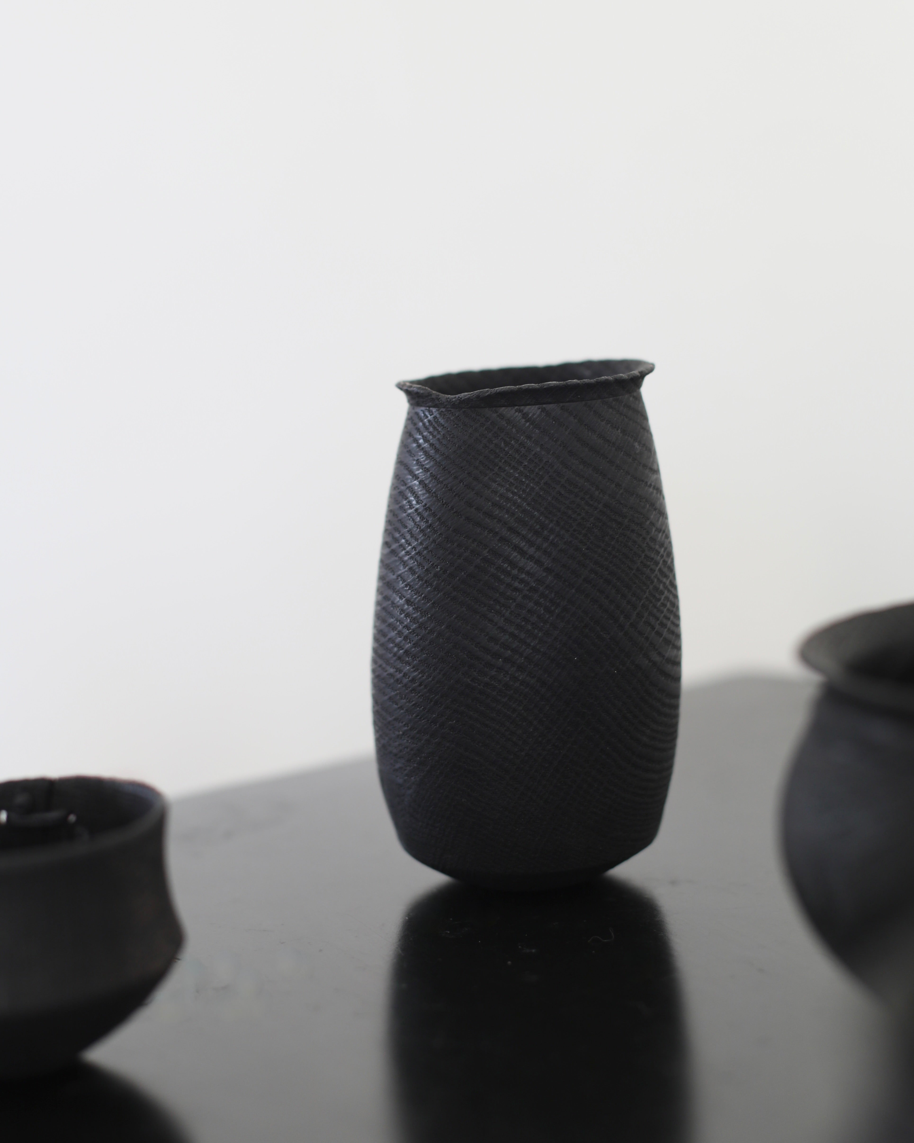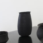 Crafted from scorched oak, the form of this vessel carries a distinctive silhouette. The blackened surface reveals the grain of the wood while bearing visible stitches, subtle scars that speak of repair and resilience. These marks introduce a tension between fragility and strength, damage and healing, giving the piece an almost ceremonial presence.