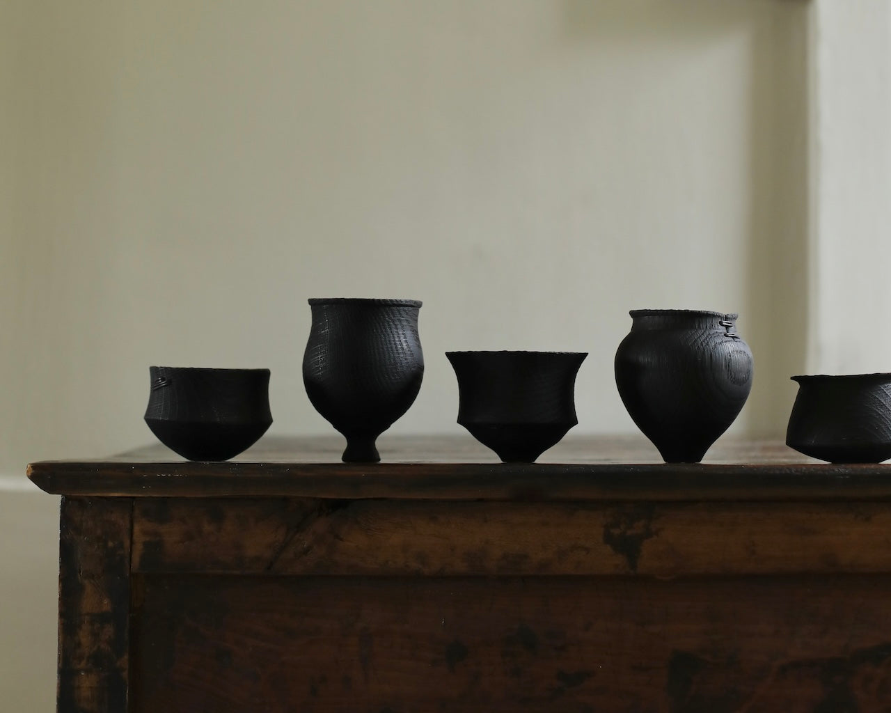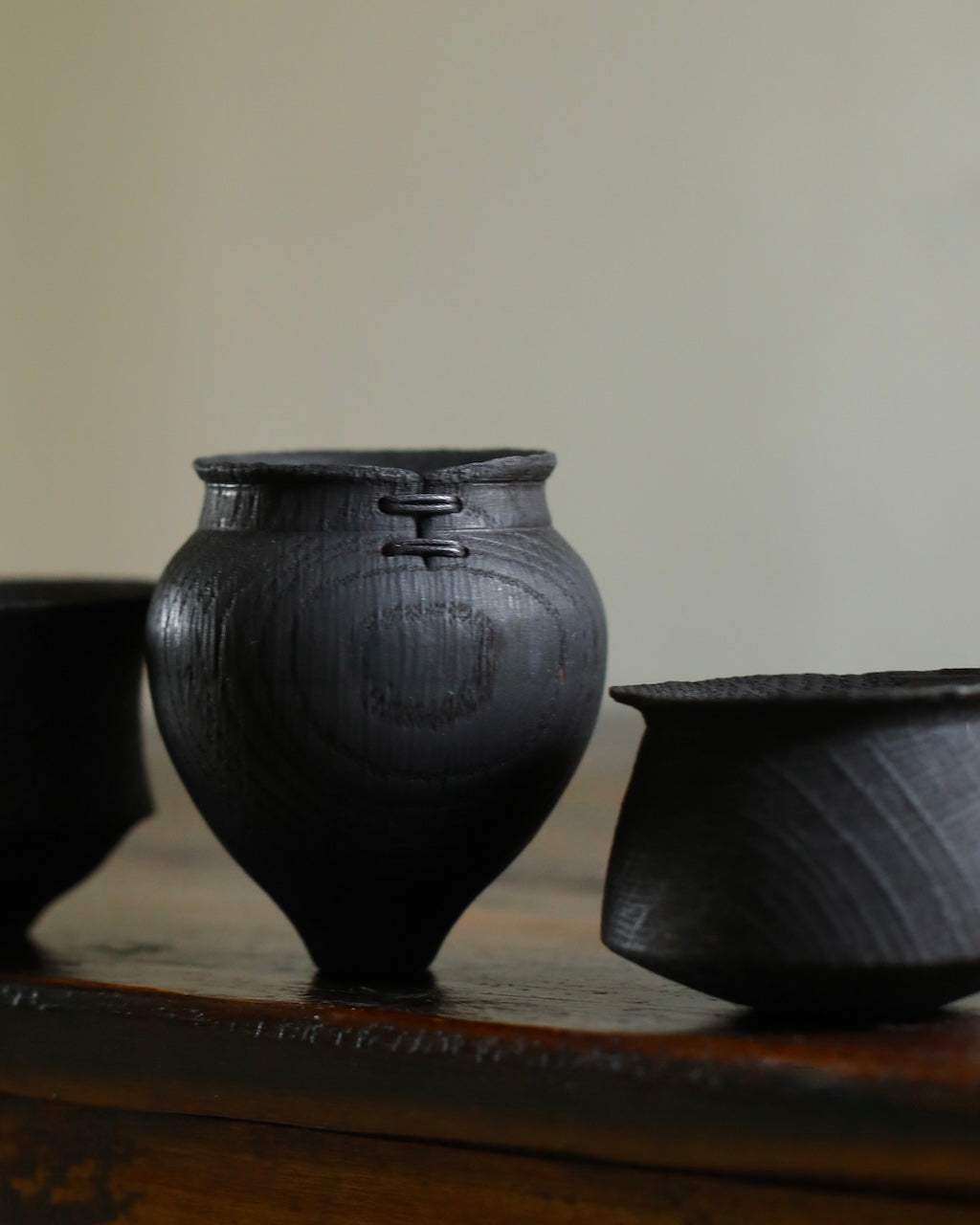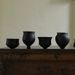 This series of five small vessels, carved from scorched oak, presents a study in variation and unity. Each form carries its own rhythm, some compact and restrained, others swelling outward with fuller curves or flared rims. The dark, charred surfaces highlight the grain of the wood, while fine stitches mark points of fracture and repair, transforming damage into quiet ornament. Together, the vessels embody a dialogue between vulnerability and resilience, their differences balanced by a shared material presence. Arranged as a group, they evoke a gathering, each piece distinct, yet bound in kinship, like a family of forms carrying memory and renewal.