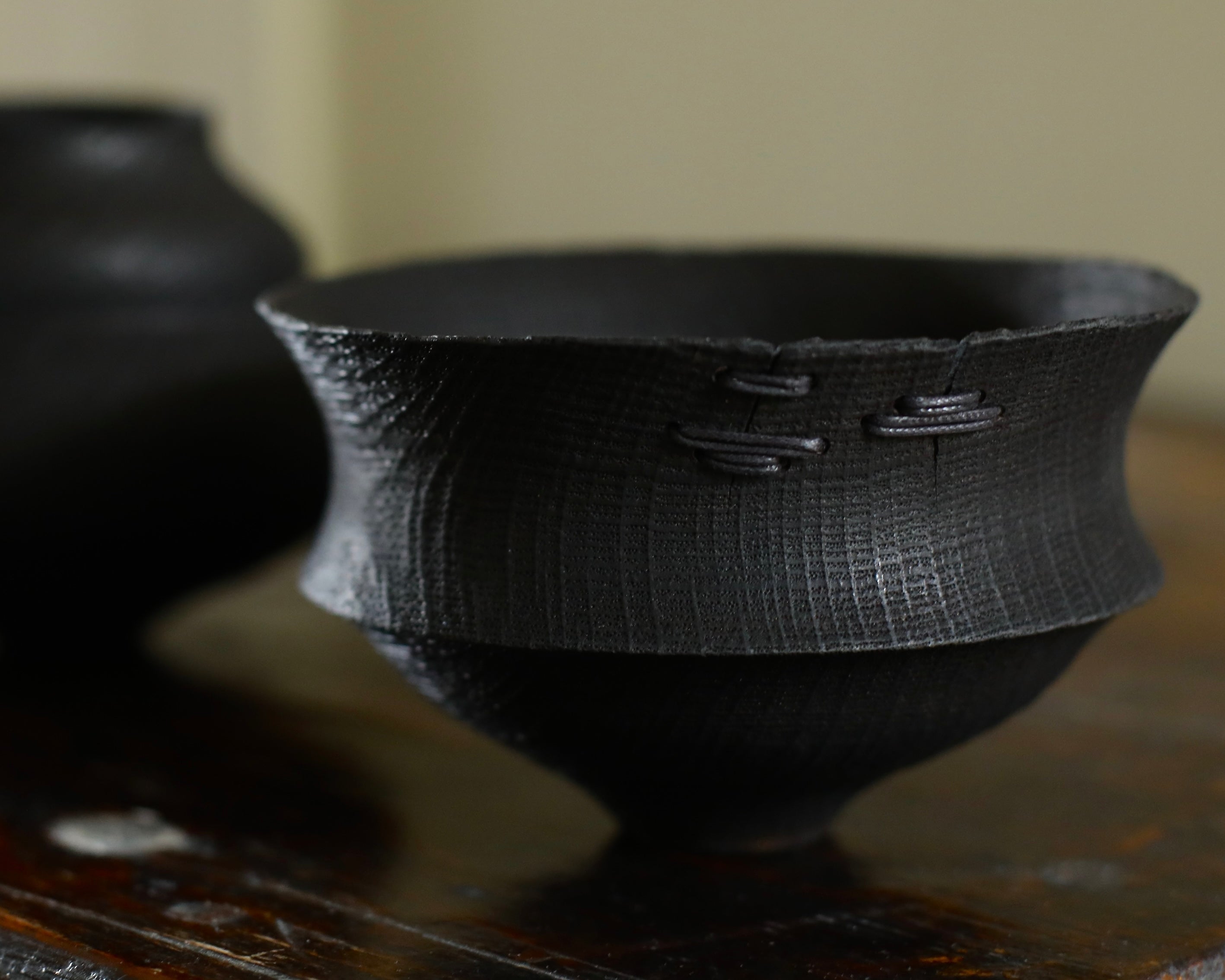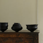 This set of three small sculptural vessels is crafted from scorched oak, each form carrying its own distinctive silhouette, one softly undulating, one rounded and organic, and one flared like a chalice. The blackened surfaces reveal the grain of the wood while bearing visible stitches, subtle scars that speak of repair and resilience. These marks introduce a tension between fragility and strength, damage and healing, giving the pieces an almost ceremonial presence. As a trio, they balance individuality with kinship, evoking objects both ancient and contemporary.