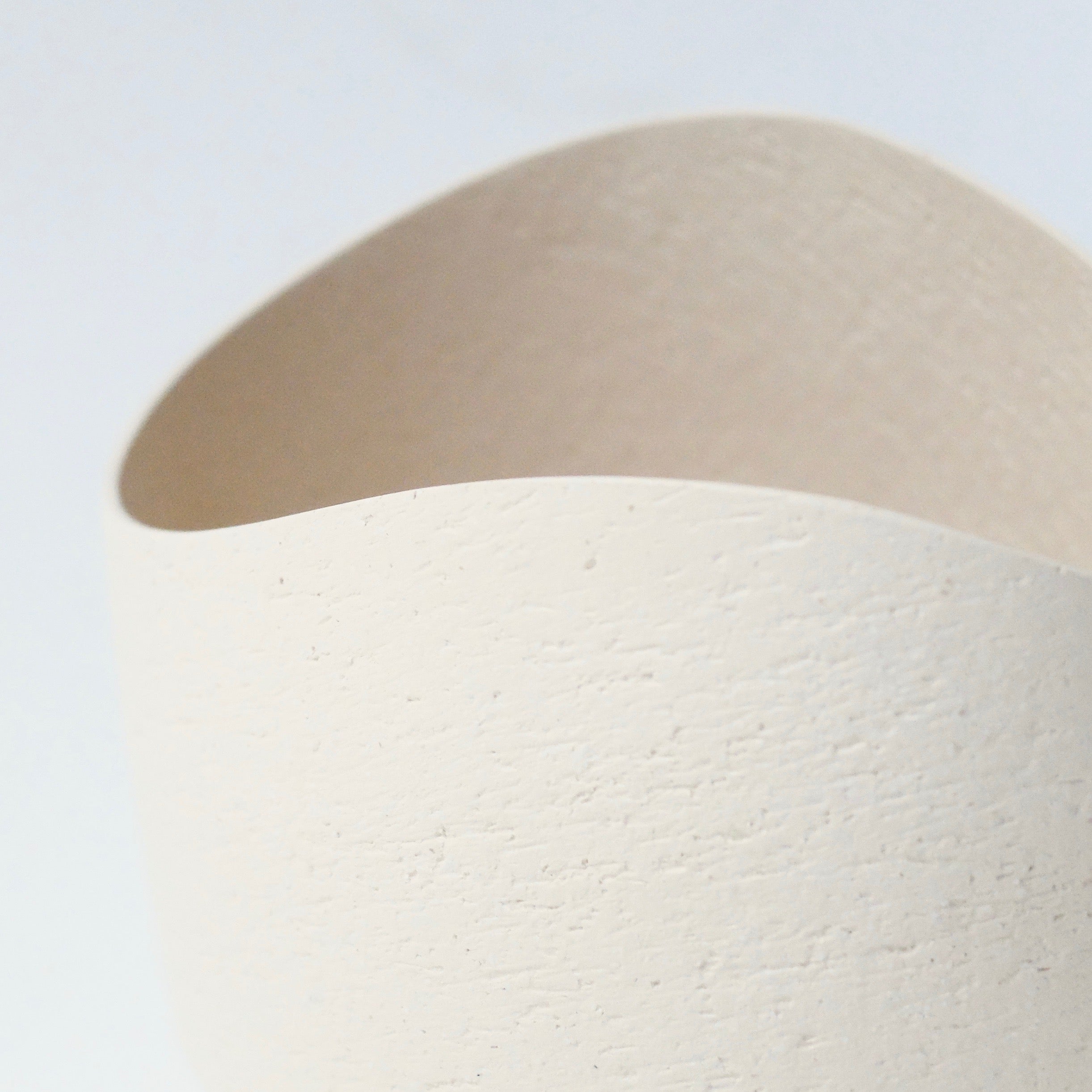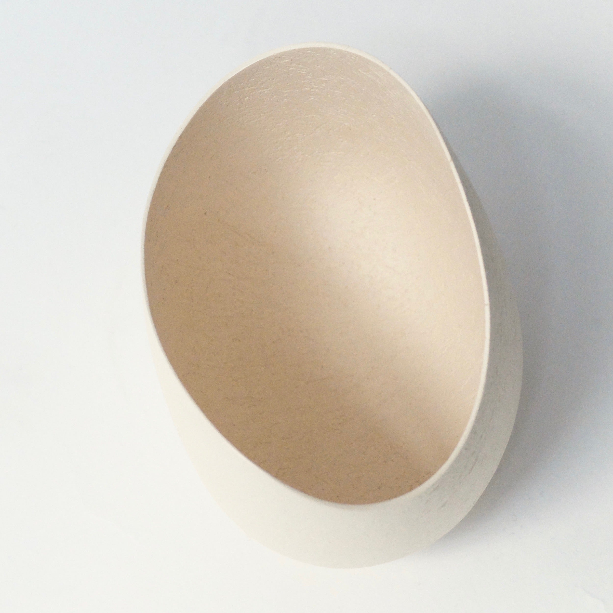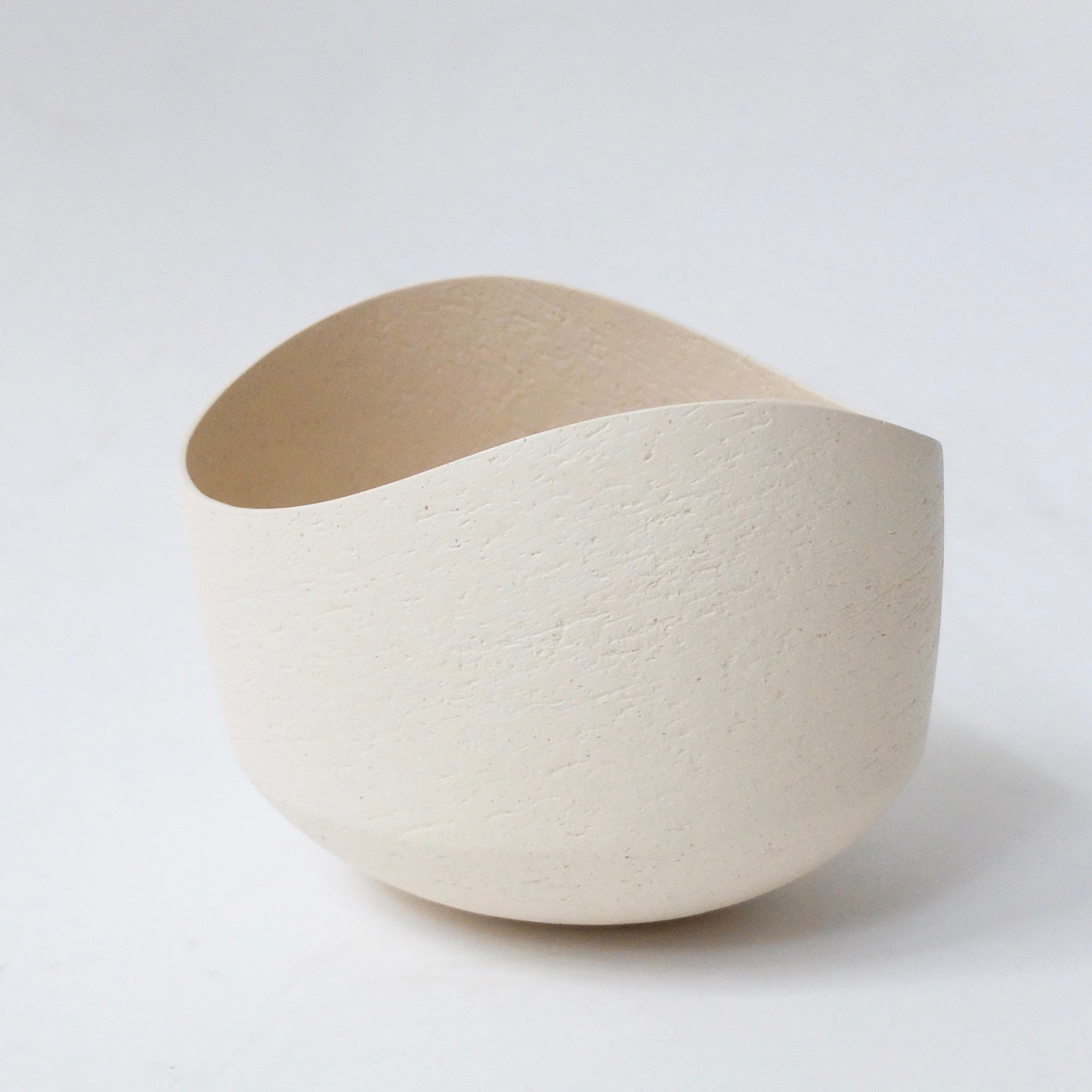 This white bowl is hand made by award winning artist Ashraf Hanna. He is interested in the relationship between line and space and explores this through his contemporary forms. This piece has an elegant and refined body, with an undulating opening. Hanna is interested in scale combinations, and the influence it has on our connection with objects. He uses slabs of clay to create the original shape, which is then followed by using refined slips and stained clays, using a carefully considered colour palette. He uses untraditional tools like the paintbrush to create intriguing textures on the surface exterior, which are distinct to his practice.
