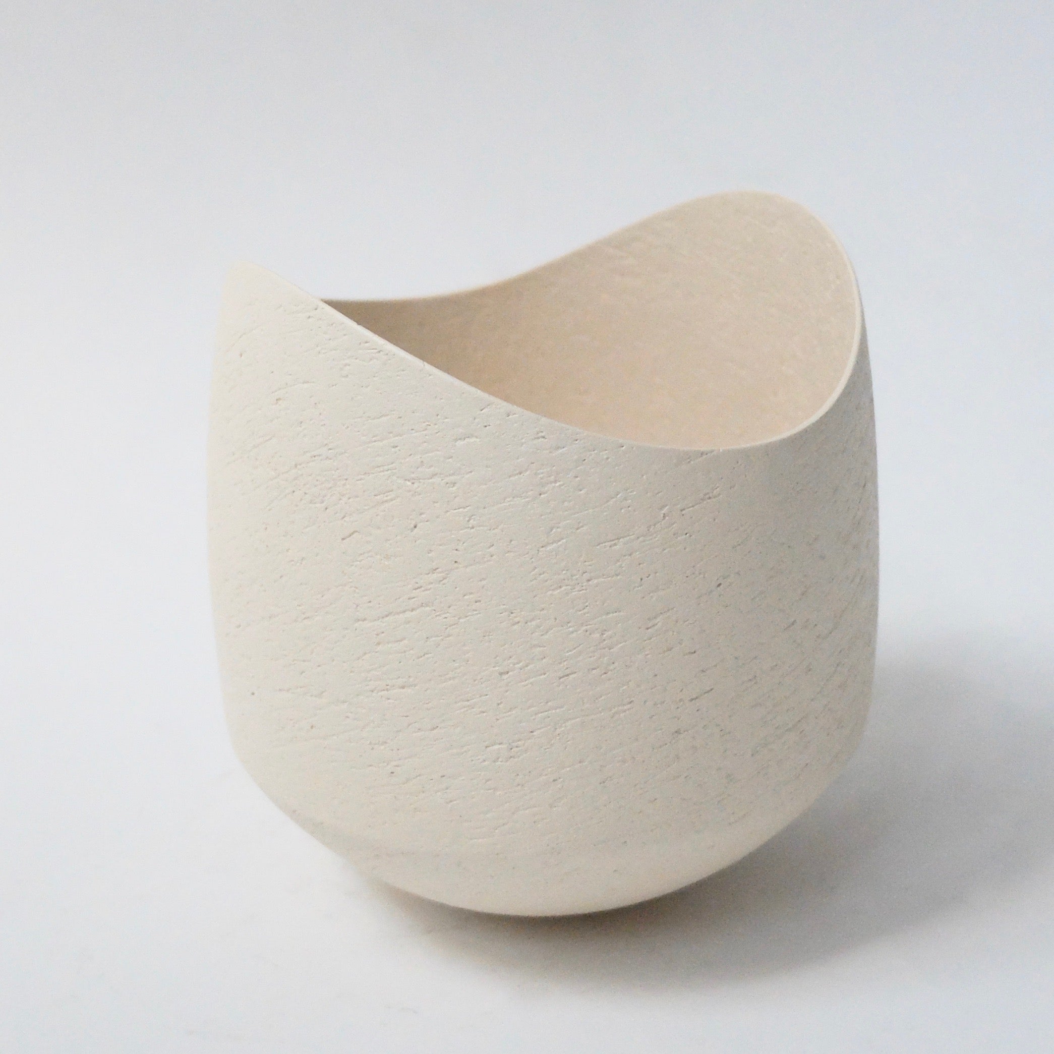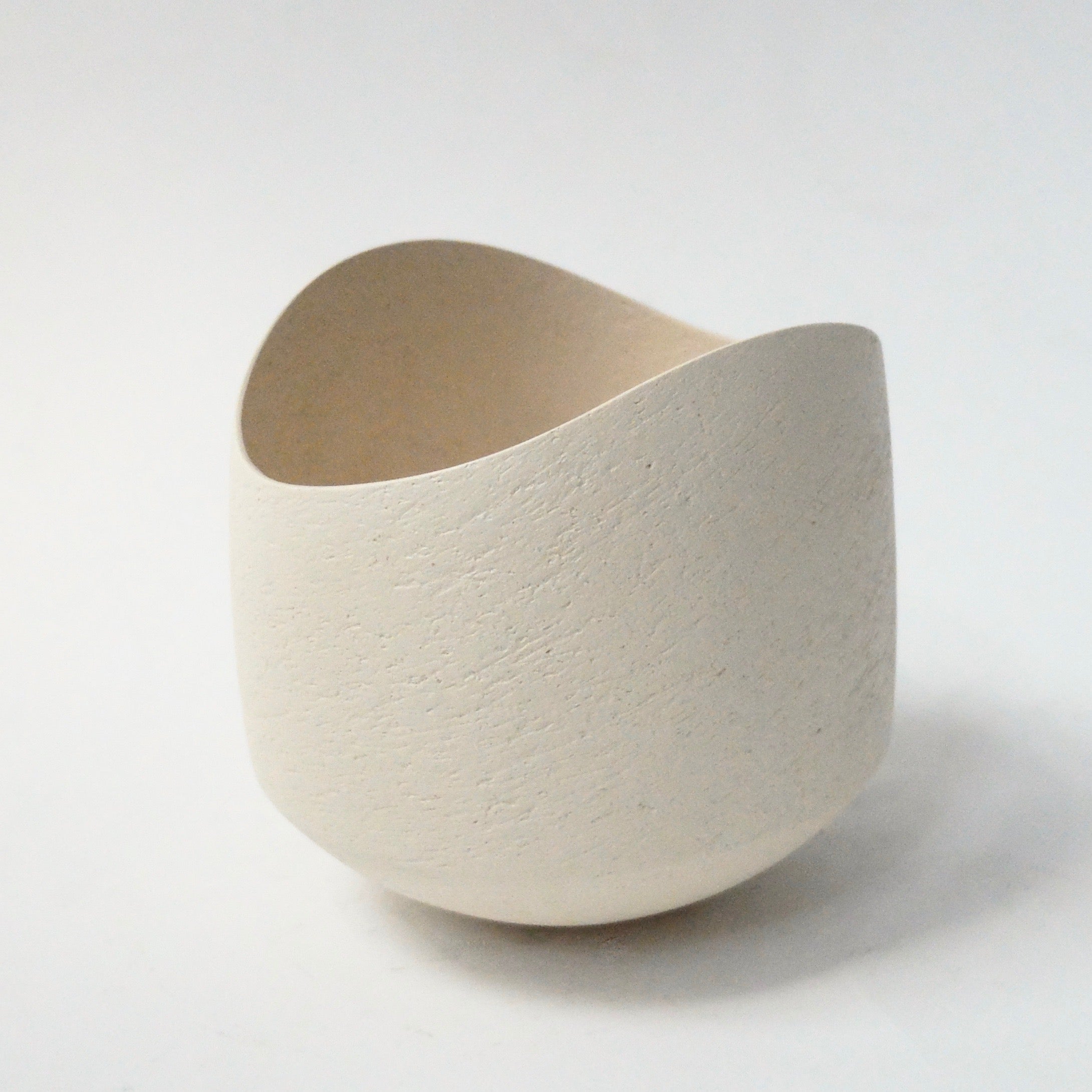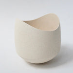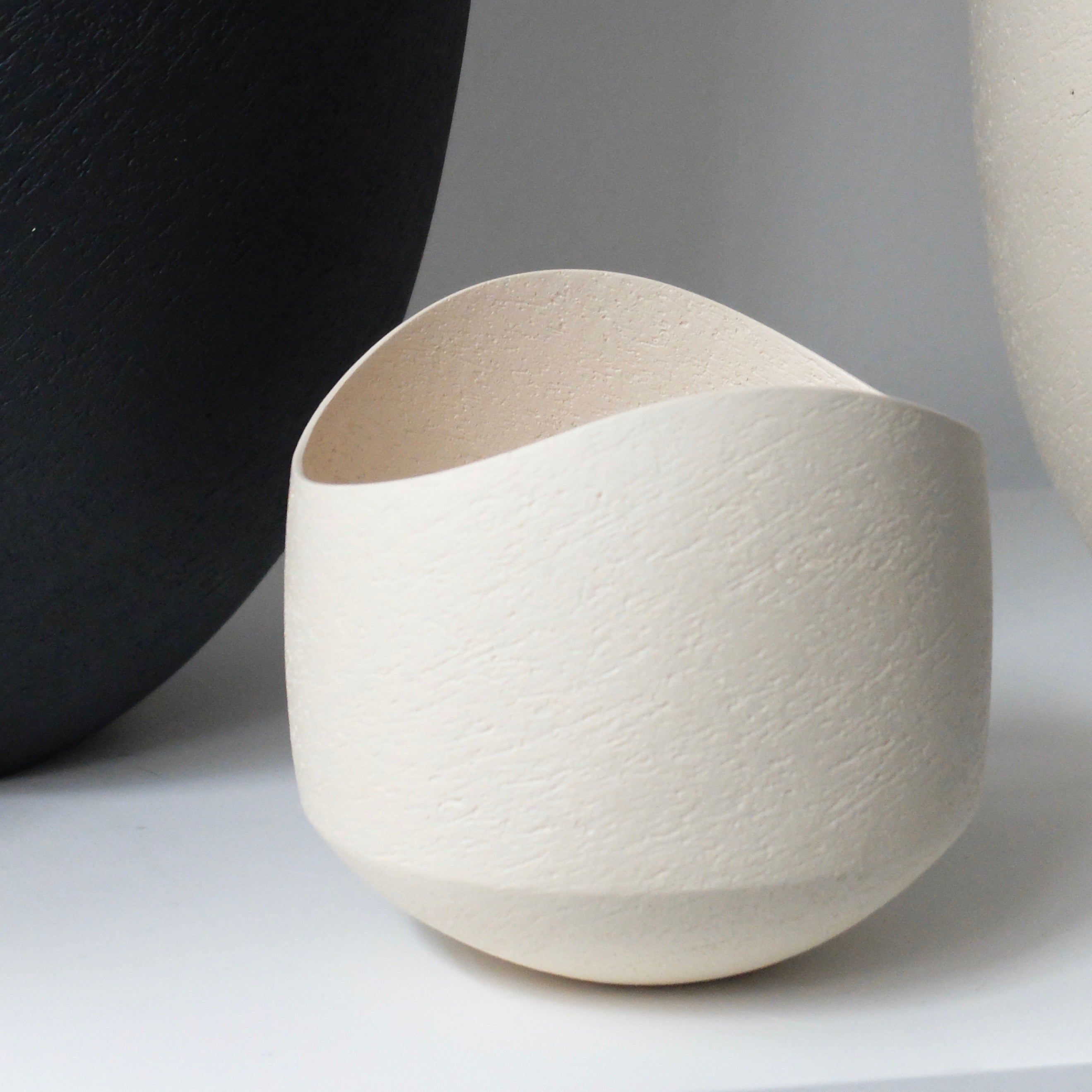 This elegant undulating white bowl is hand made by award winning artist Ashraf Hanna. He is interested in the relationship between line and space and explores this through his contemporary forms. Hanna is interested in scale combinations, and the influence it has on our connection with objects. He uses slabs of clay to create the original shape, which is then followed by using refined slips and stained clays, using a carefully considered colour palette. He uses untraditional tools like the paintbrush to create intriguing textures on the surface exterior, which are distinct to his practice.