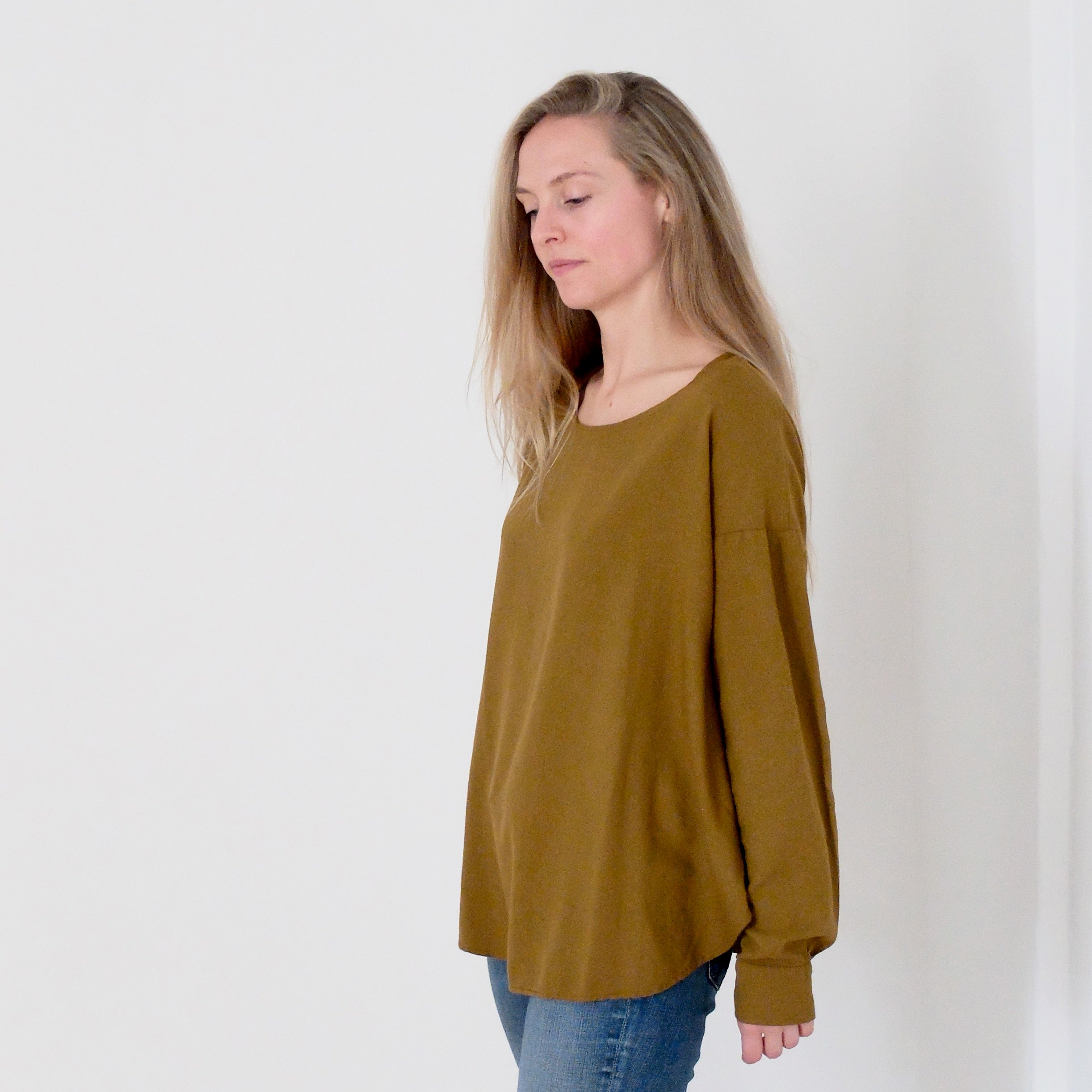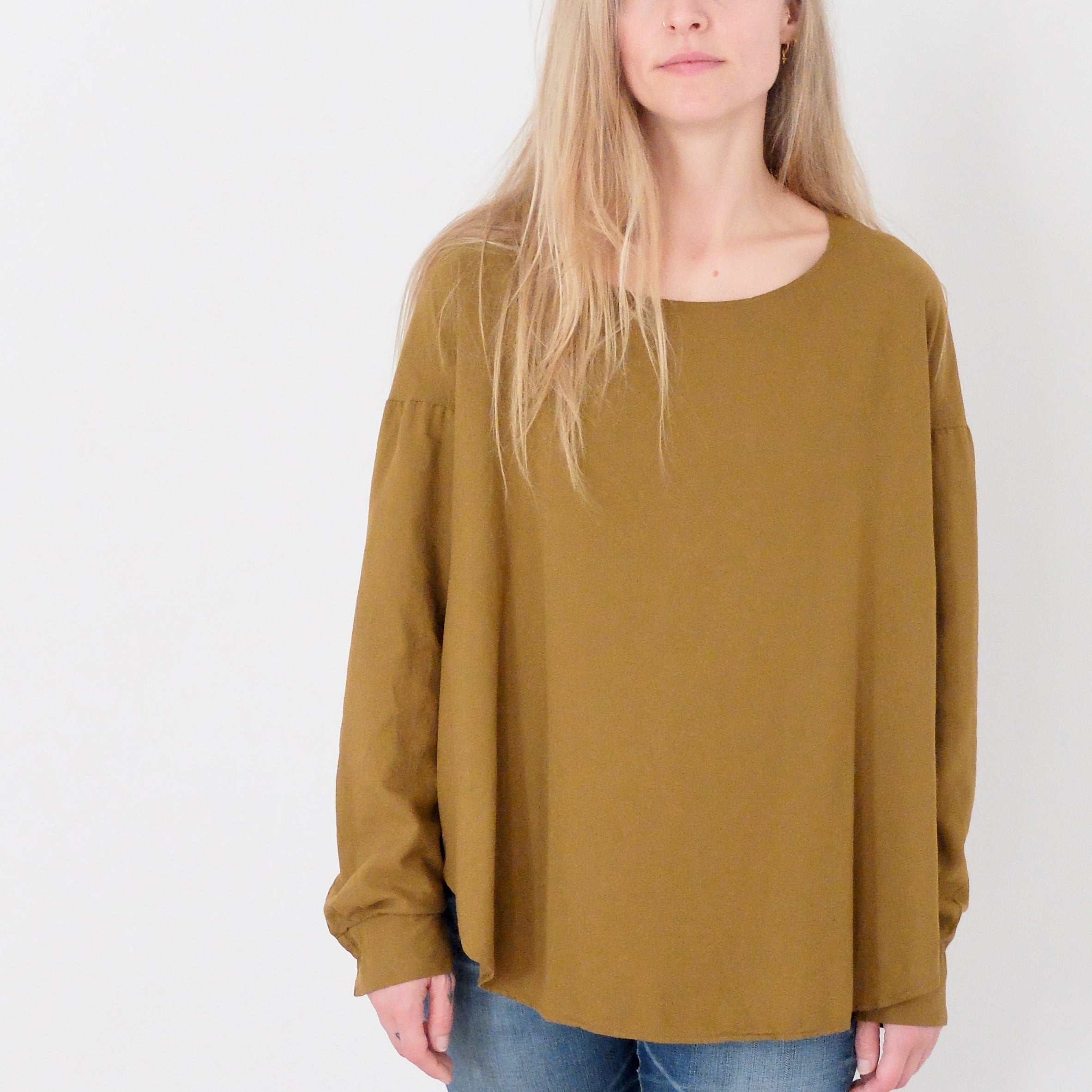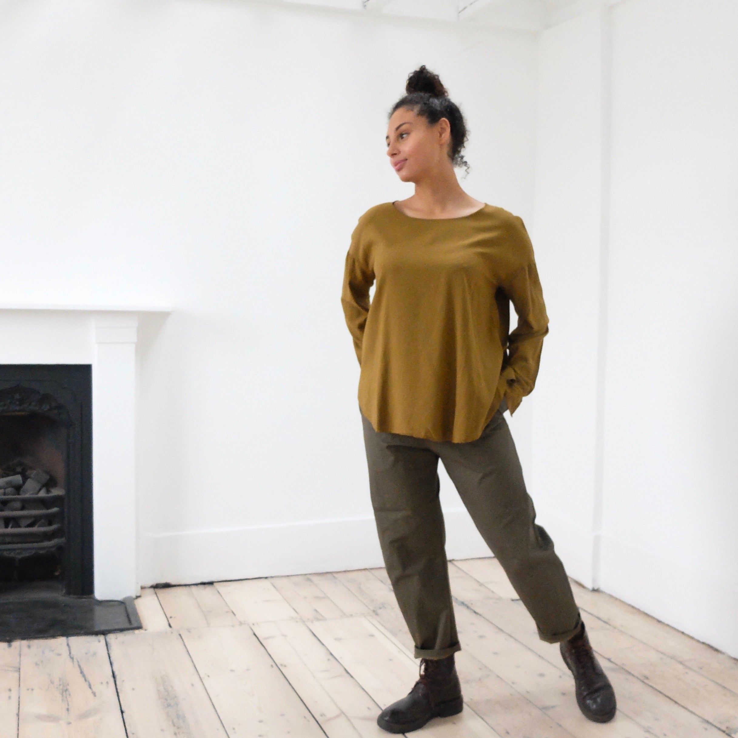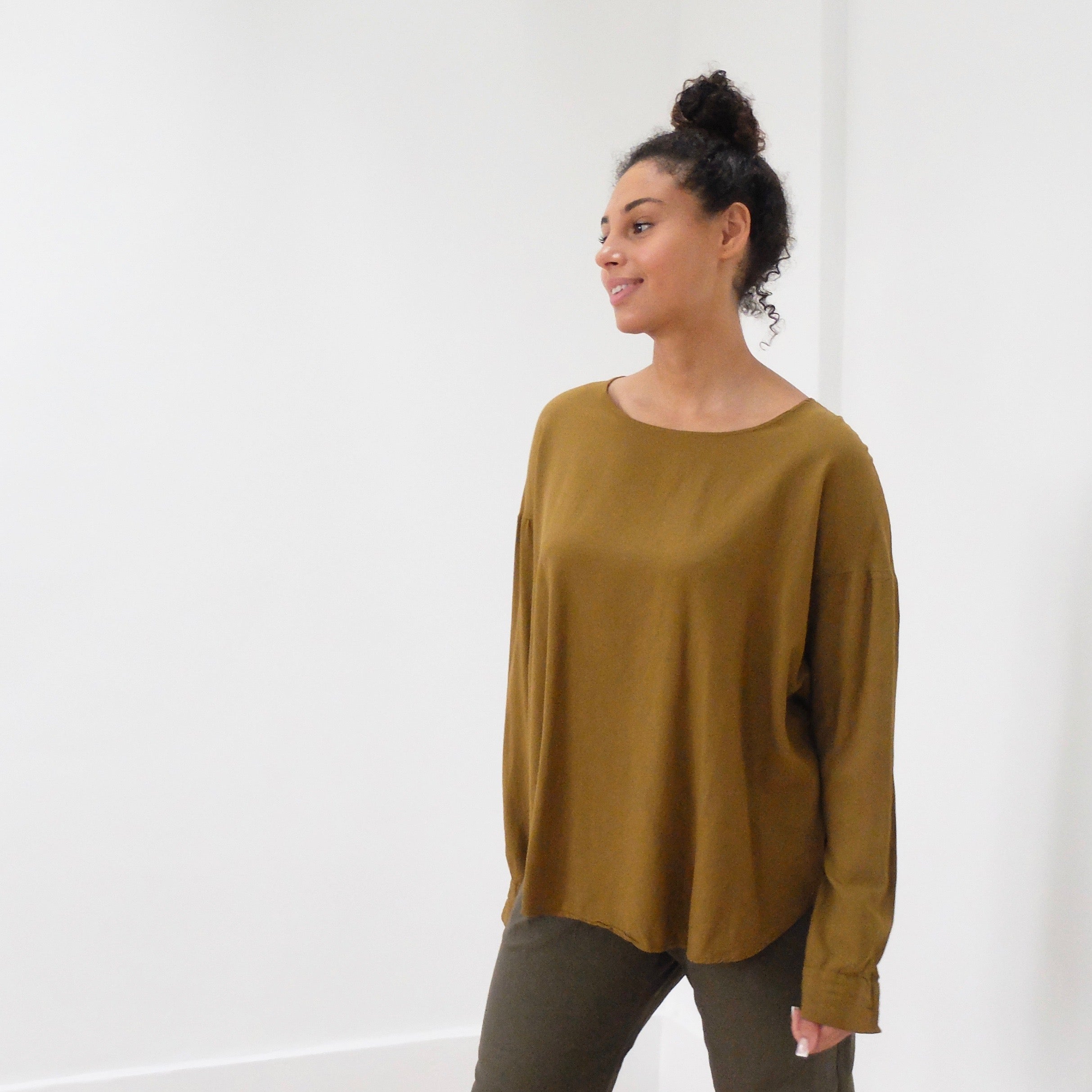 This ochre-coloured scoop neck top made from the finest cotton is extremely soft to touch and drapes beautifully when worn. It features a dropped shoulder and a delicate button up cuff detail that really adds to the charm of the garment. This item is ideal for layering up and can be paired with any trouser or skirt.