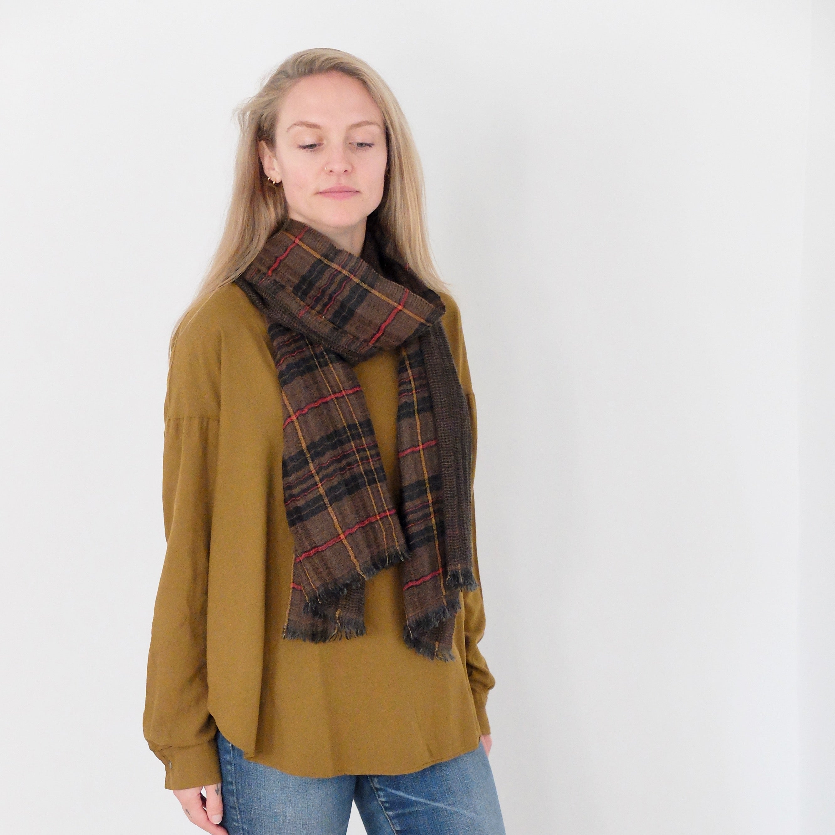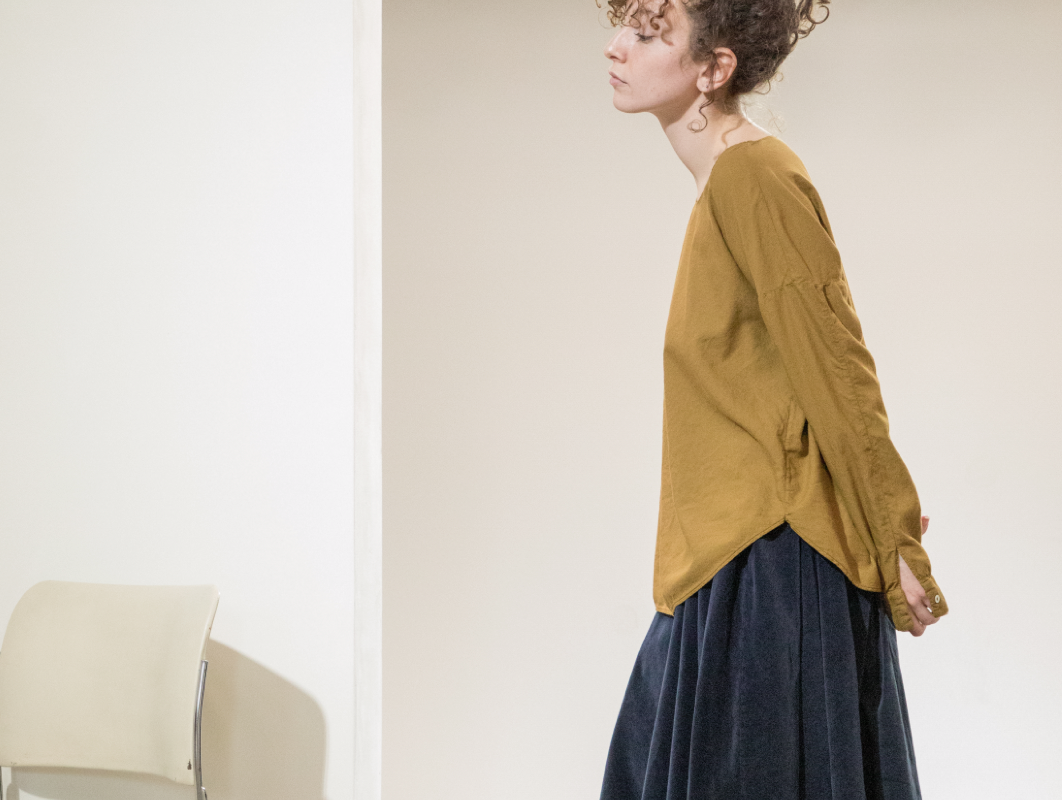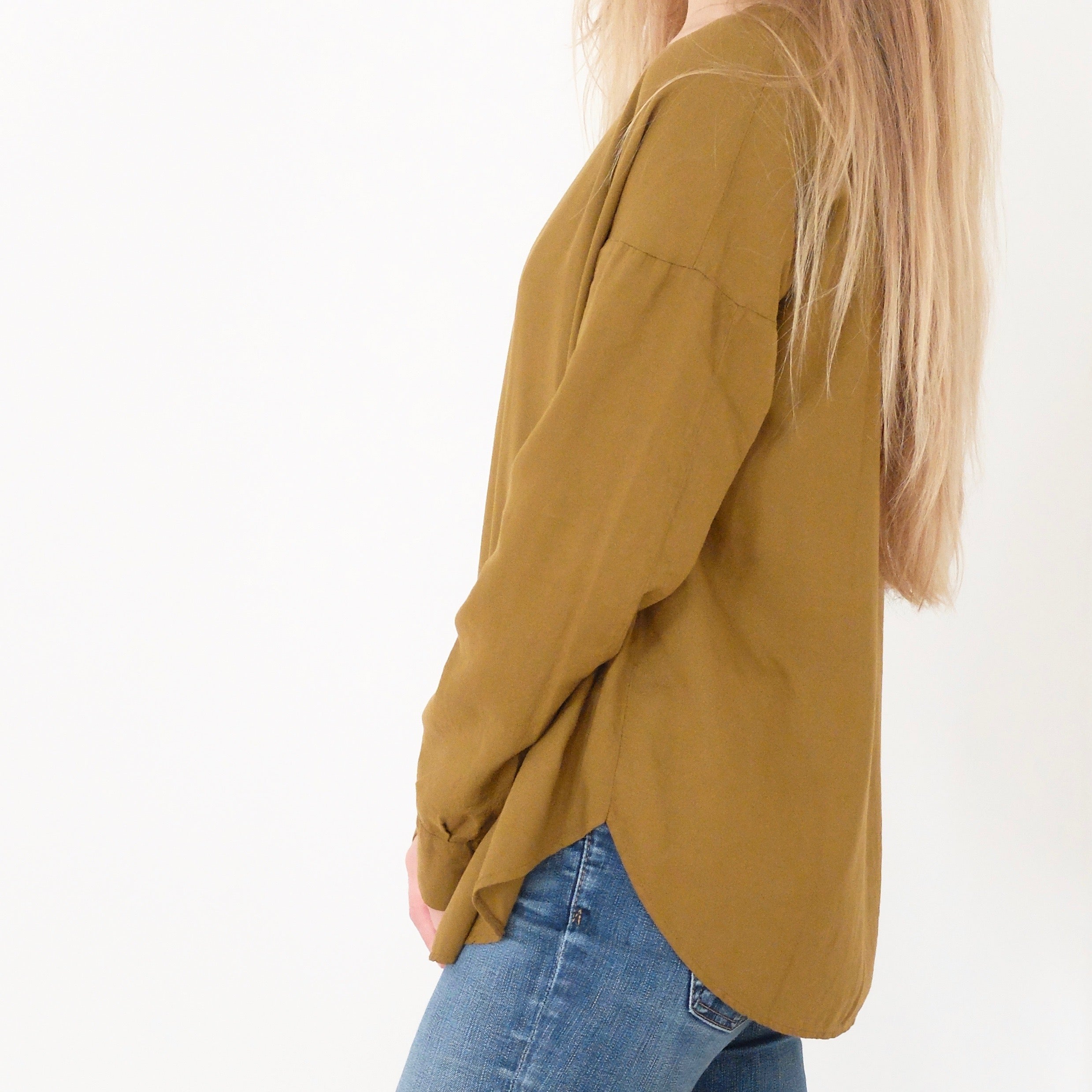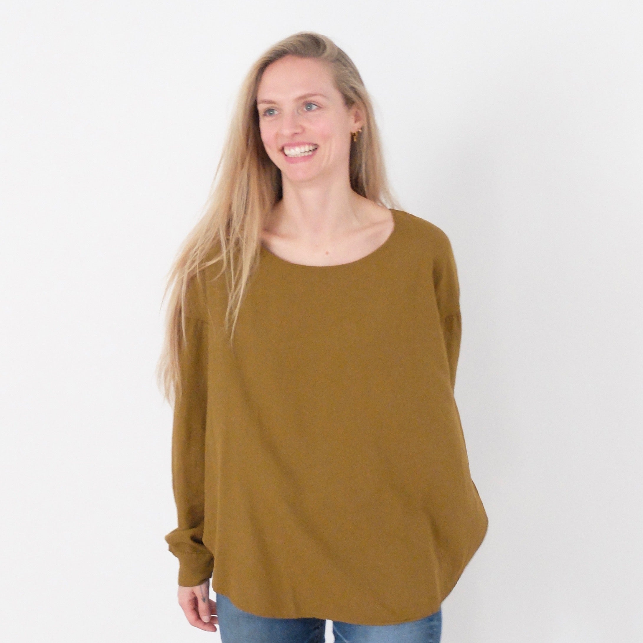 This ochre-coloured scoop neck top made from the finest cotton is extremely soft to touch and drapes beautifully when worn. It features a dropped shoulder and a delicate button up cuff detail that really adds to the charm of the garment. This item is ideal for layering up and can be paired with any trouser or skirt.