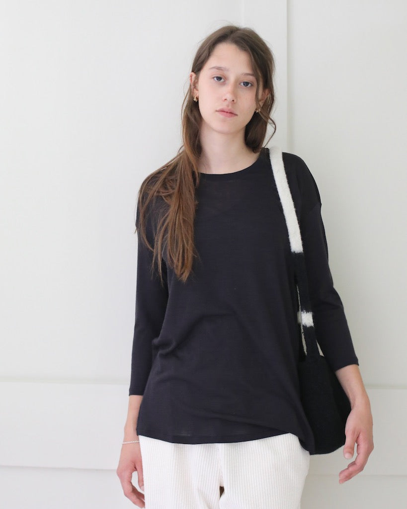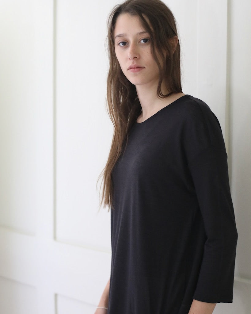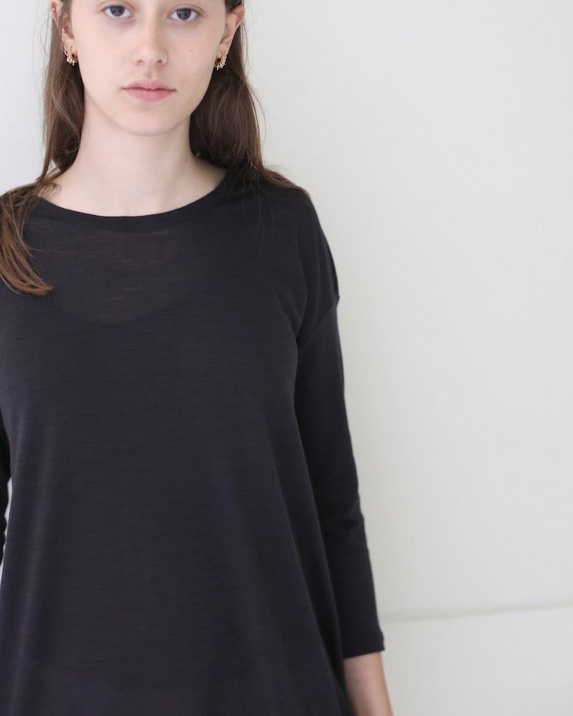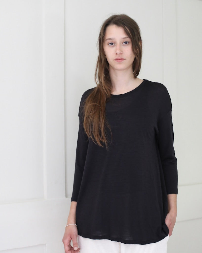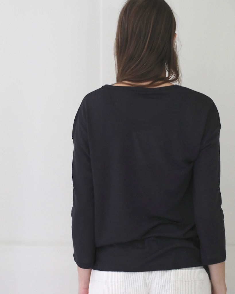 This lightweight jersey top has a relaxed fit, with a flattering silhouette. The garment features dropped shoulders and long sleeves. The breathable fabric gives it softness and the timeless design means that it is perfect for layering and easy to pair with both skirts and trousers.