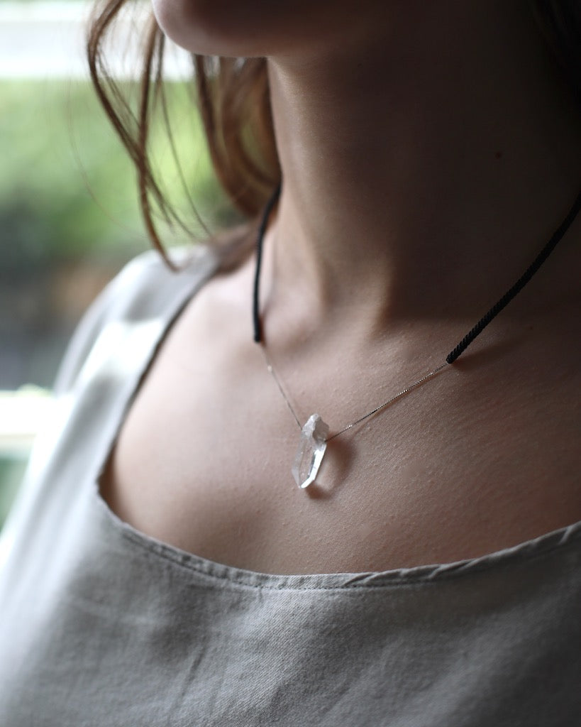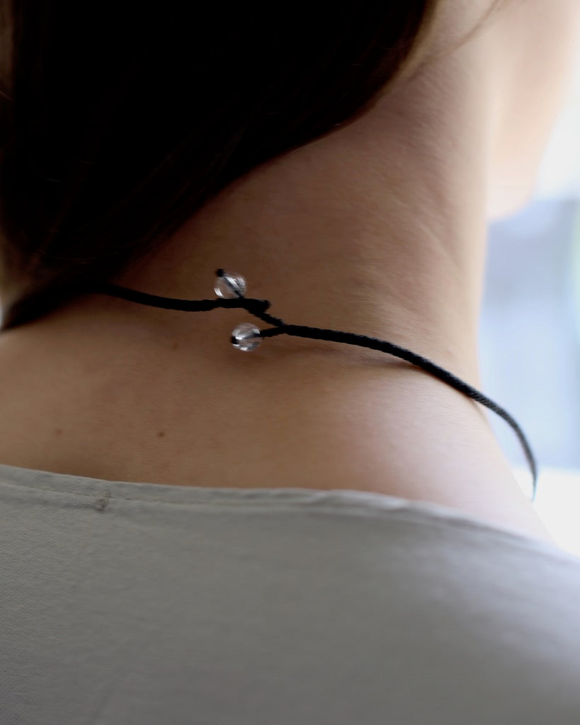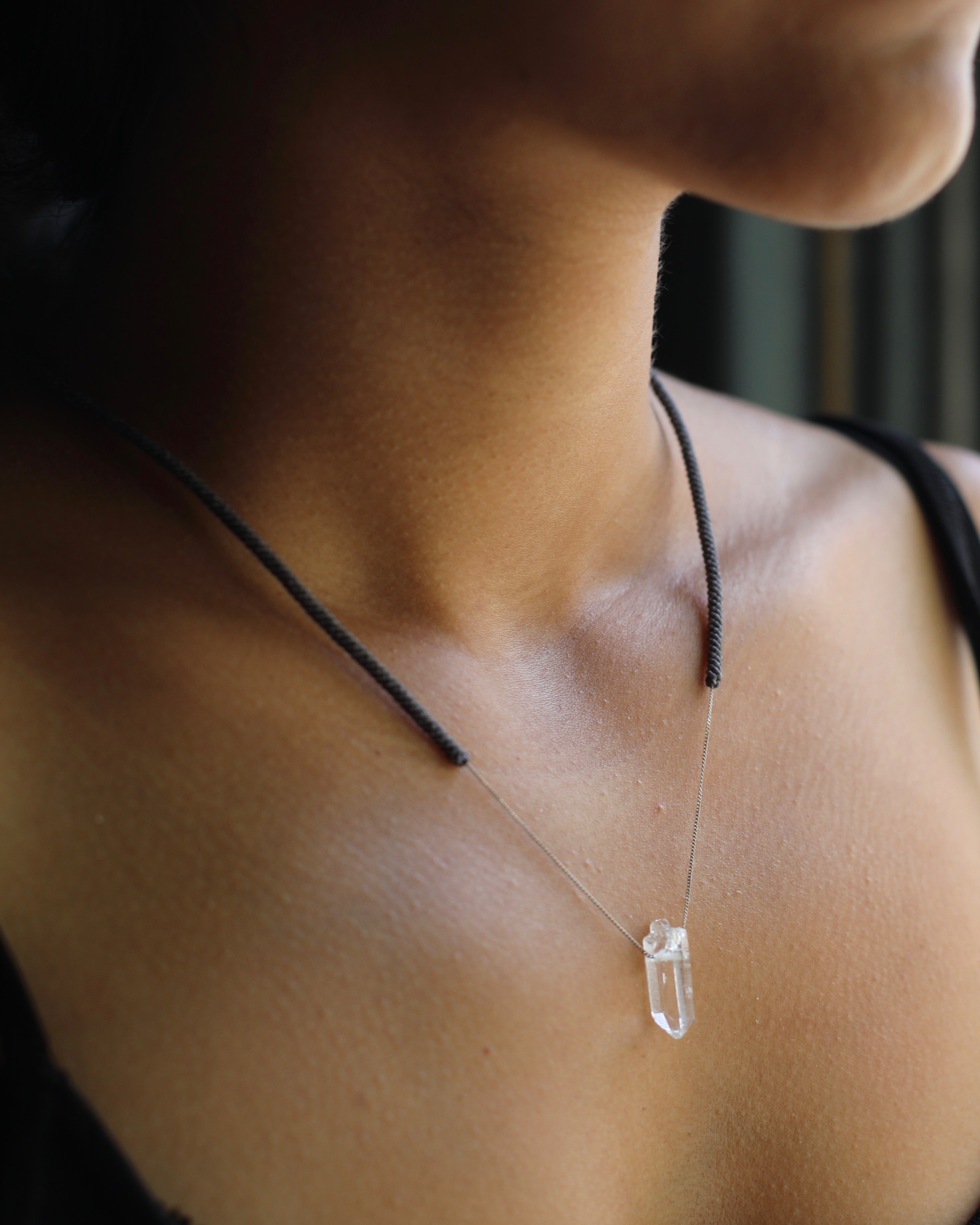 A striking, piece boasting harmonious balance, this necklace has an elegantly curved structure formed by a charcoal grey macrame, connected by beautifully delicate white gold chain. The contrasts in the necklace are brought together by the bold form and soft tone of a large quartz pendant, an intriguing piece that unites both clean cut angles and raw, natural edges. A loop with two beads form a clasp that is a delicate and beautiful feature in itself.
