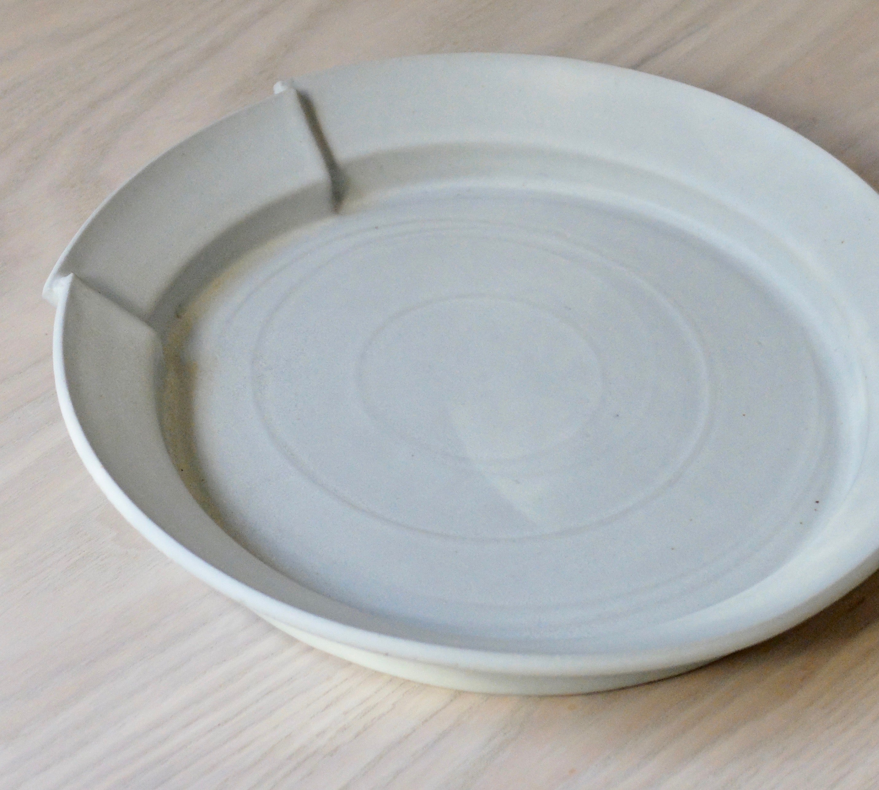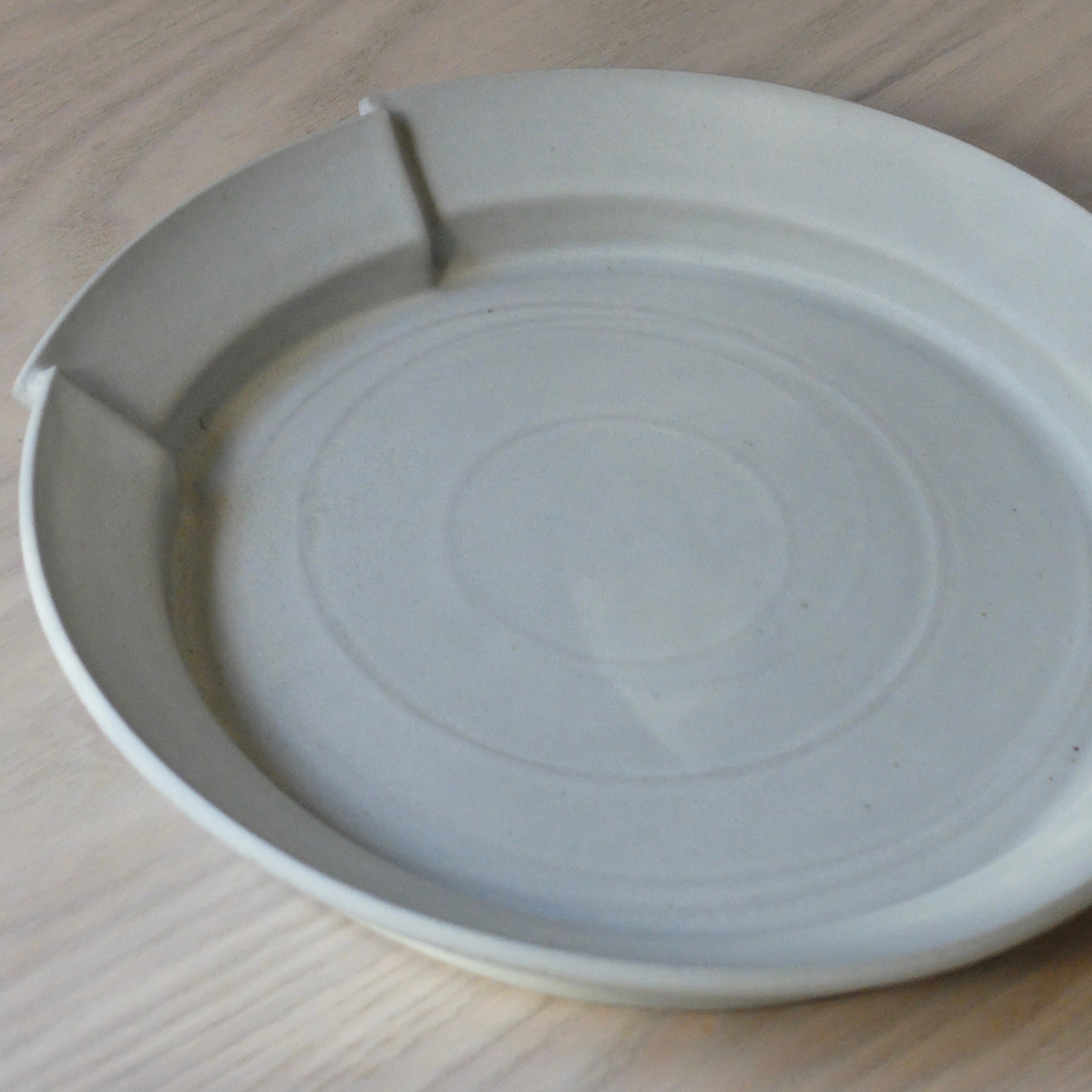 Description: This unique asymmetric plate exhibits a cool grey glaze and softly raised ridges; emphasising the contrasted fluidity and sharpness of form, reinforcing its decisively notched rim, carved edges and organic curvature. Masterfully crafted by artist Carina Ciscato, through this work the beholder is encouraged to discover a hidden beauty beyond function and predictability, as the artist questions space and volume, function and purpose, balance and fragility, in search of a purer aesthetic that allows for new observations and ways of seeing and perceiving, rendering the object redefined and reinvented.