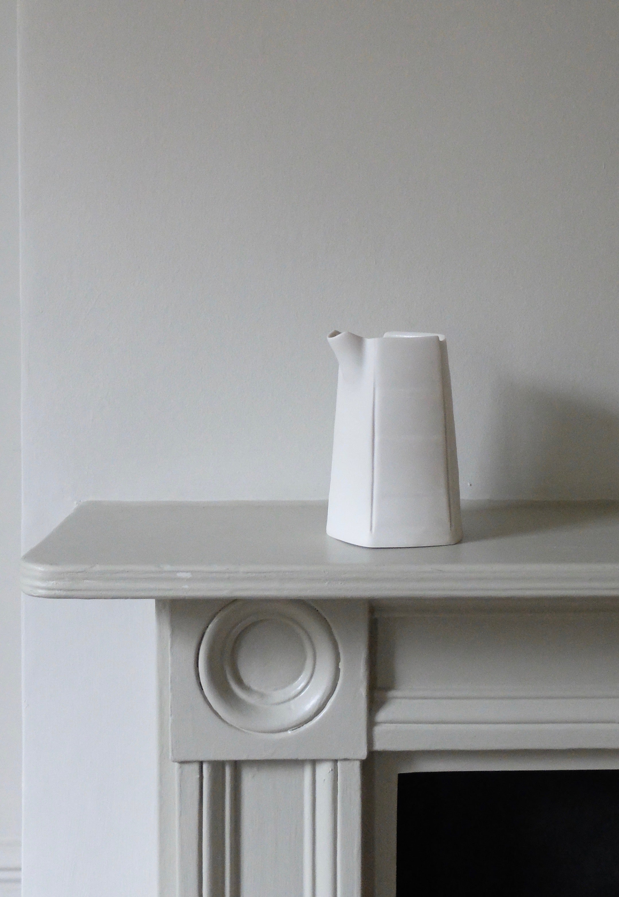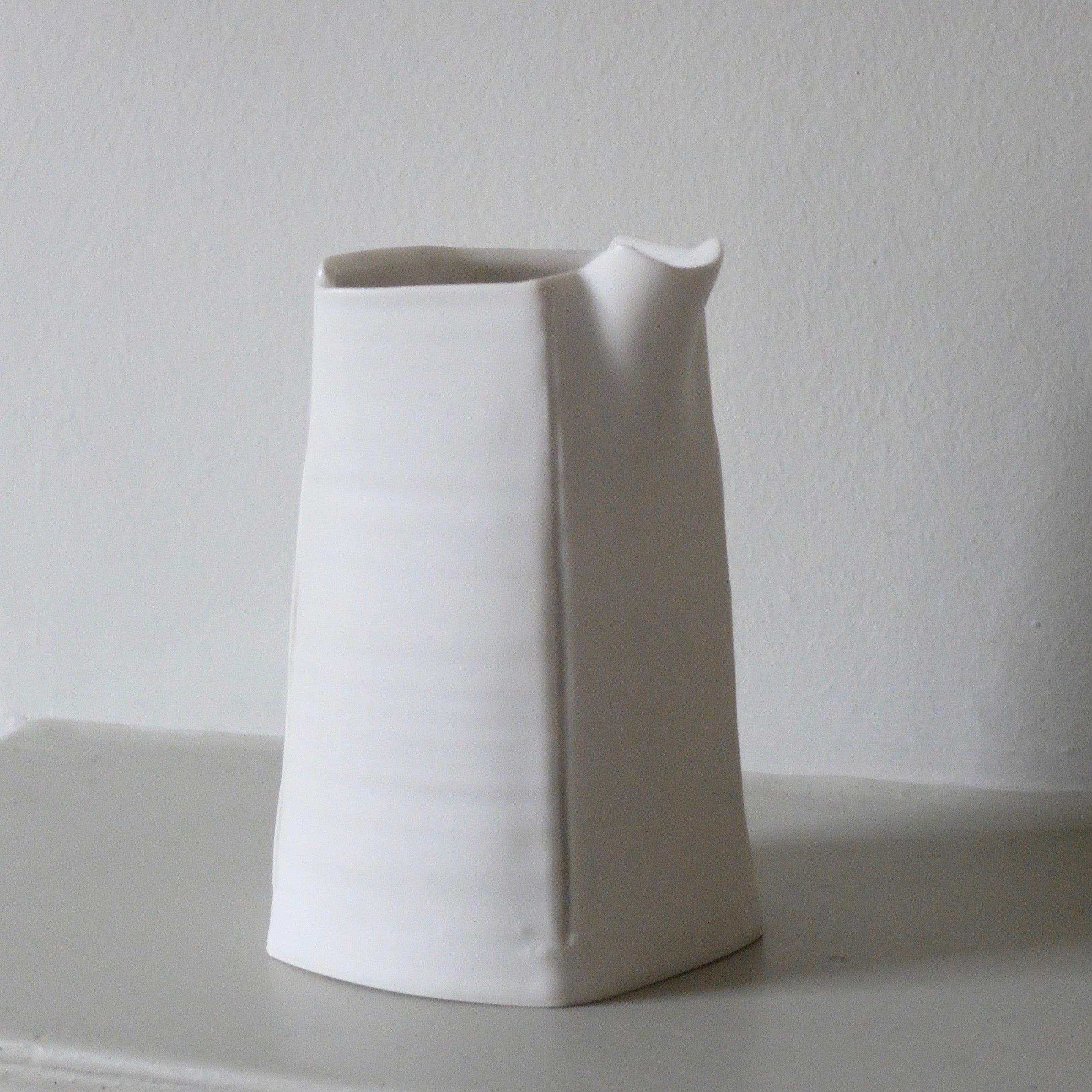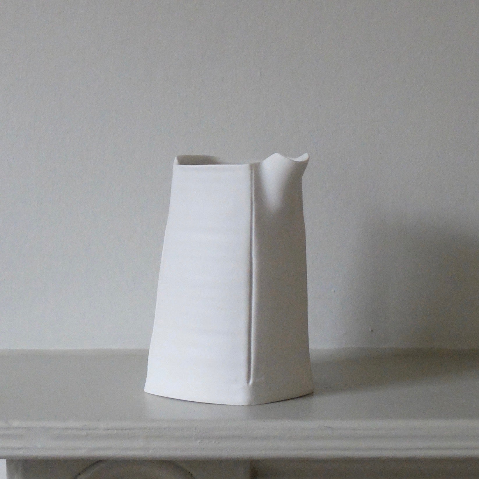 This elegant constructed jug exhibits a cool matte glaze; emphasising the contrasted fluidity and sharpness of the form, reinforcing its carved edges, cuts and organic curvature. Masterfully crafted by artist Carina Ciscato, through this work the beholder is encouraged to discover a hidden beauty beyond function and predictability, as the artist questions space and volume, function and purpose, balance and fragility, in search of a purer aesthetic that allows for new observations and ways of seeing and perceiving, rendering the object redefined and reinvented.