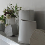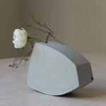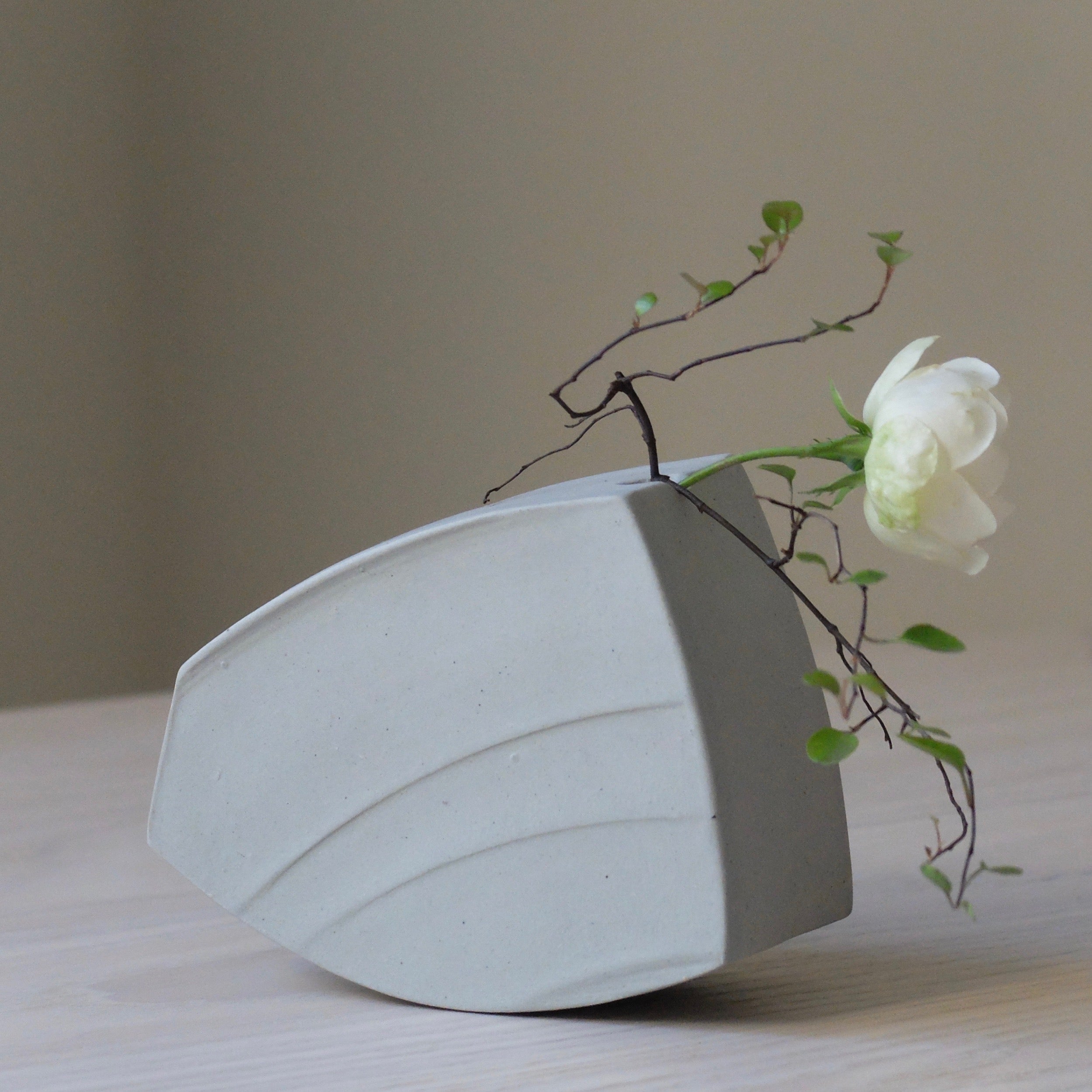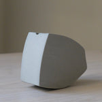 This wonderful constructed ingot, intended as a bud vase, exhibits a quiet simplicity from its pale cement grey glaze; emphasising the contrasted fluidity and sharpness of its forms, reinforcing its carved edges, cuts and organic curvature. Masterfully crafted by artist Carina Ciscato, through this work the beholder is encouraged to discover a hidden beauty beyond function and predictability, as the artist questions space and volume, function and purpose, balance and fragility, in search of a purer aesthetic that allows for new observations and ways of seeing and perceiving, rendering the object redefined and reinvented.
