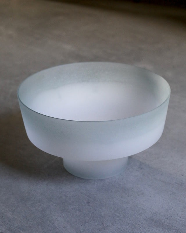 Much like water’s natural ability to transition from sharp currents to smooth ripples, this work merges the contrasting elements of sharp, yet gracefully smooth curves. Its opening, wide and circular, stands strongly upon a smaller stem reminiscent of the depths of an ocean, though in a small and modest scale. Glass raindrops are suspended within the body, while the dimensions and unique form mirror the subtle variability found in water’s form.