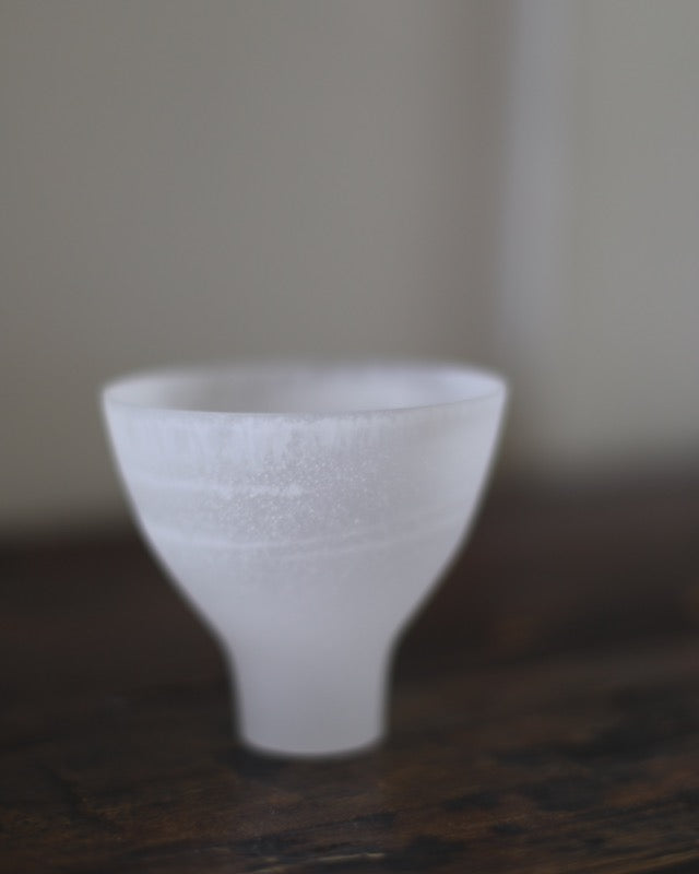 The ‘Water Vessel in Clear Mist’ by Celia Dowson is a captivating reflection of the fluid grace of water, seamlessly intertwining with the artistry and craftsmanship of glass. Like the serene flow of a tranquil stream, its misty hue exudes a calming presence, inviting a gentle touch to trace its frosted surface.