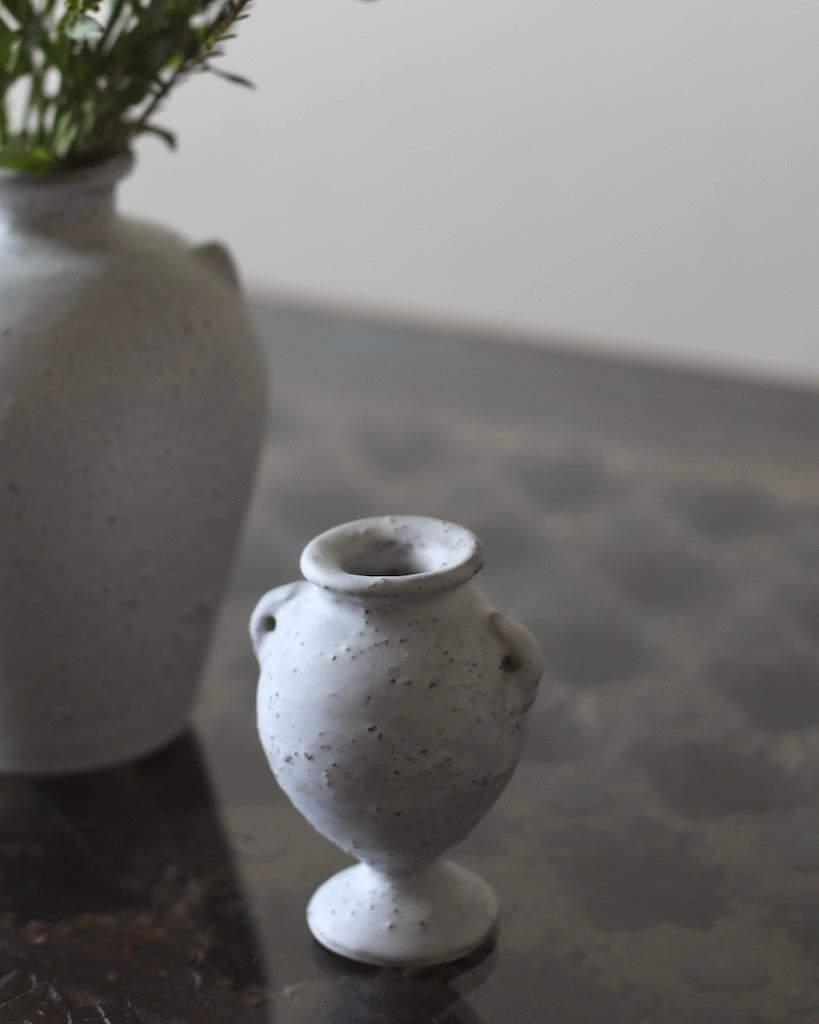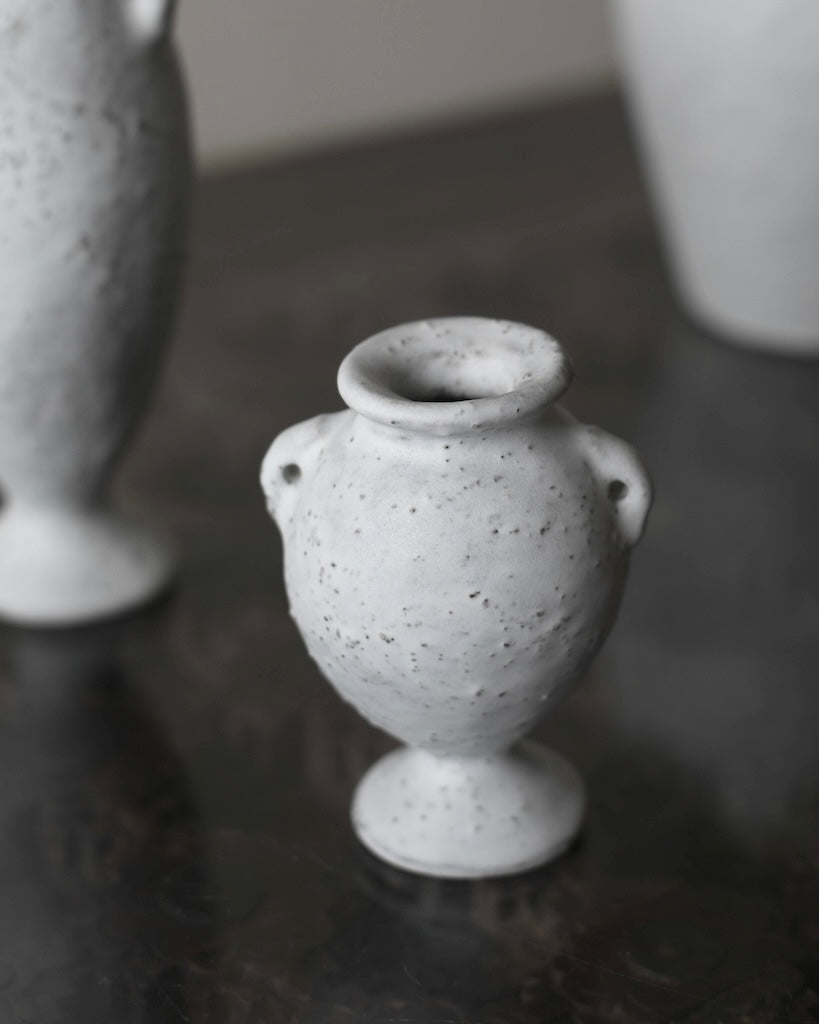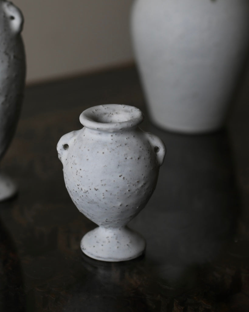 McLeish’s collection of stoneware vessels is hand-built using pinching and coiling, allowing each form to develop slowly and intuitively. Forms are layered with slips, washes, and glazes, some made from materials collected during her walks, creating a variety of surfaces from smooth, pebble-like whites to intricate crackles and deeply textured blacks. The forms range from elegant columnar vases to shorter, amphora-like silhouettes, featuring gentle asymmetries, decorative lugs and subtle shifts in proportion. These quiet irregularities give each piece warmth, movement, and a distinctly handmade presence.