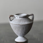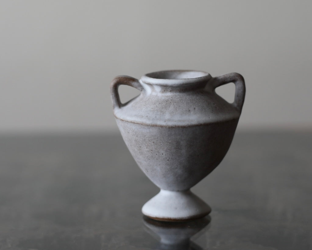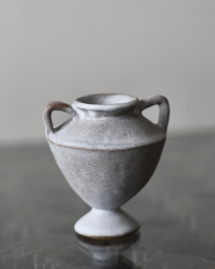 McLeish’s collection of stoneware vessels is hand-built using pinching and coiling, allowing each form to develop slowly and intuitively. Forms are layered with slips, washes, and glazes, some made from materials collected during her walks, creating a variety of surfaces from smooth, pebble-like whites to intricate crackles and deeply textured blacks. The forms range from elegant columnar vases to shorter, amphora-like silhouettes, featuring gentle asymmetries, decorative lugs and subtle shifts in proportion. These quiet irregularities give each piece warmth, movement, and a distinctly handmade presence.