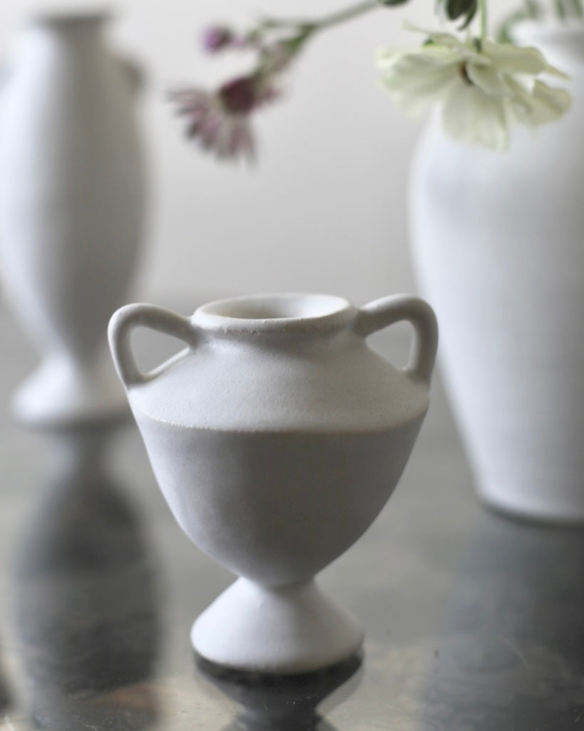 McLeish’s collection of stoneware vessels is hand-built using pinching and coiling, allowing each form to develop slowly and intuitively. Forms are layered with slips, washes, and glazes, some made from materials collected during her walks, creating a variety of surfaces from smooth, pebble-like whites to intricate crackles and deeply textured blacks. The forms range from elegant columnar vases to shorter, amphora-like silhouettes, featuring gentle asymmetries, decorative lugs and subtle shifts in proportion. These quiet irregularities give each piece warmth, movement, and a distinctly handmade presence.