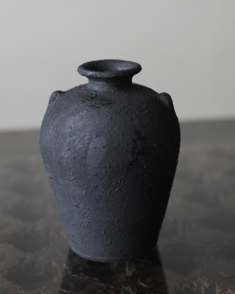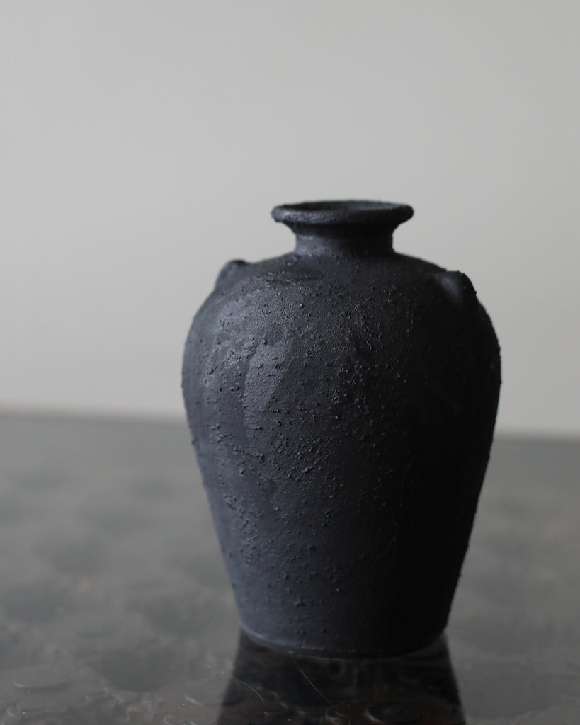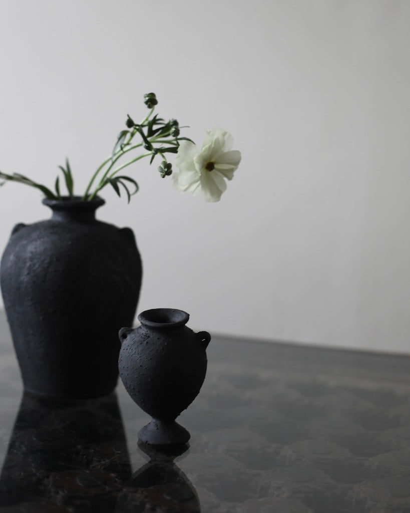 McLeish’s collection of stoneware vessels is hand-built using pinching and coiling, allowing each form to develop slowly and intuitively. Forms are layered with slips, washes, and glazes, some made from materials collected during her walks, creating a variety of surfaces from smooth, pebble-like whites to intricate crackles and deeply textured blacks. The forms range from elegant columnar vases to shorter, amphora-like silhouettes, featuring gentle asymmetries, decorative lugs and subtle shifts in proportion. These quiet irregularities give each piece warmth, movement, and a distinctly handmade presence.