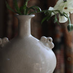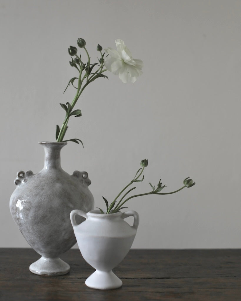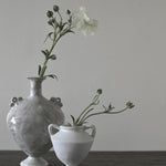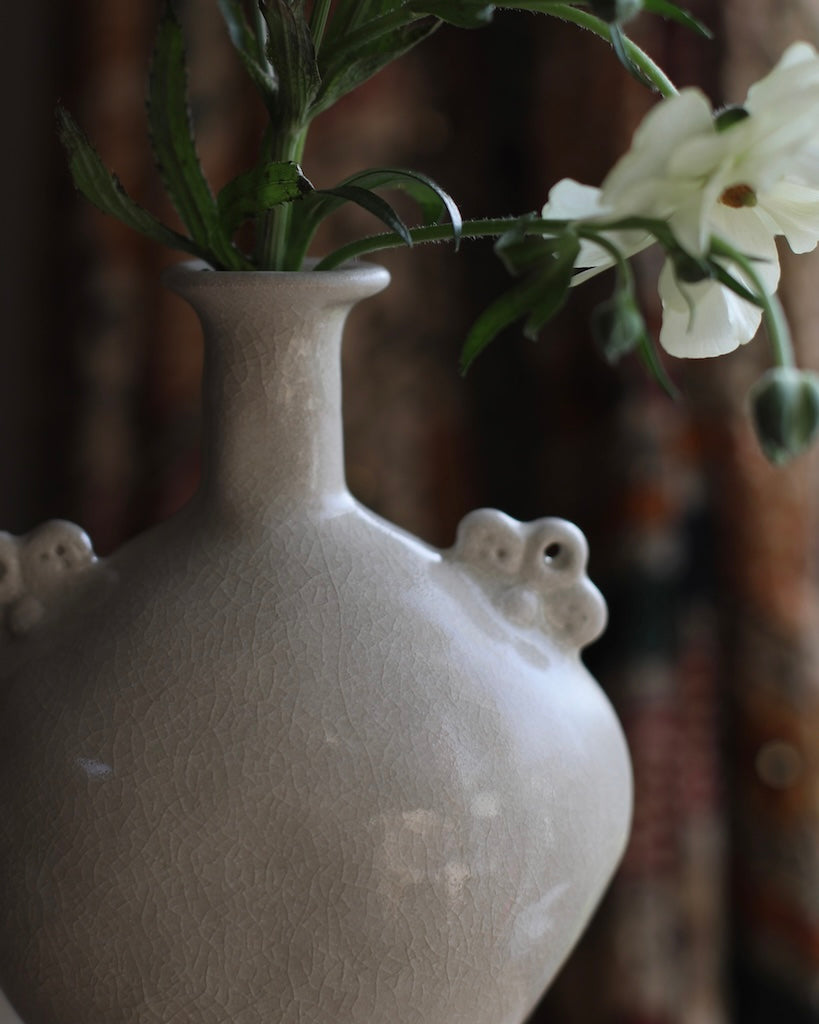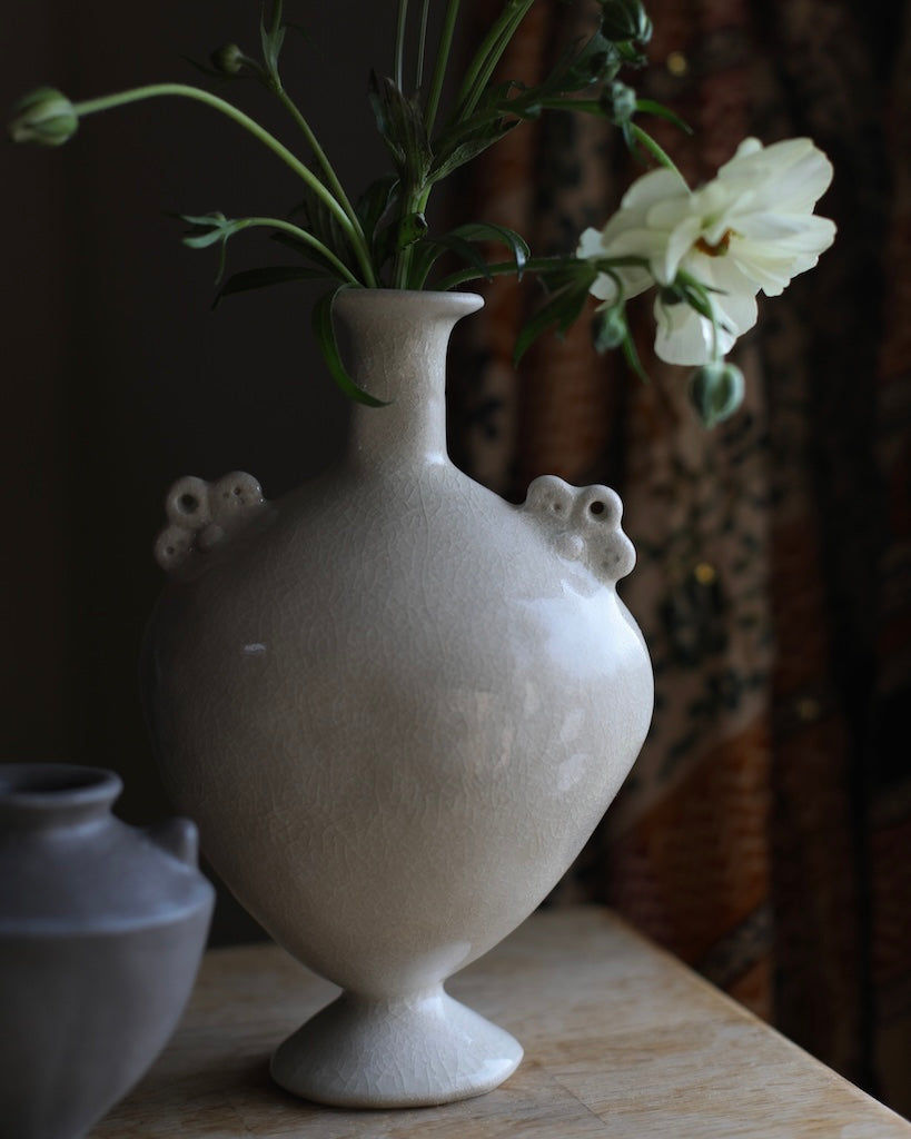 McLeish’s collection of stoneware vessels is hand-built using pinching and coiling, allowing each form to develop slowly and intuitively. Forms are layered with slips, washes, and glazes, some made from materials collected during her walks, creating a variety of surfaces from smooth, pebble-like whites to intricate crackles and deeply textured blacks. The forms range from elegant columnar vases to shorter, amphora-like silhouettes, featuring gentle asymmetries, decorative lugs and subtle shifts in proportion. These quiet irregularities give each piece warmth, movement, and a distinctly handmade presence.