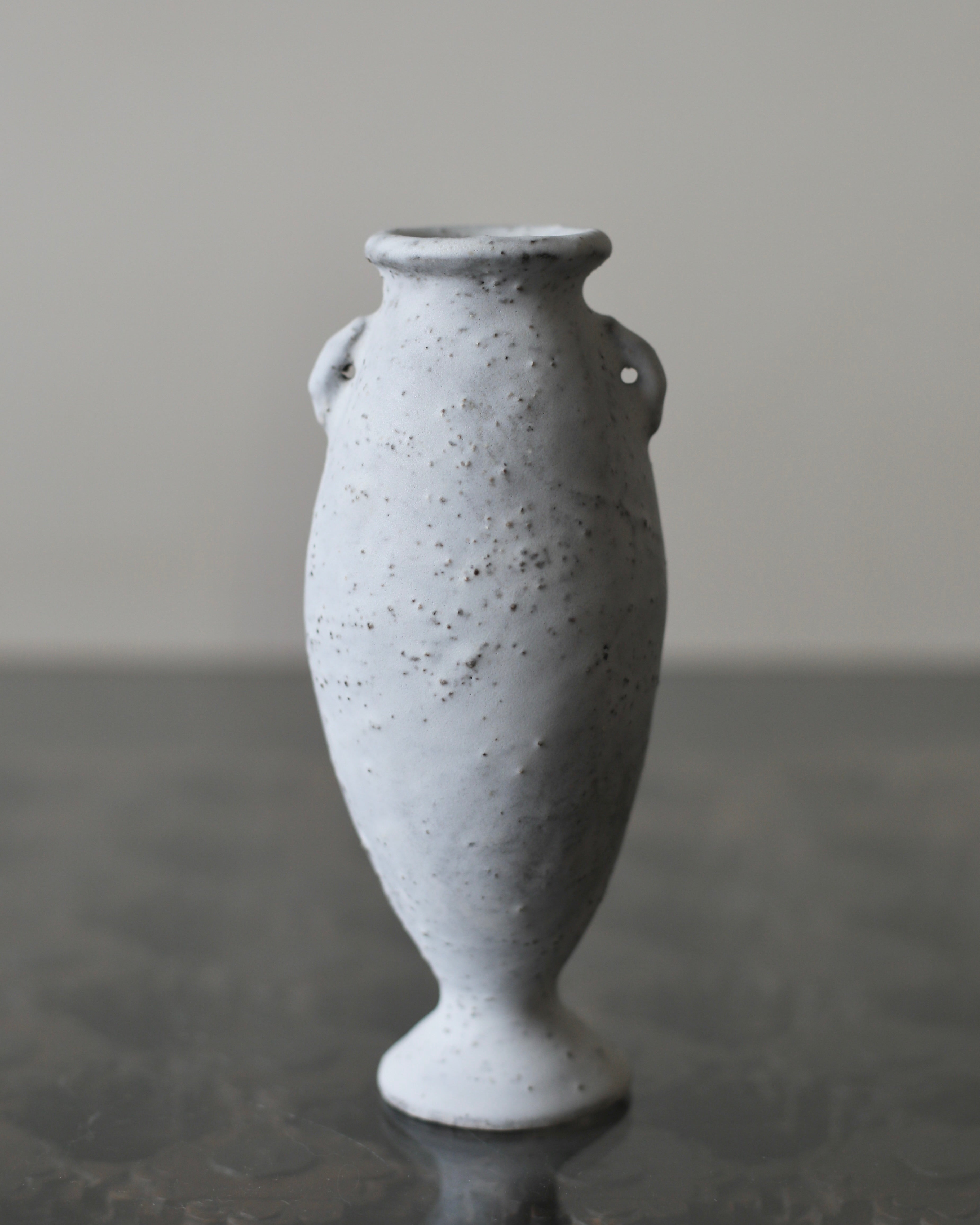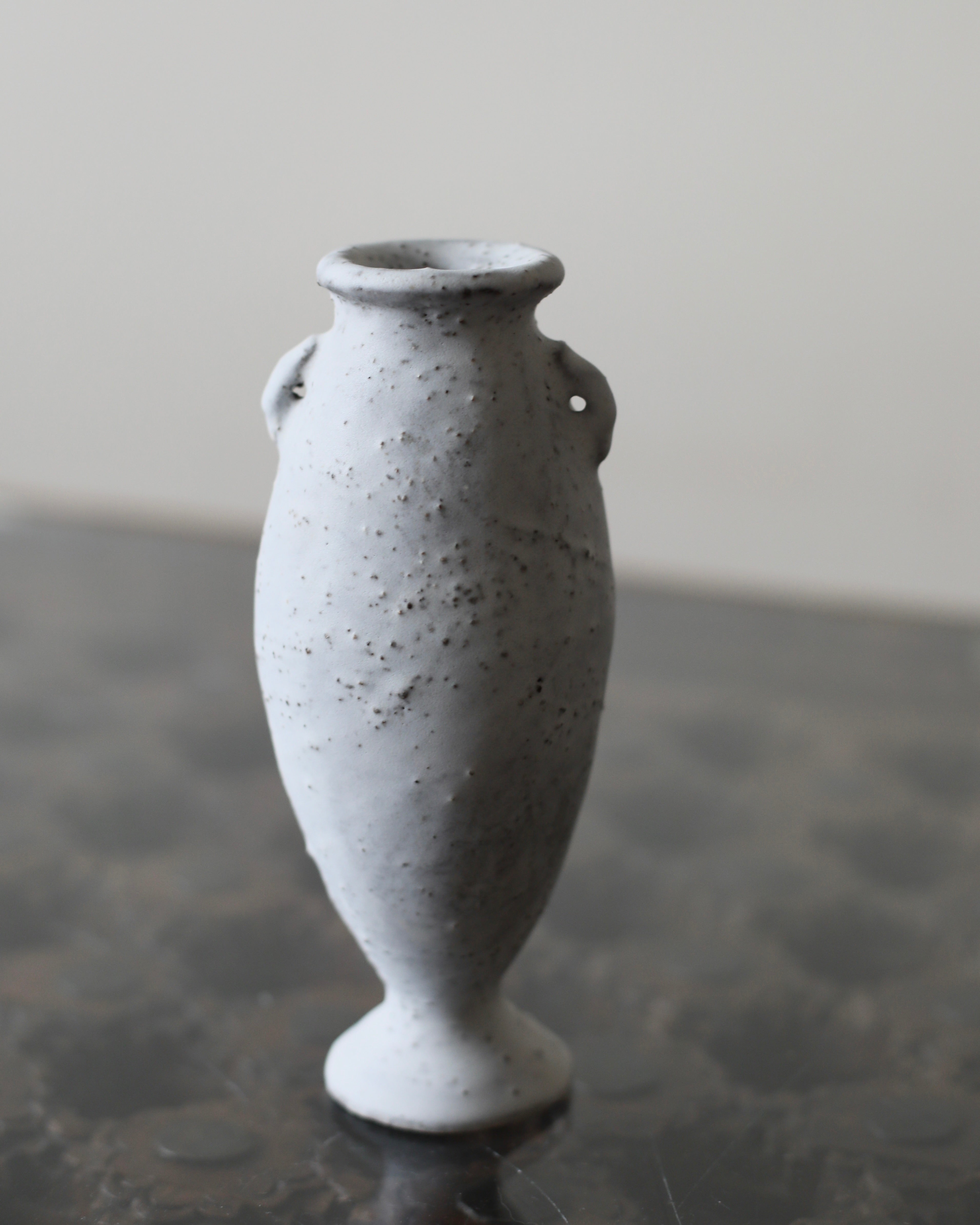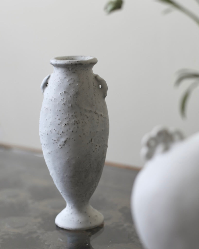 McLeish’s collection of stoneware vessels is hand-built using pinching and coiling, allowing each form to develop slowly and intuitively. Forms are layered with slips, washes, and glazes, some made from materials collected during her walks, creating a variety of surfaces from smooth, pebble-like whites to intricate crackles and deeply textured blacks. The forms range from elegant columnar vases to shorter, amphora-like silhouettes, featuring gentle asymmetries, decorative lugs and subtle shifts in proportion. These quiet irregularities give each piece warmth, movement, and a distinctly handmade presence.