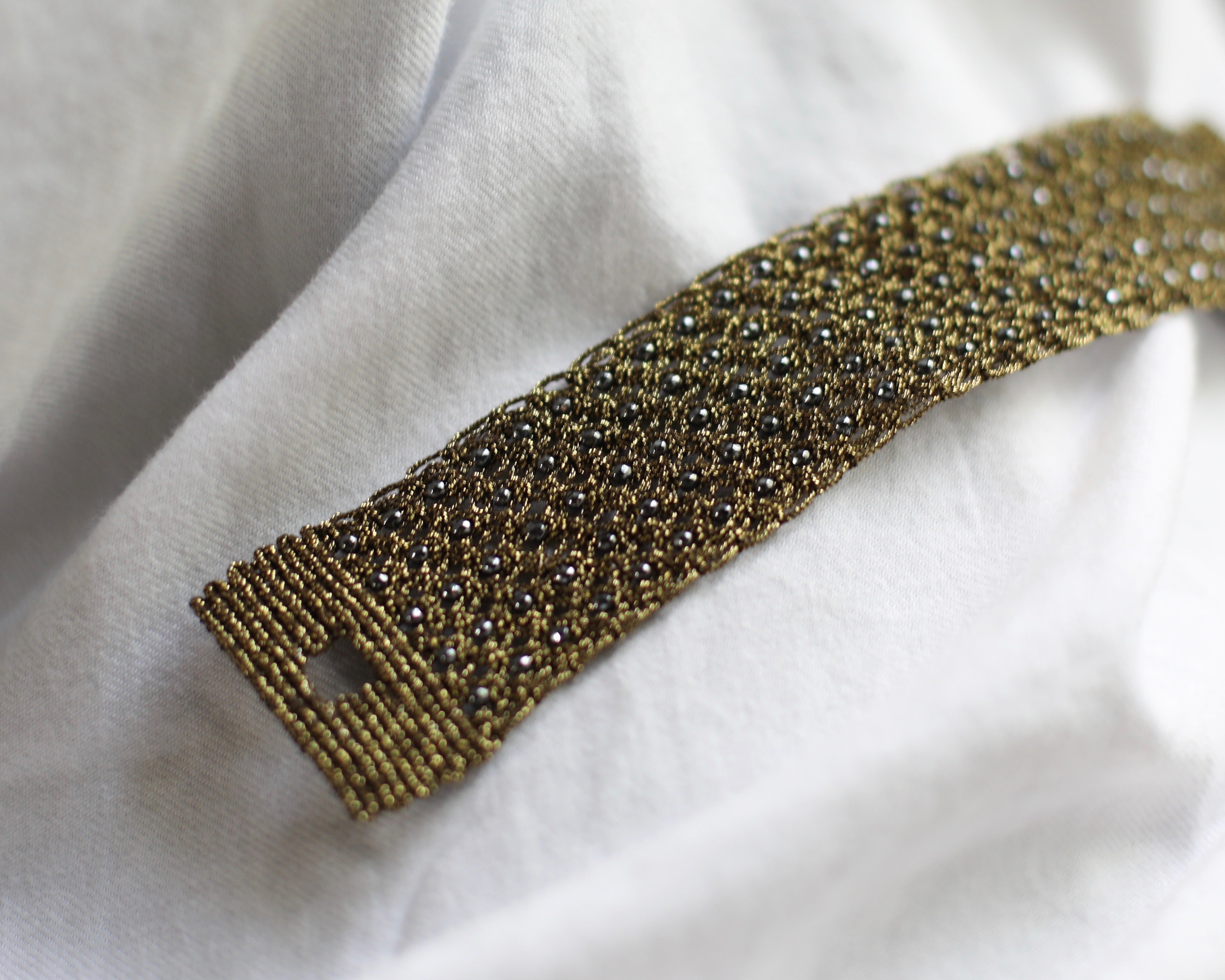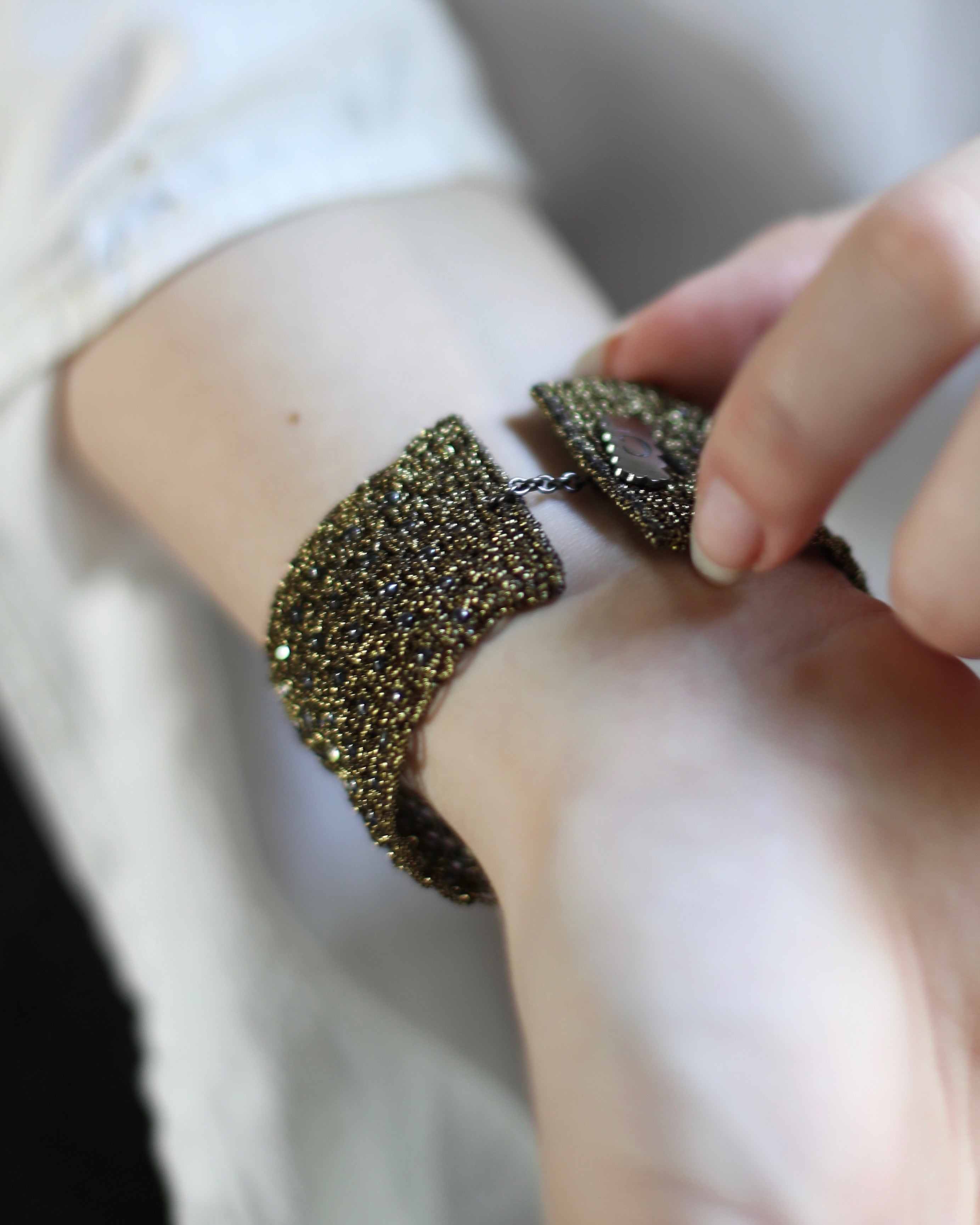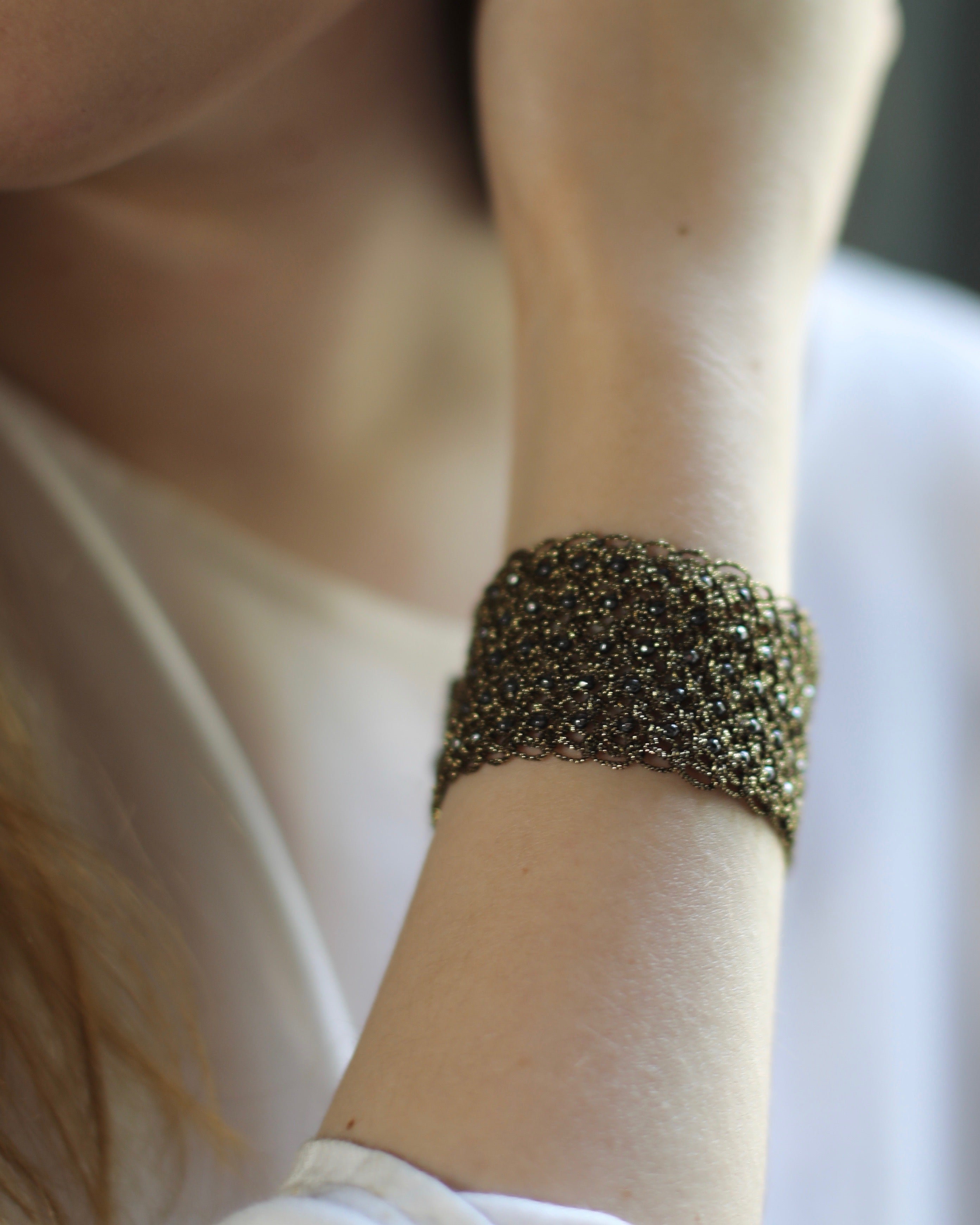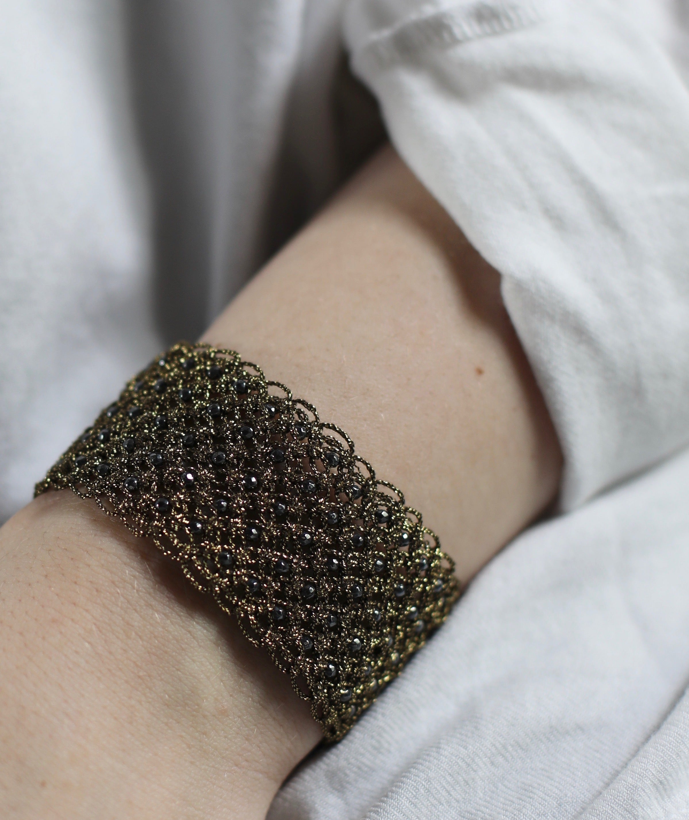 All her jewelry is handmade with silk, metallic threads and natural healing gemstones. She constantly evolves her collection by creating new colors, adding new concepts and techniques with lace, high aesthetics and environmentally conscious practices being her main focus.