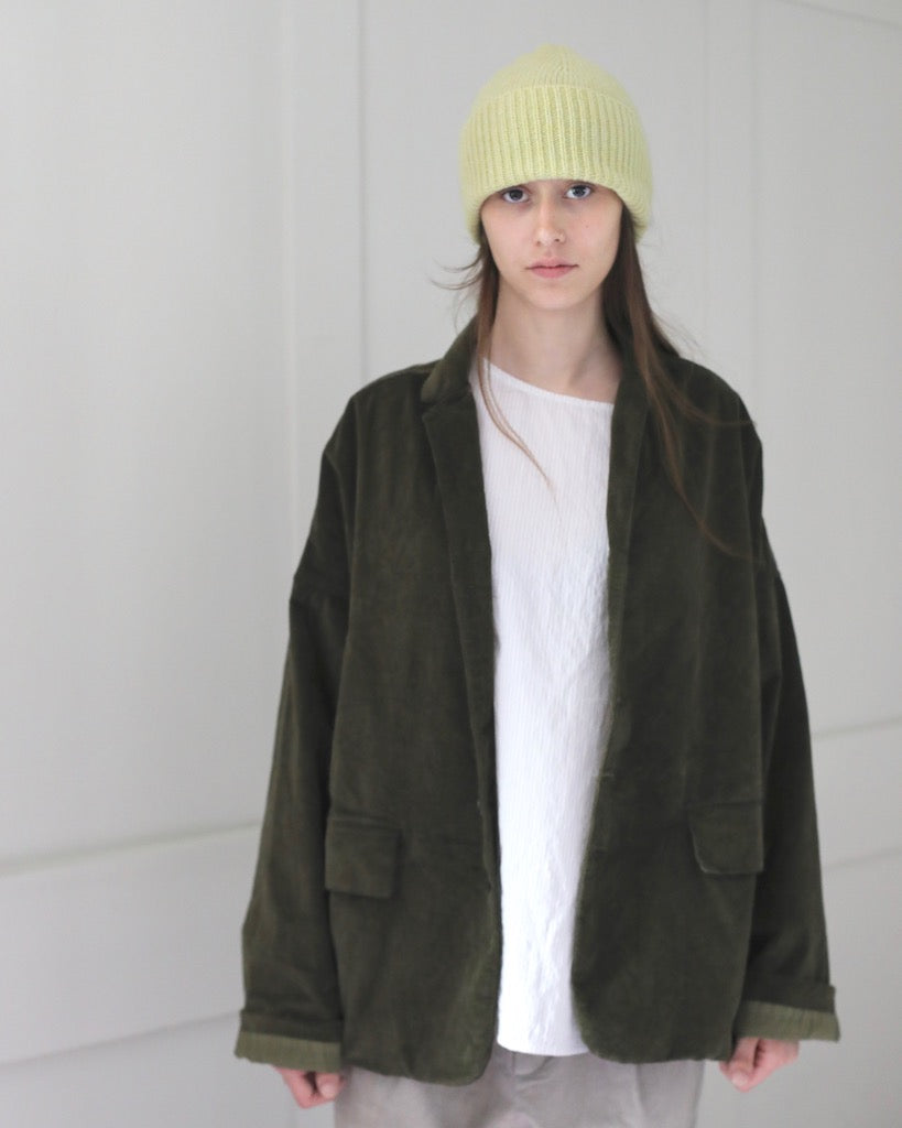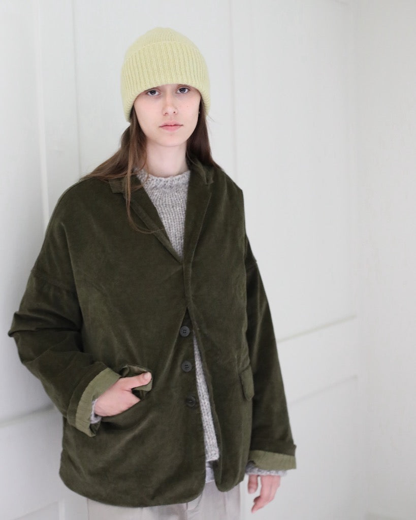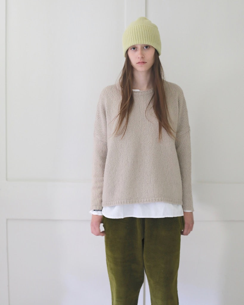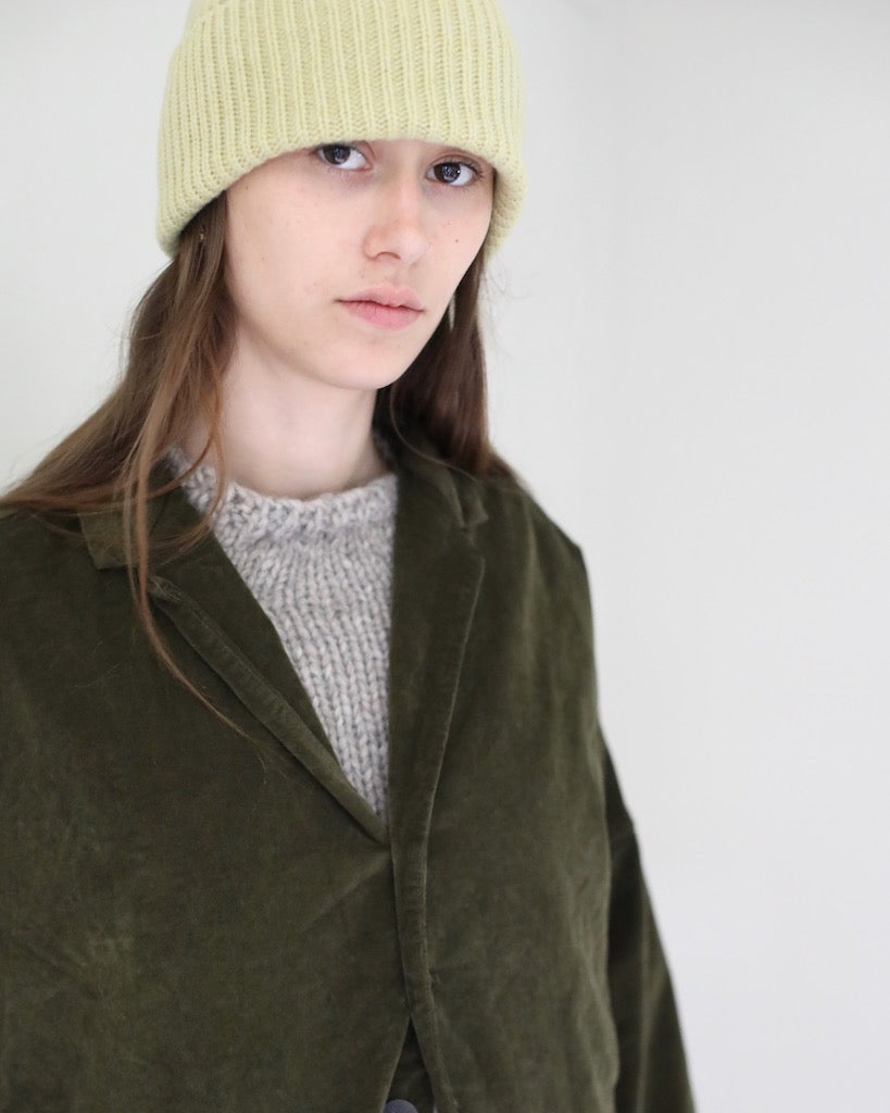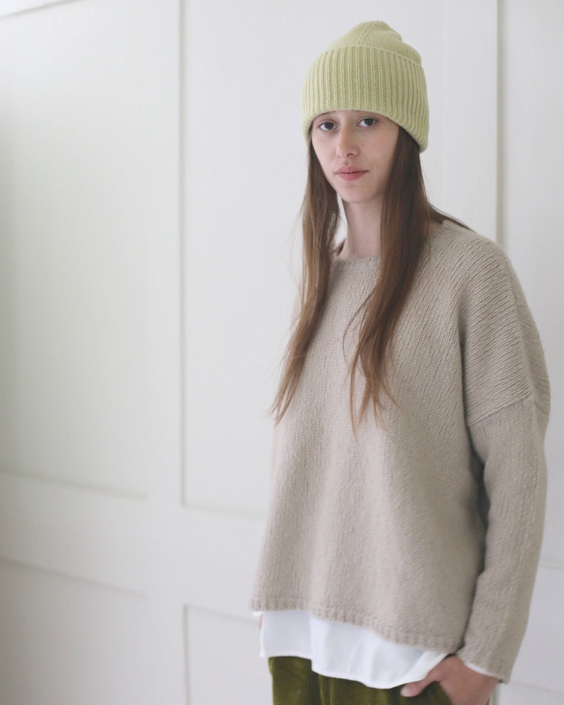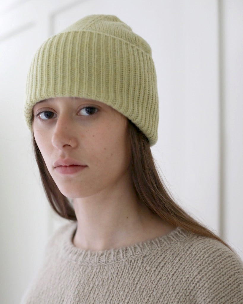 Description: This beautiful knit beanie by Mature Ha in a muted yellow is very light weight, soft and warm. With a wide, ribbed edge this unisex hat can be worn neatly cuffed or full length.