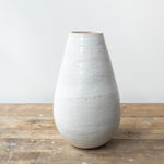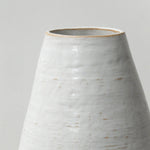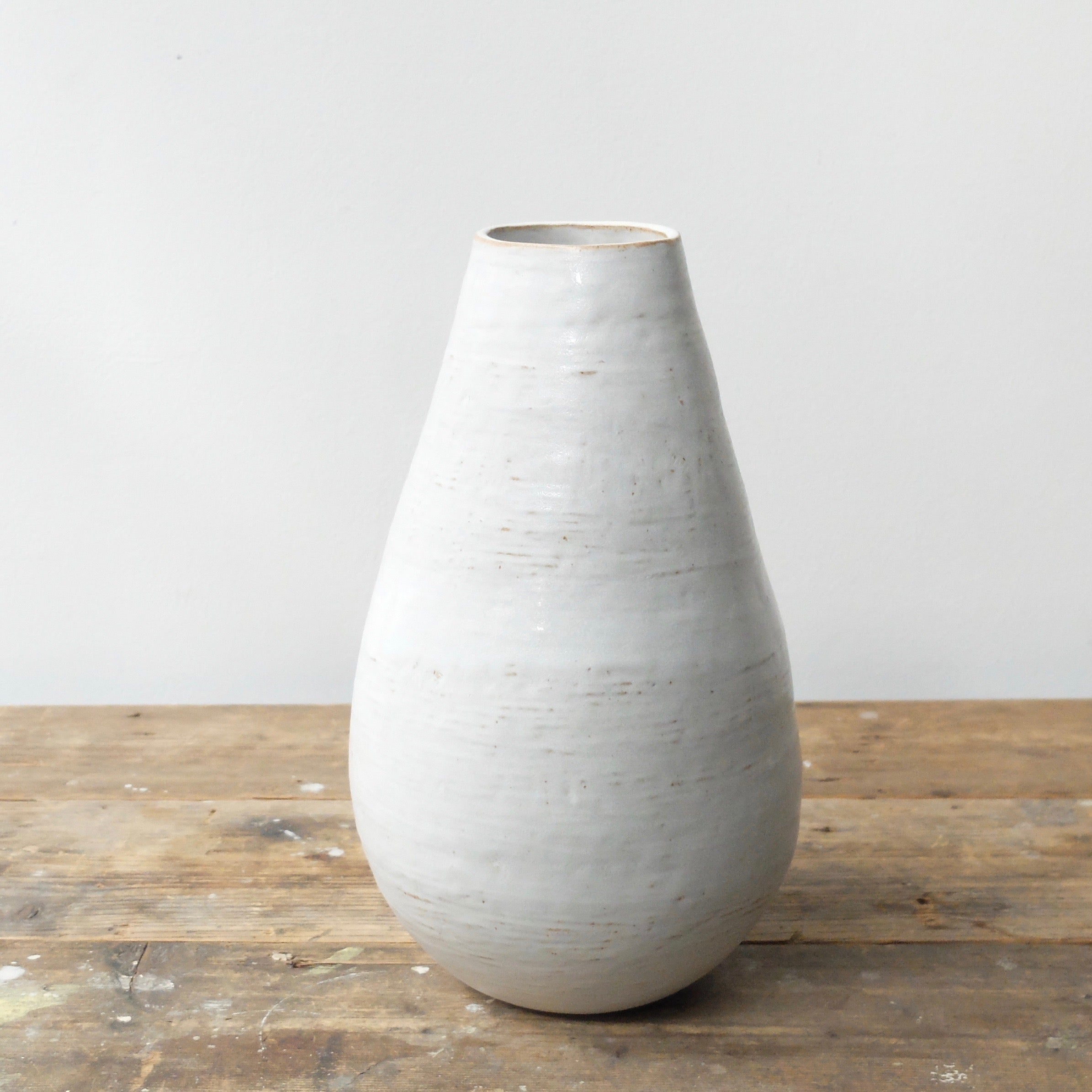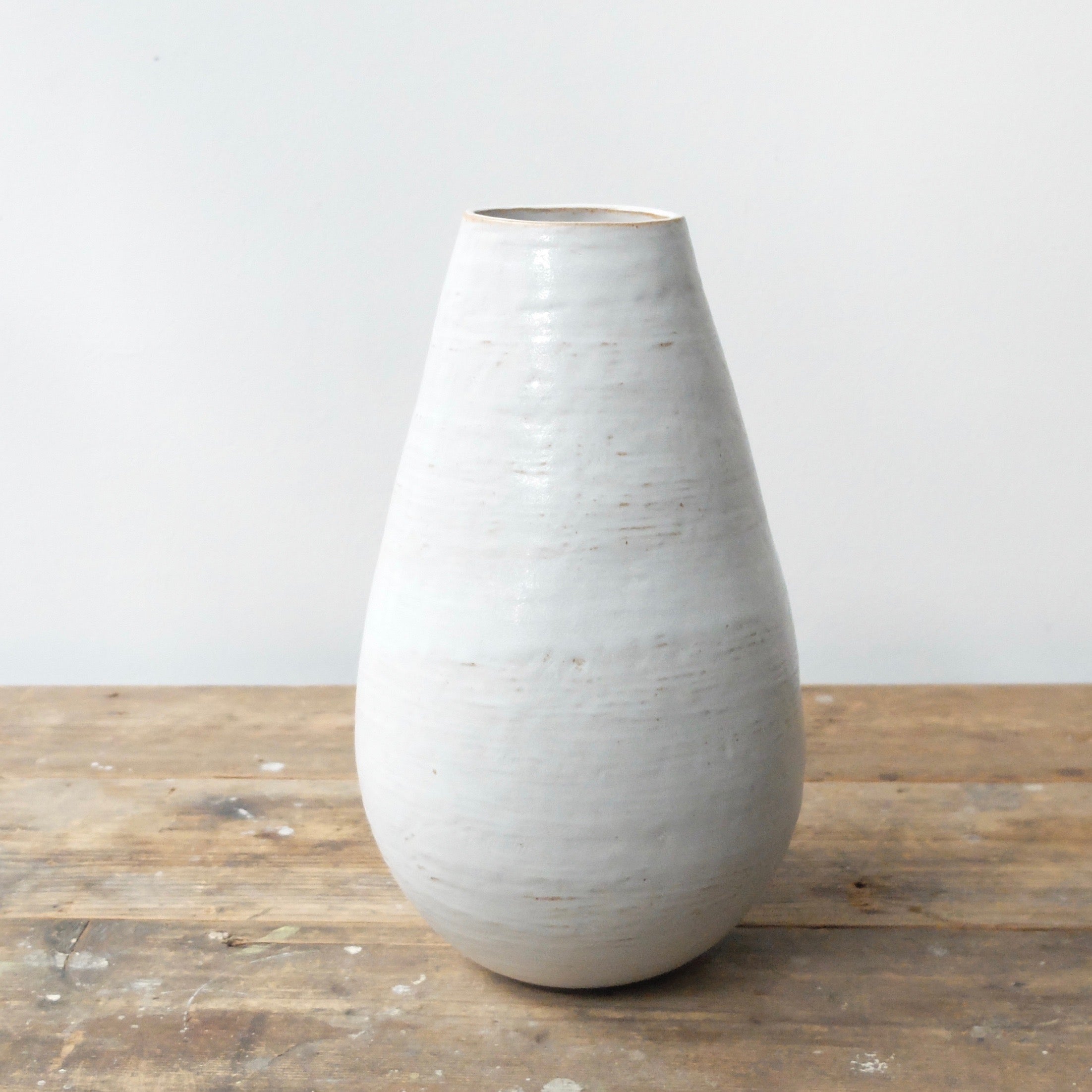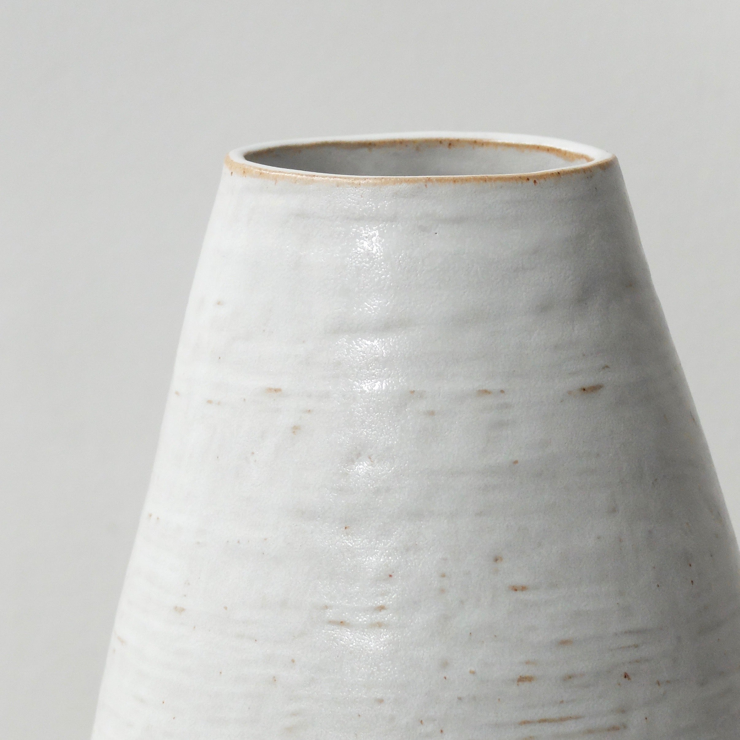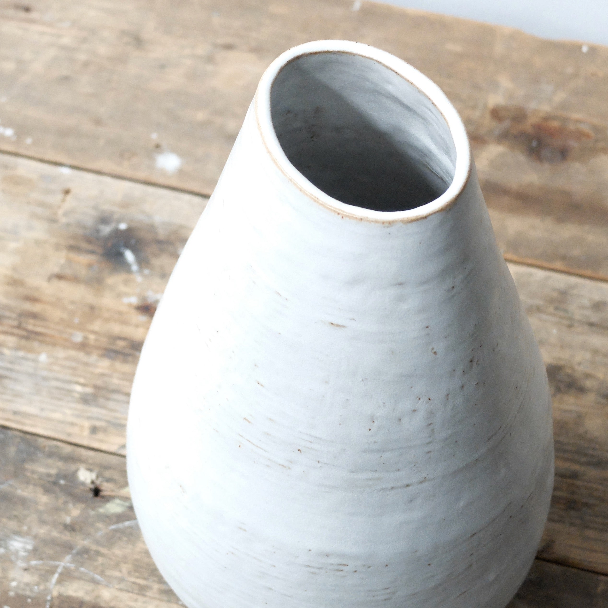 This vessel is coated with a smooth opaque satin white glaze, where speckles of iron and ochre toned marks from the underlying clay show through the glaze. In ceramics the effect where the glaze thins and the marks on the surface below emerge is called ‘breaking,’ this is also how we refer to waves in the sea when they have reached their crest.
