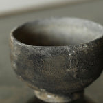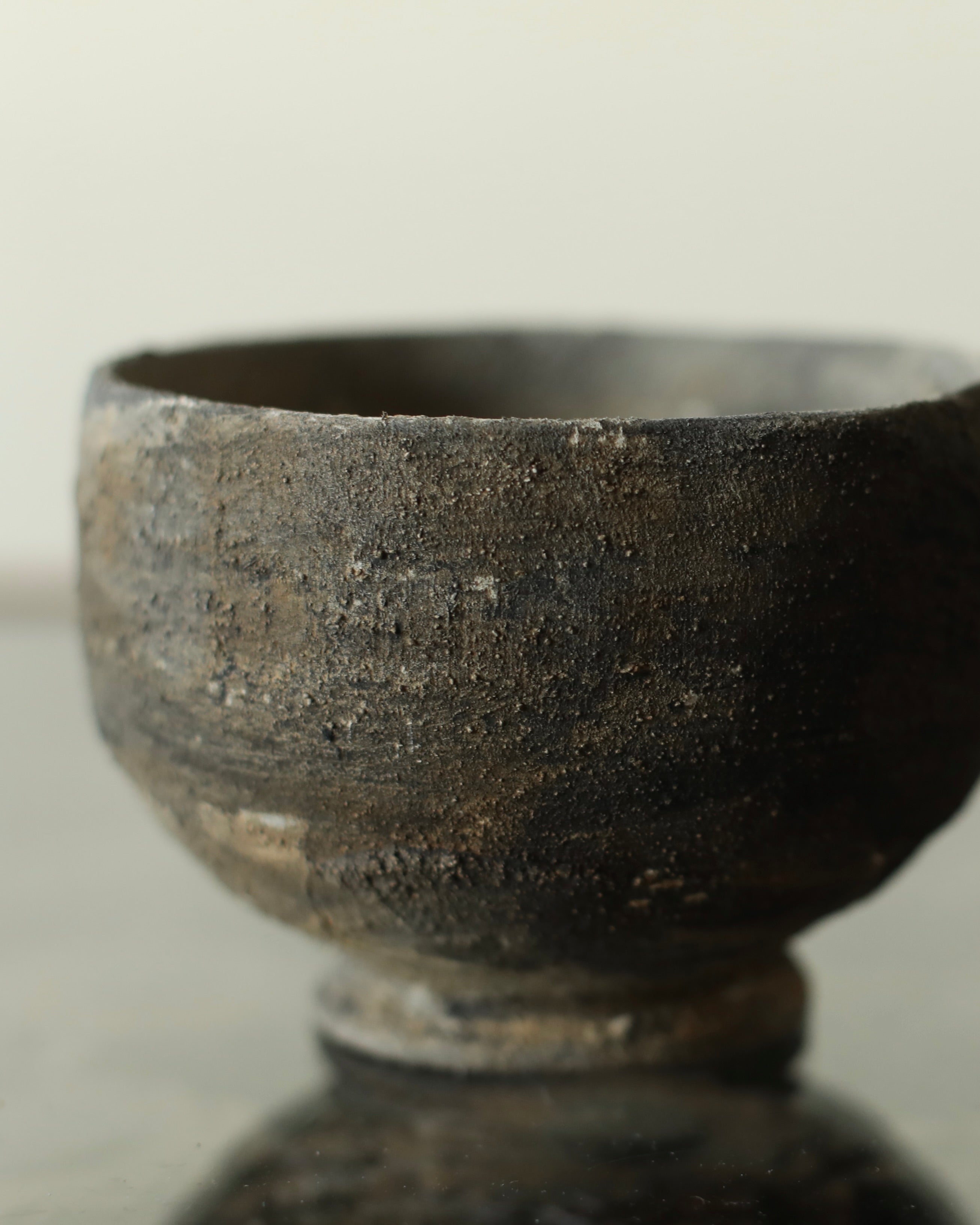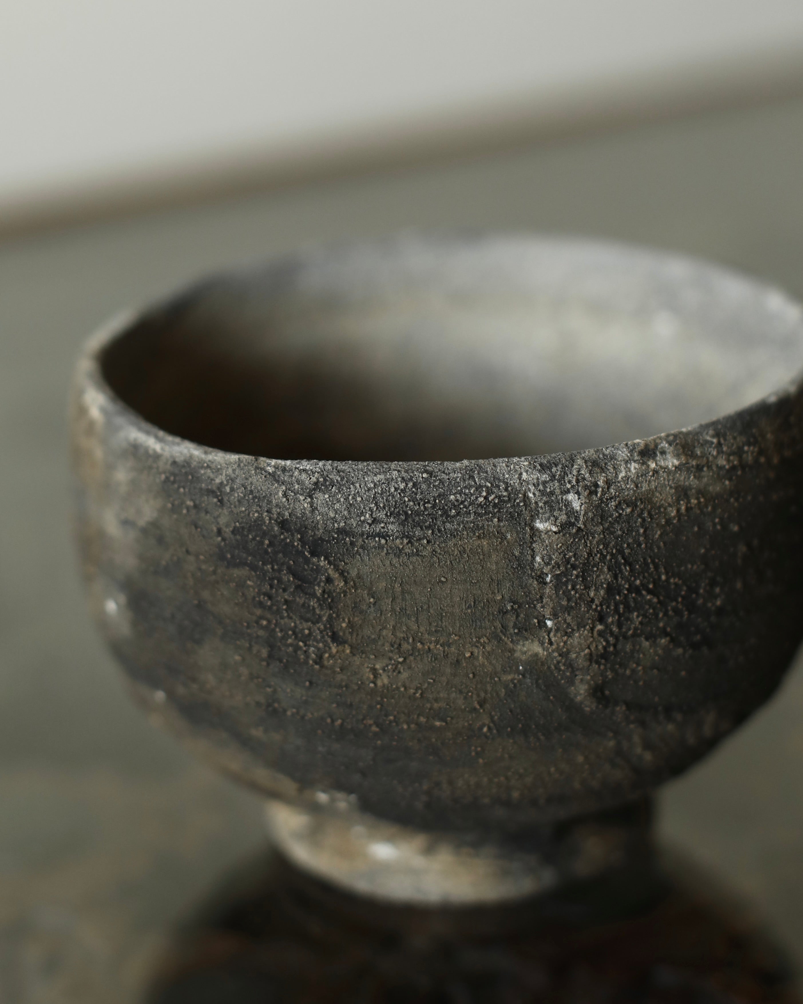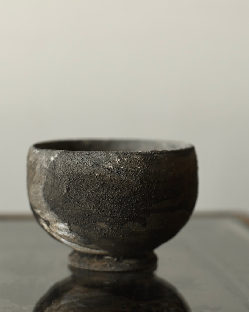 Crafted from sustainably sourced ash, this rounded cup rests on a small stand. A wash of local chalk and earth pigments, combined with oak gall, nettle, and walnut dyes, creates a dry, grainy surface. Soft layers of neutral colour orbit the vessel, appearing almost brushed on, settling into the wood.