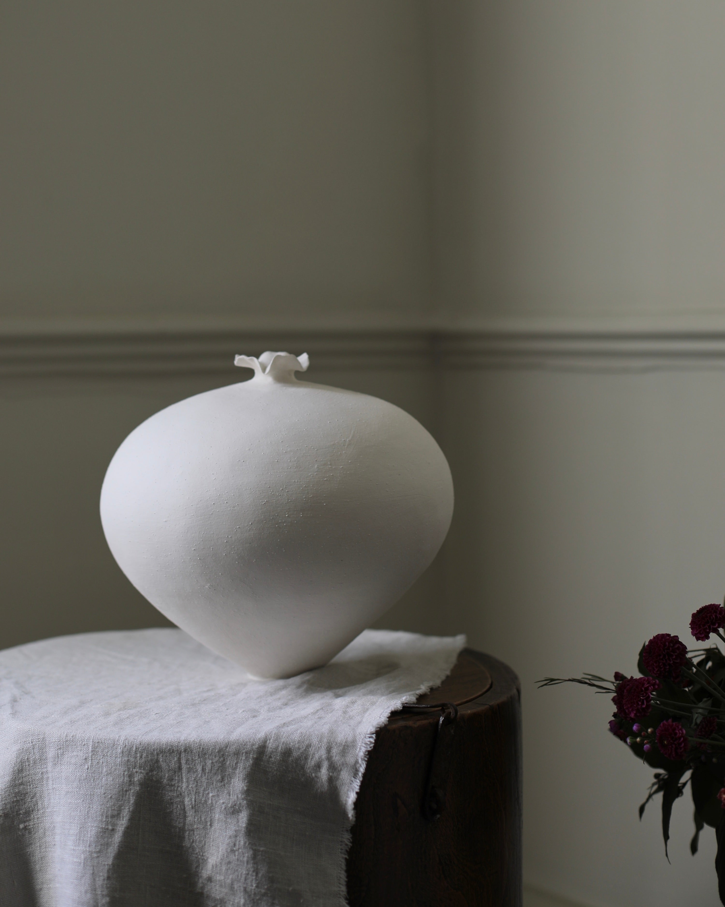 Inspired by her childhood surroundings, Ditte has embraced the use of stoneware, bringing a raw quality to her latest work. The vases are made of stoneware and painted with porcelain—a little touch of humbleness wrapped in timeless elegance.