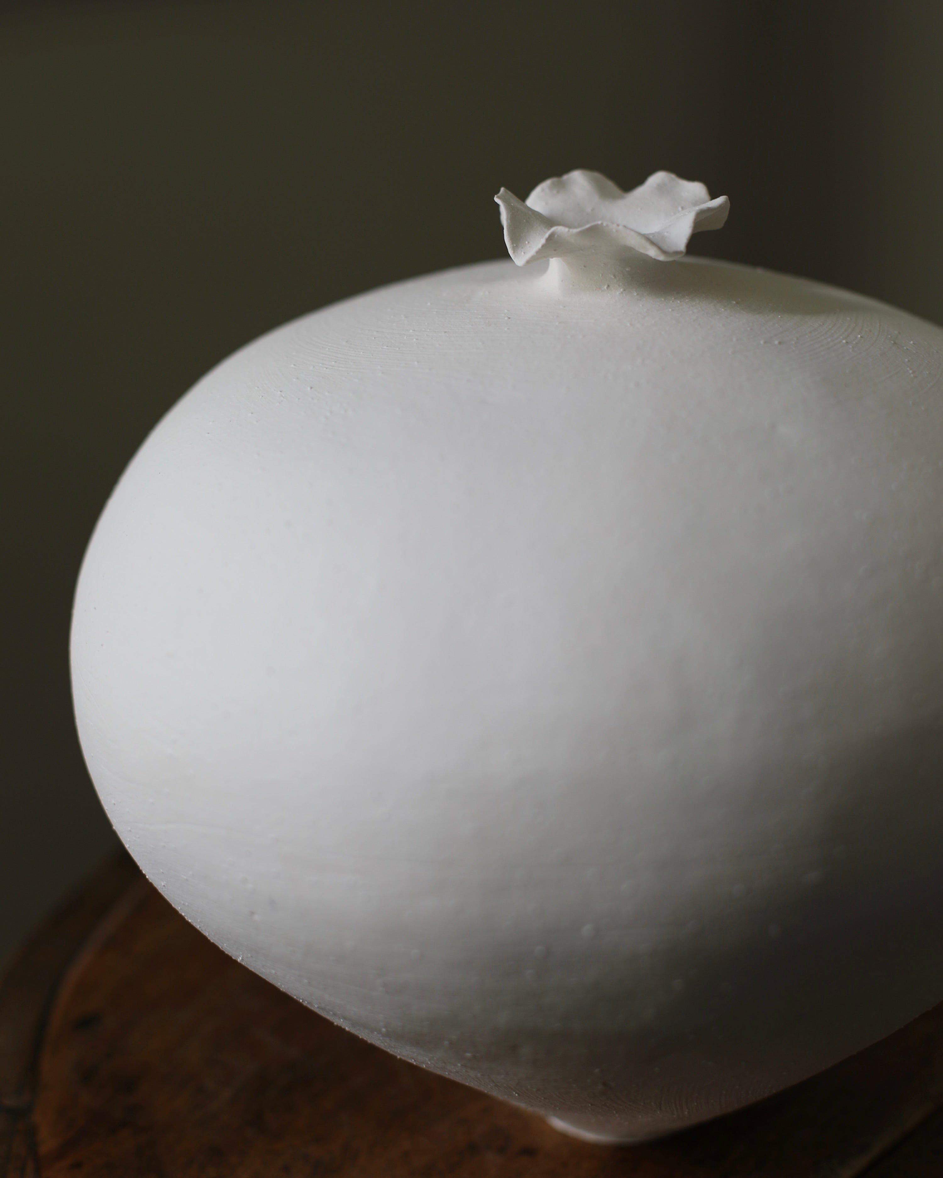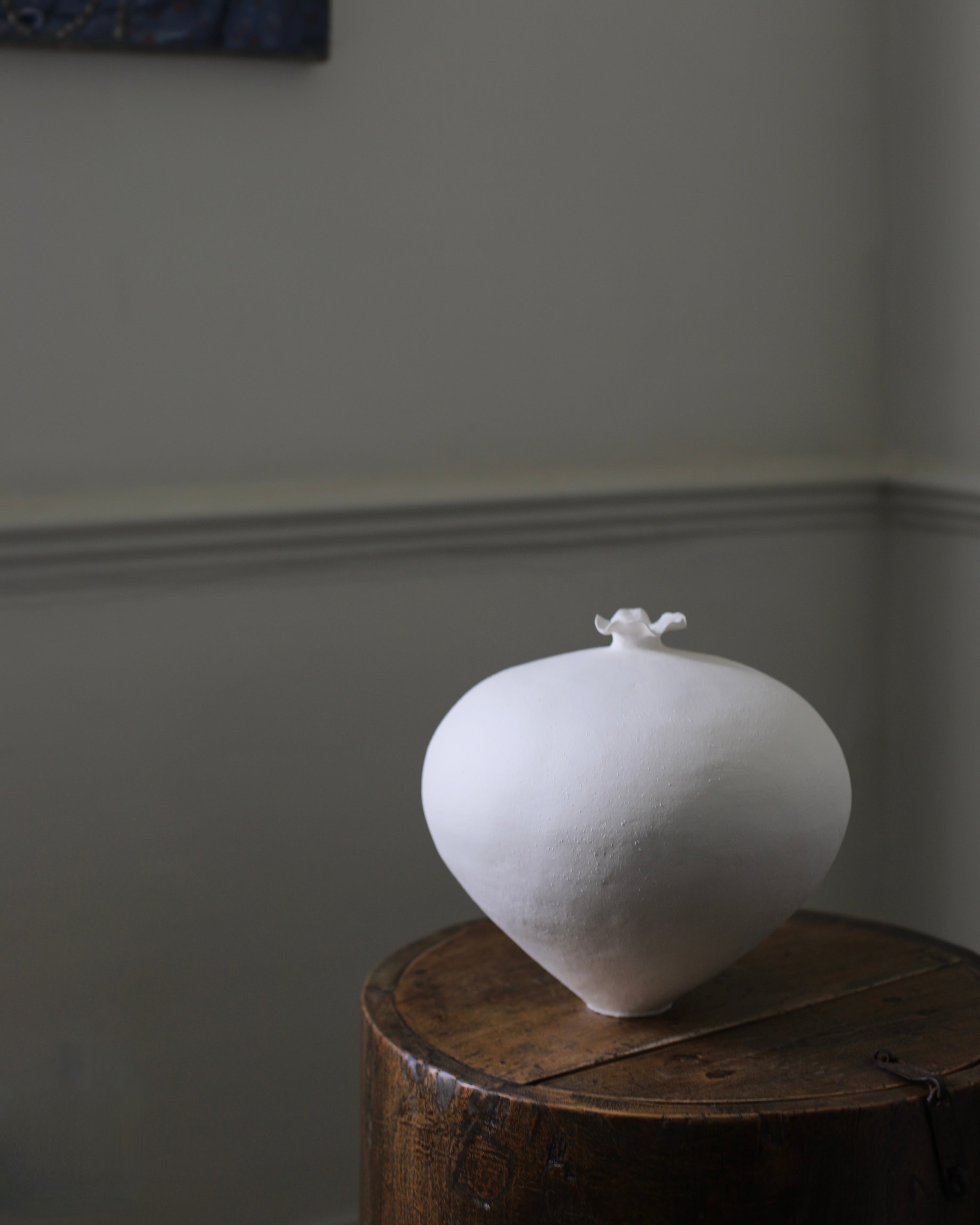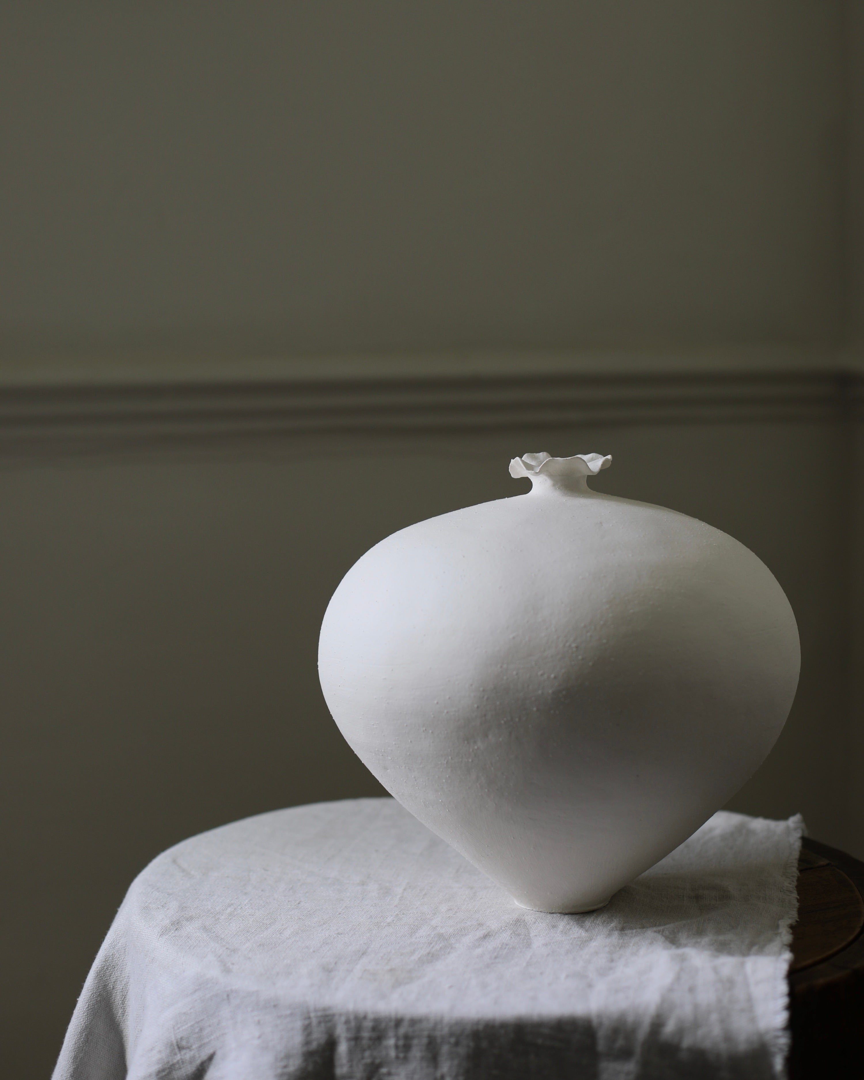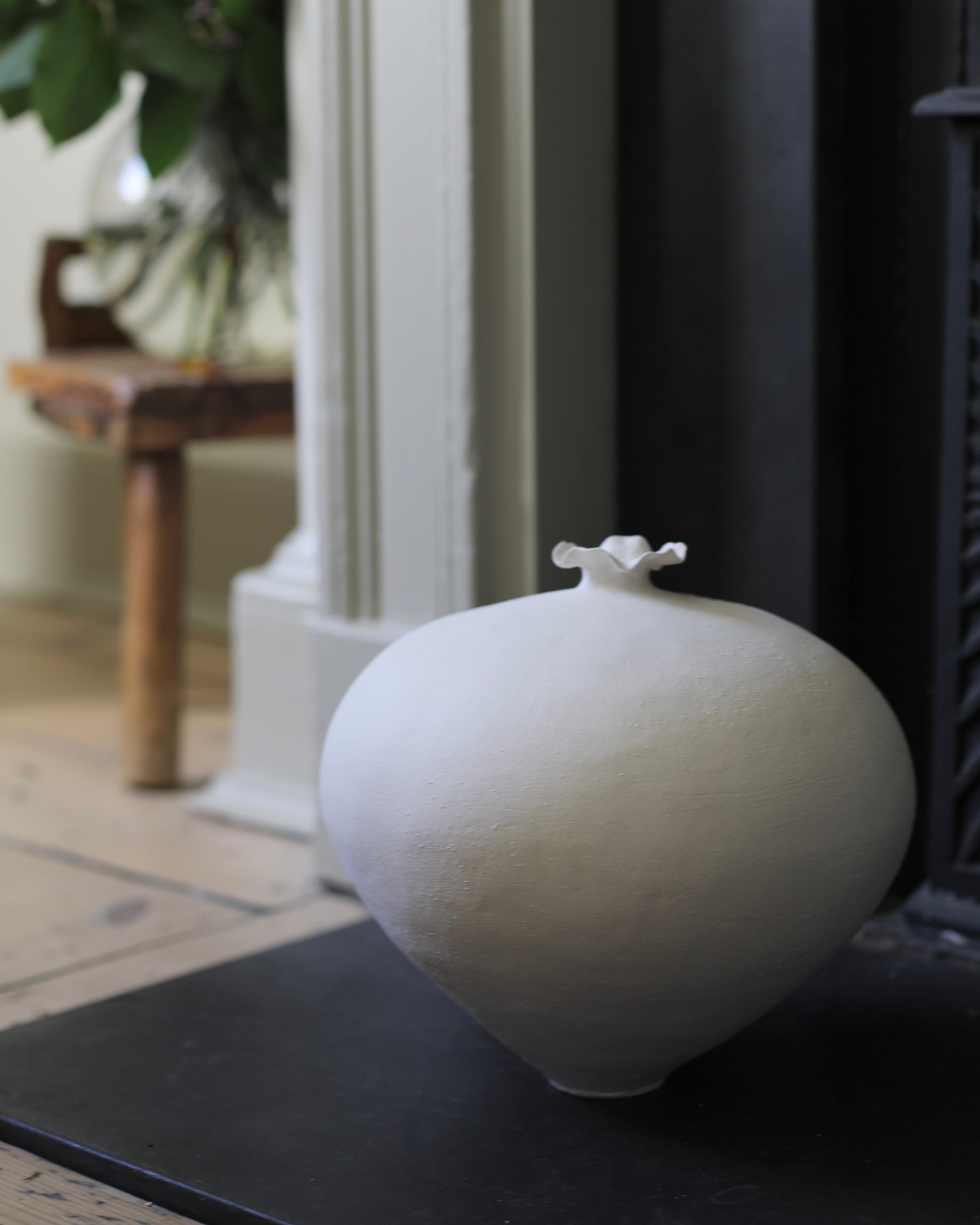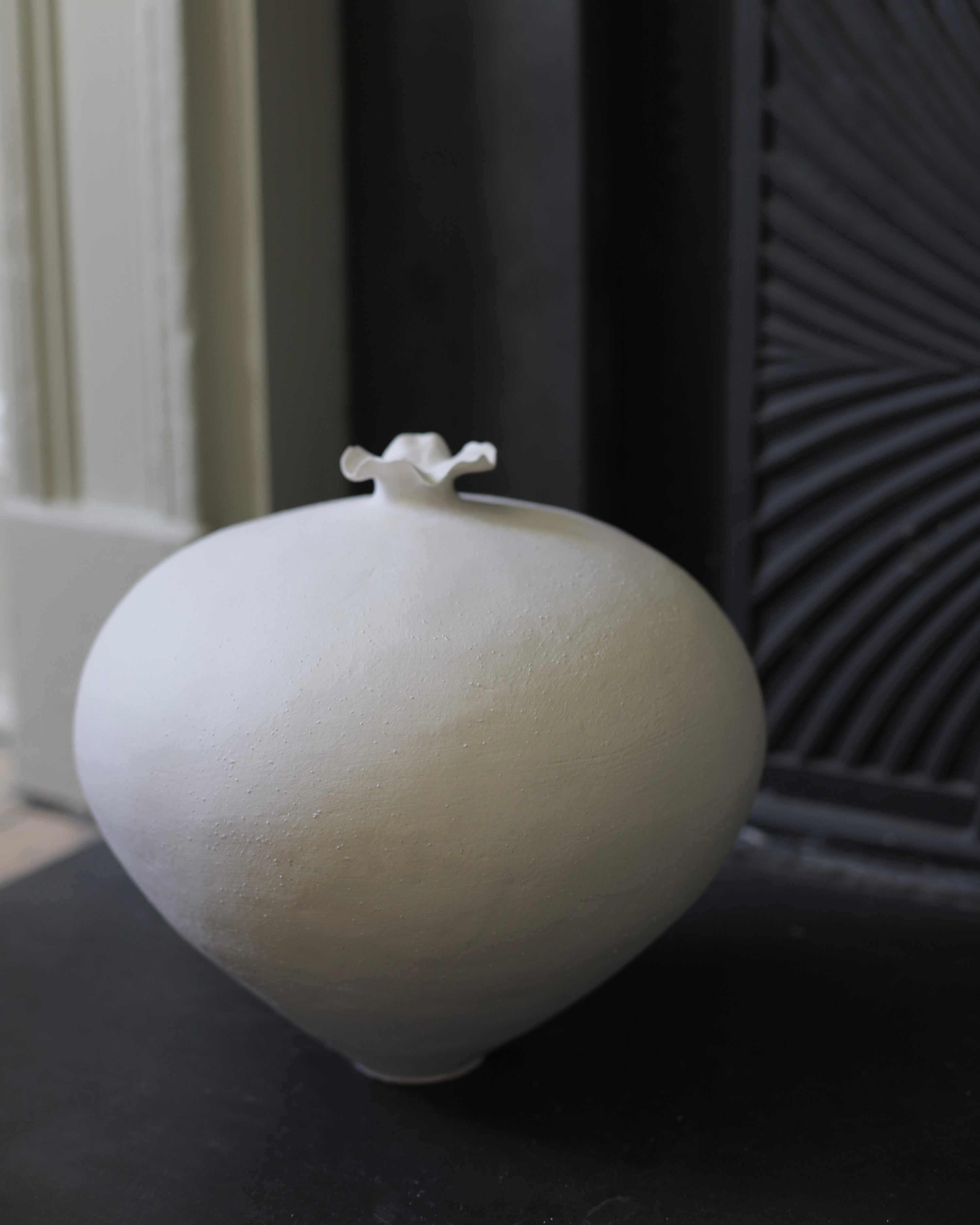 Gracefully moulded, this vase stands with a solid rounded form, curving inwards to a slight and gentle neck. The asymmetric opening burst outward, adorned with delicate curves and folds. The subtly scalloped edge and thin cloth-like ripples exude elegance. The vase’s surface, smooth with subtle indentations, displays a pale cream hue that lends to the timeless allure. Crafted with care, this vase harmoniously combines a blend of strength and fragility.