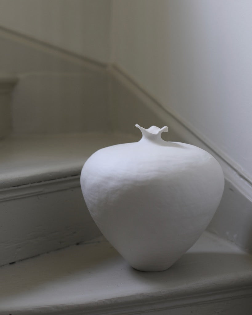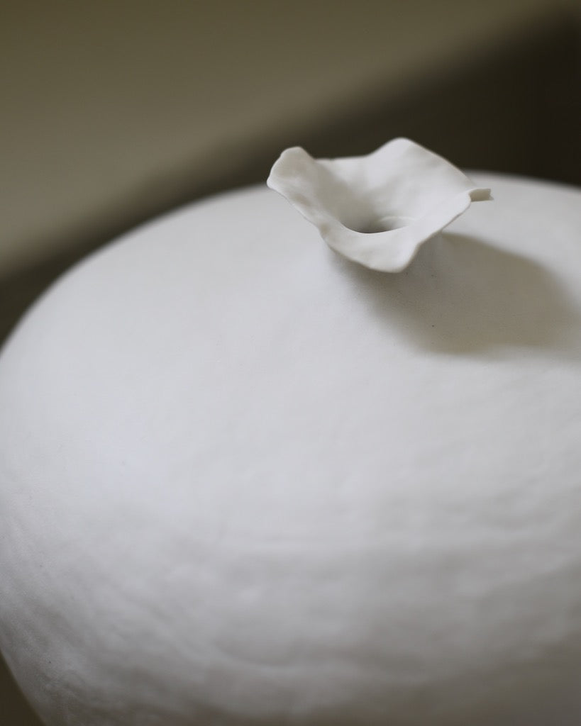 Gracefully moulded, this porcelain vase stands with a solid rounded form, curving inwards to a slight and gentle neck. The asymmetric opening burst outward from the neck, adorned with delicate curves and folds. The subtly scalloped edge and thin cloth-like ripples exude elegance. The vase’s surface, smooth with subtle indentations, displays a pale cream hue that lends to the timeless allure. Crafted with care, this vase harmoniously combines a blend of strength and fragility.