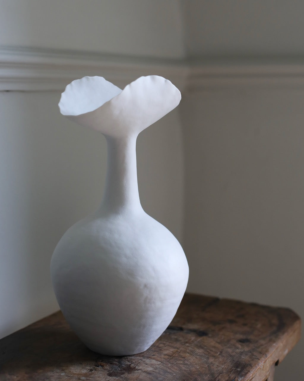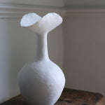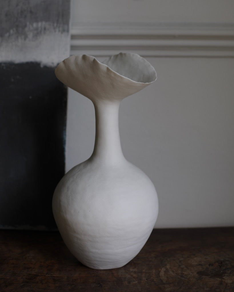 Displaying elegance, this porcelain vase showcases an artfully moulded form. Its solid rounded shape gracefully flows into an elongated neck. A delicate opening proudly protrudes with a U-shaped design. The edge is subtly scalloped, with a rippling appearance reminiscent of cloth. The vase’s surface, smooth and subtly indented, displays a pale cream hue that enhances the timeless beauty. This thoughtfully crafted vase brings together strength and fragility harmoniously.