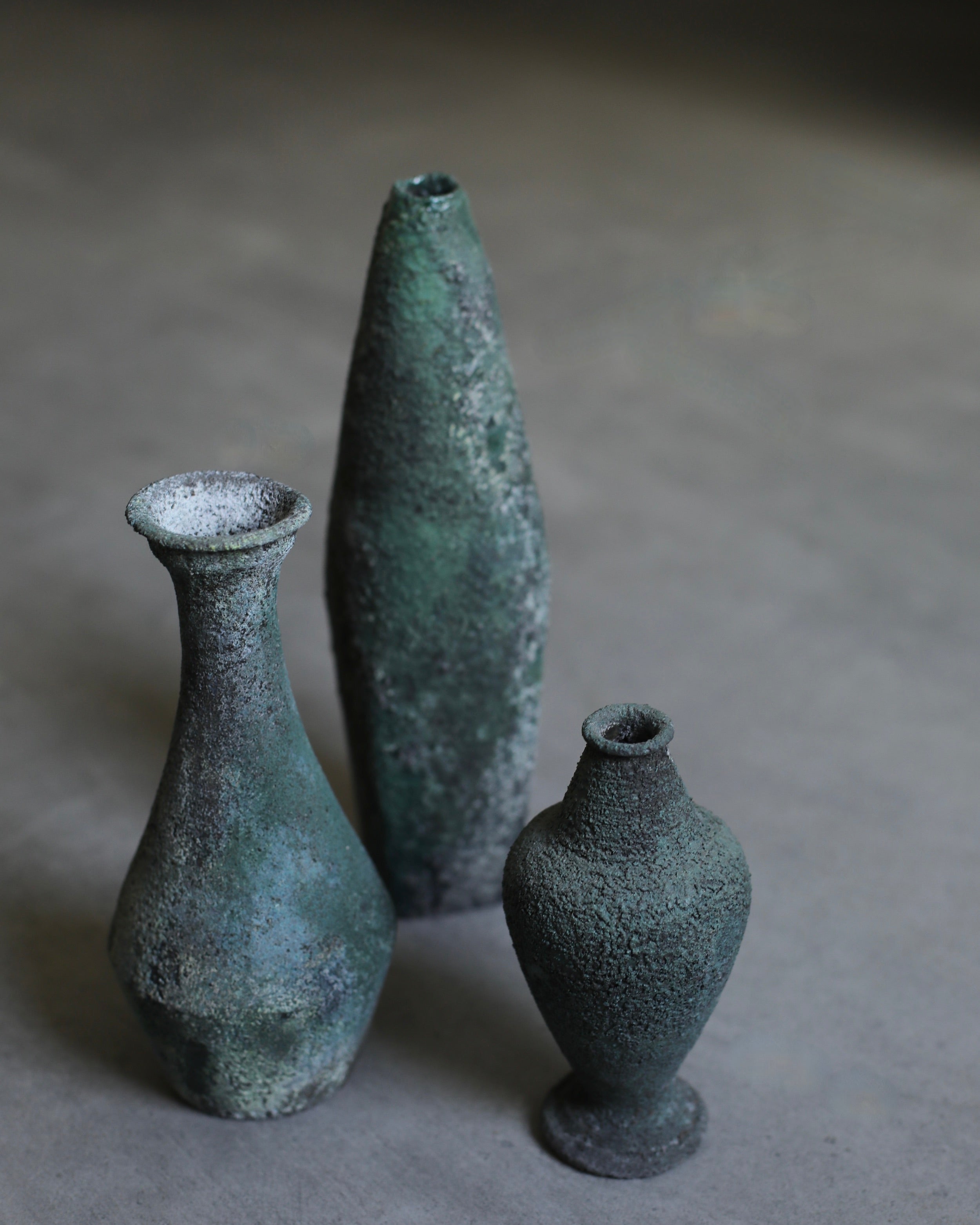 Noguchi's mastery of firewood kilns is particularly evident in his latest series, Verdigris Green. These dynamic, finely made pieces murmur through hues of chromium oxide to rich copper green. This hum of colour is echoed in the tactile moss-like surfaces he achieves by adding an accumulation of ash during the firing processes. The resulting works blur the line between contemporary pottery and historical artefacts, endowing them with an enigmatic beauty that leaves the origins of these pieces unclear, an ideal that Noguchi is seeking within his work.