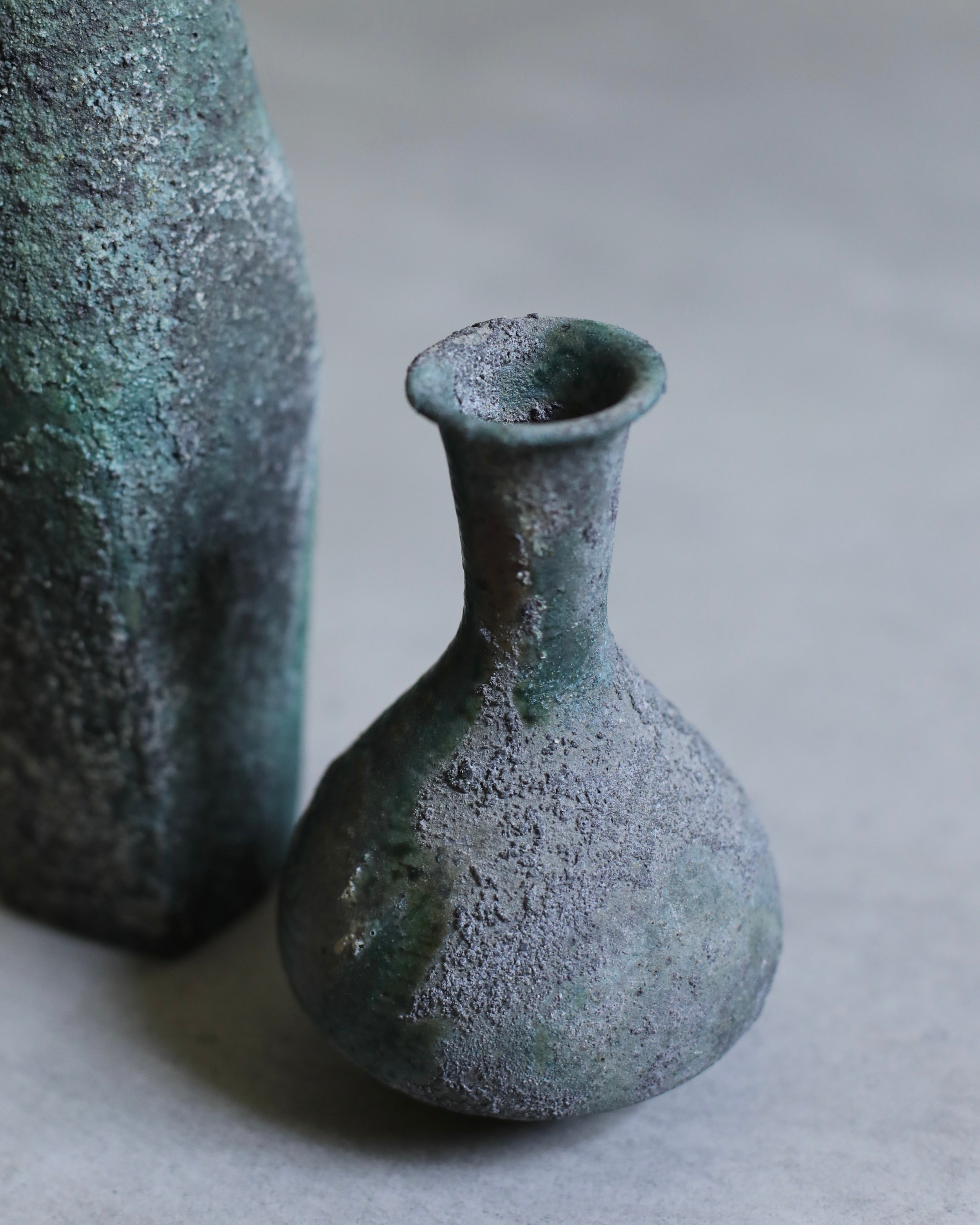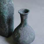 This vessel recalls the form of an apothecary’s bottle, compact with a broad base and an elongated neck. Made from naturally sourced materials, it has been meticulously hand-turned and fired in a textured glaze. Its surface bears a crystalline finish, enriched by a deep chromatic blend of verdigris and moss green, punctuated with moments of textured detail.