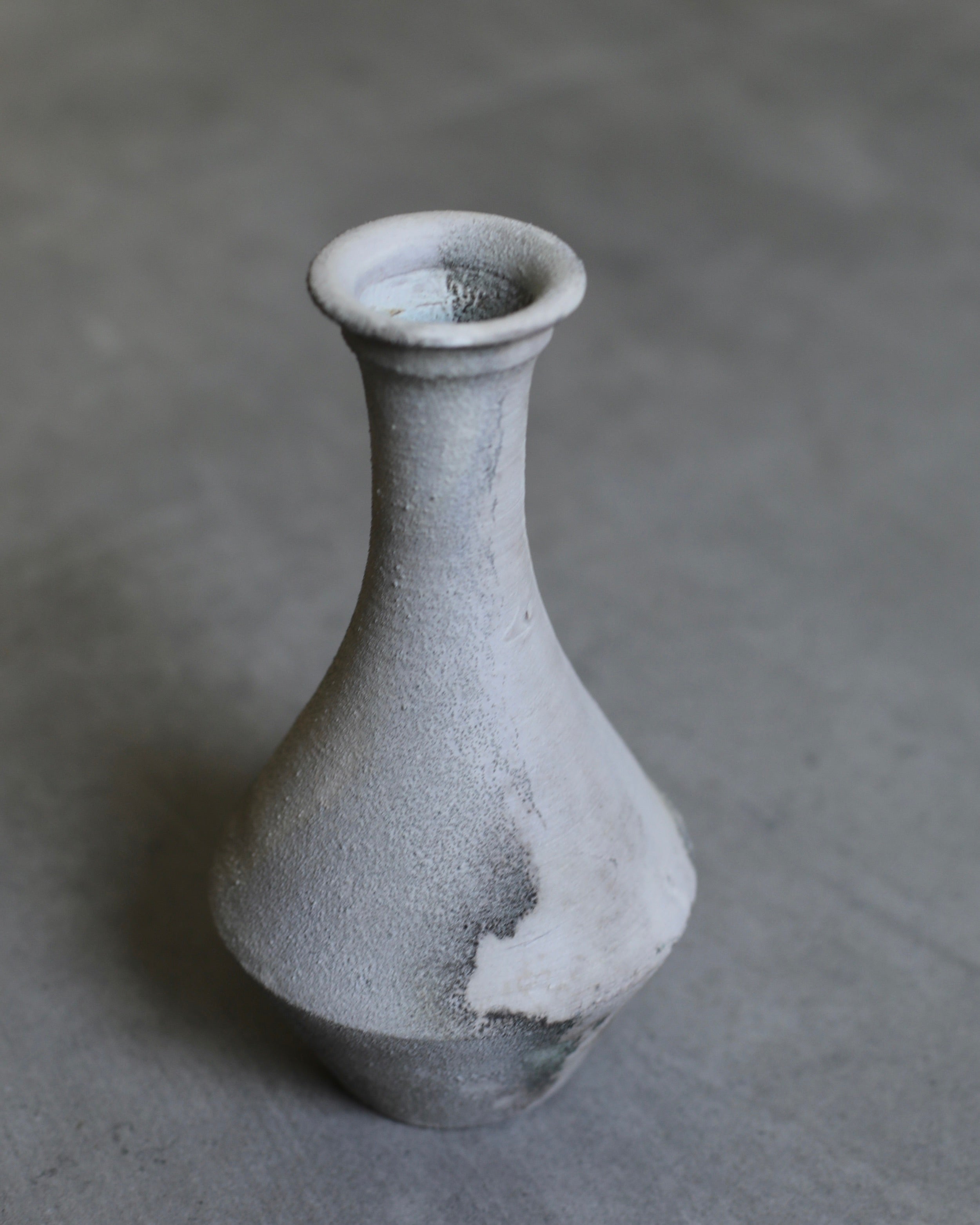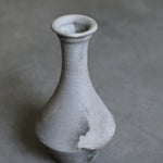 This vessel features a medium base that broadens at the midline before extending into a long, gently opening neck. This vessel is made from naturally sourced materials and has been exquisitely hand-turned before being fired in a textured lichen-like glaze. The surface carries a crystalline texture, veiled in natural greys that drift in vertical sweeps across the form.