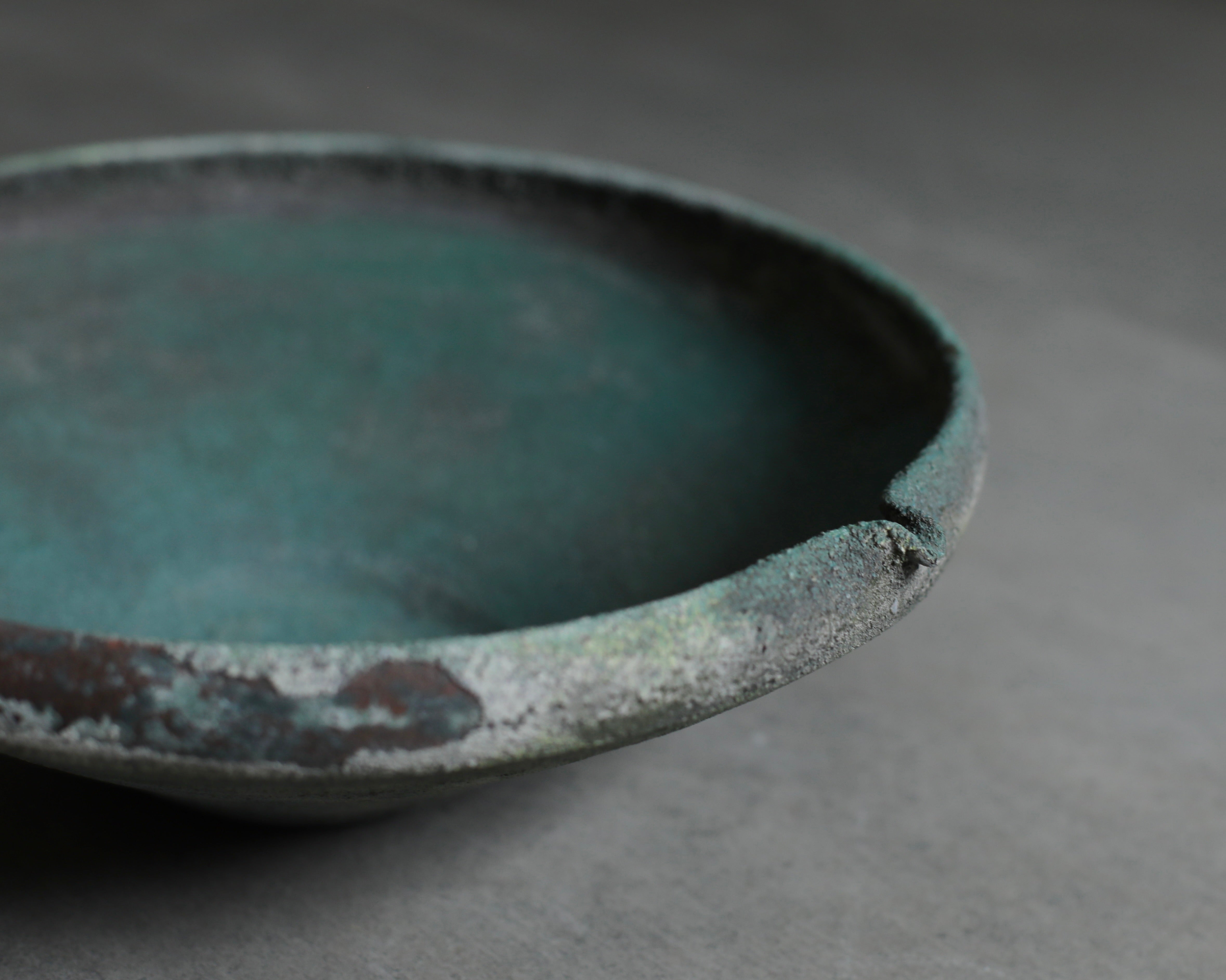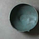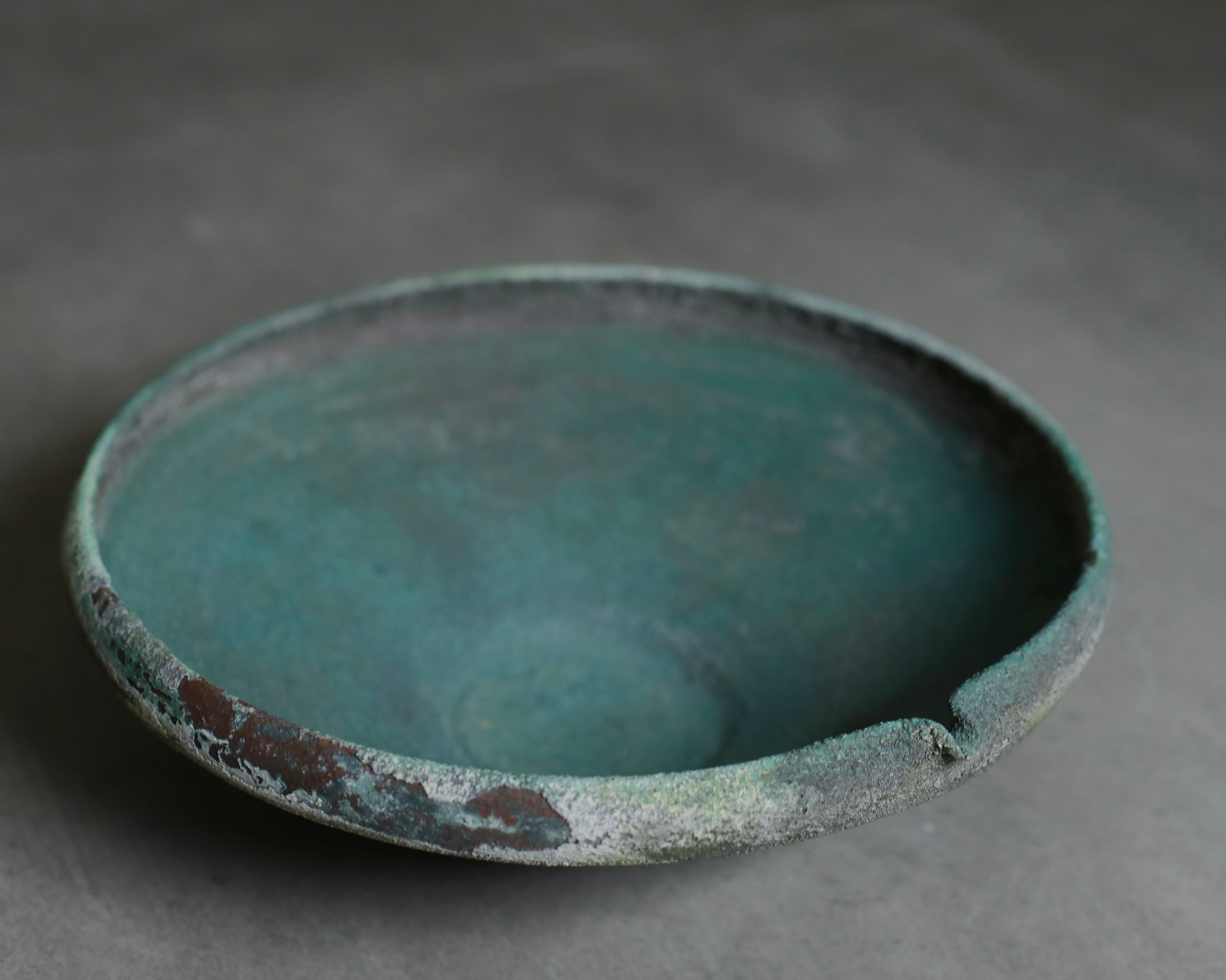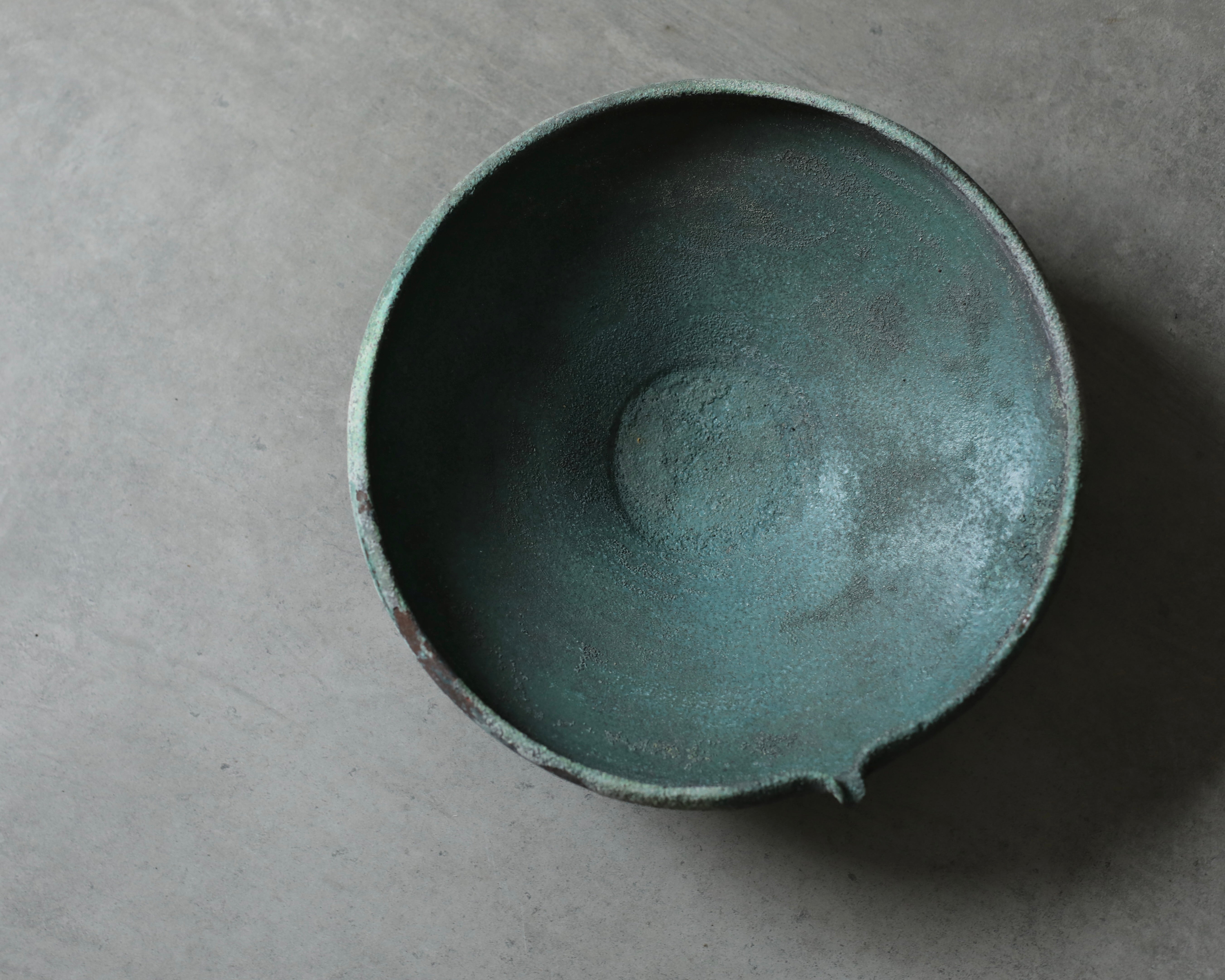 Noguchi's mastery of firewood kilns is particularly evident in his latest series, Verdigris Green. These dynamic, finely made pieces murmur through hues of chromium oxide to rich copper green. This hum of colour is echoed in the tactile moss-like surfaces he achieves by adding an accumulation of ash during the firing processes. The resulting works blur the line between contemporary pottery and historical artefacts, endowing them with an enigmatic beauty that leaves the origins of these pieces unclear, an ideal that Noguchi is seeking within his work.