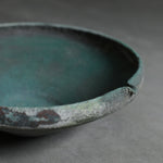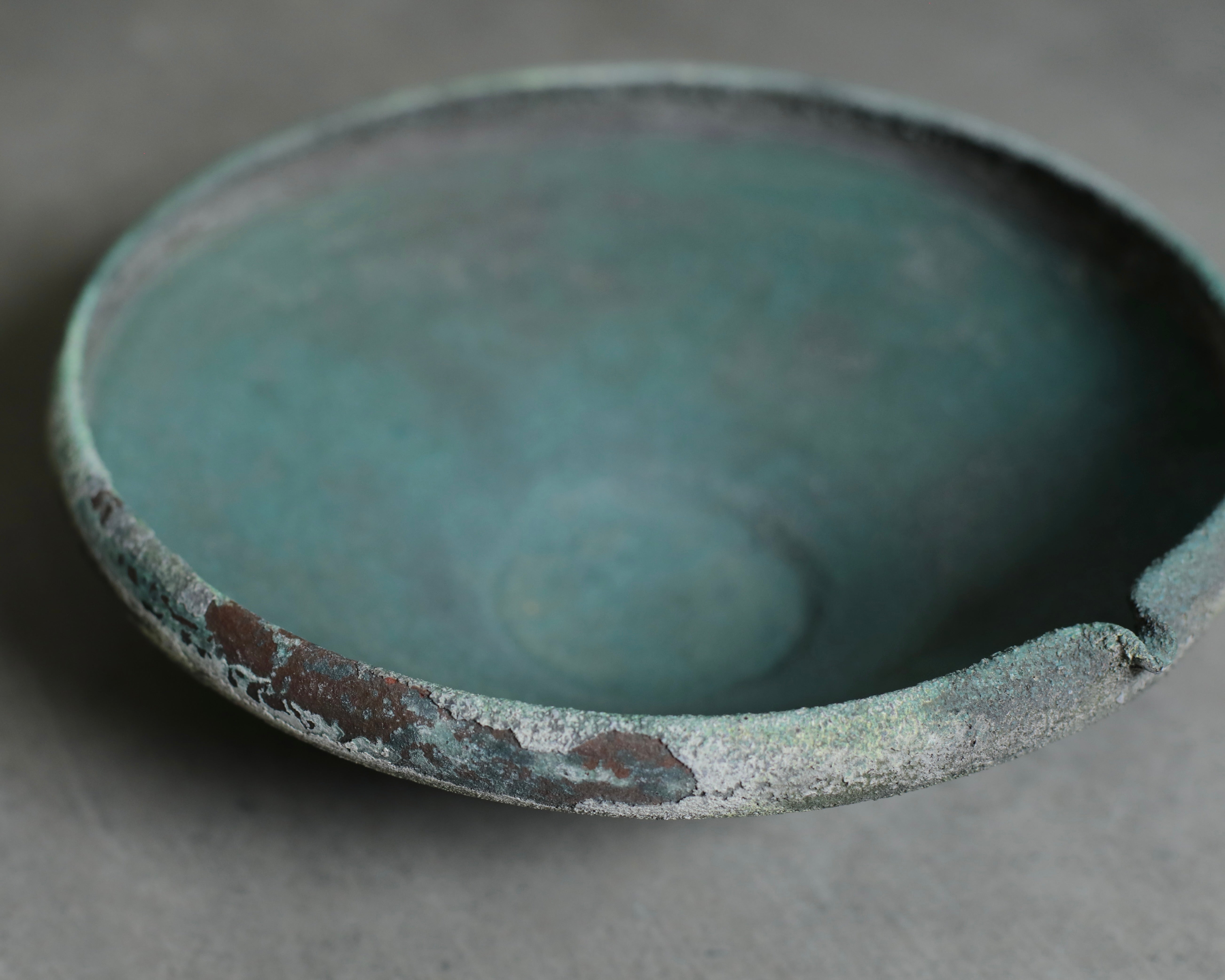 Elevated on a narrow base, this wide, shallow bowl opens gently outward, its form balanced between lightness and stability. A small spout detail at the rim introduces a subtle gesture of function; the piece invites both use and contemplation. This vessel is made from naturally sourced materials and has been exquisitely hand-turned before being fired in a textured lichen-like glaze. The surface bears a crystalline texture, enriched by a deep chromatic blend of natural colours.