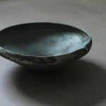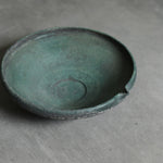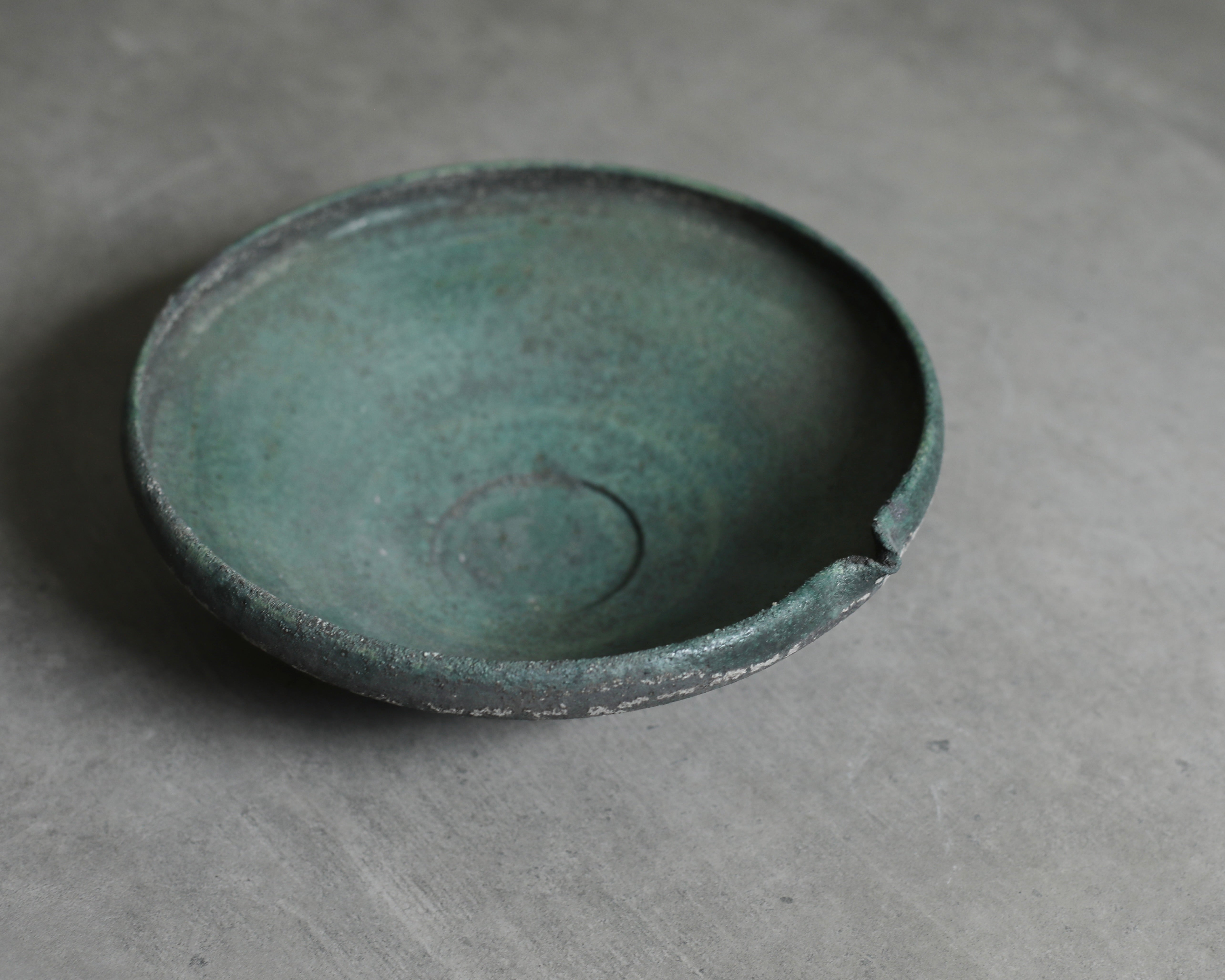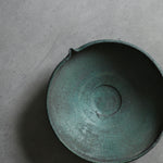 Elevated on a narrow base, this wide, shallow bowl opens gently outward, its form balanced between lightness and stability. A small spout detail at the rim introduces a subtle gesture of function; the piece invites both use and contemplation. This vessel is made from naturally sourced materials and has been exquisitely hand-turned before being fired in a textured lichen-like glaze. The surface bears a crystalline texture, enriched by a deep chromatic blend of natural colours.