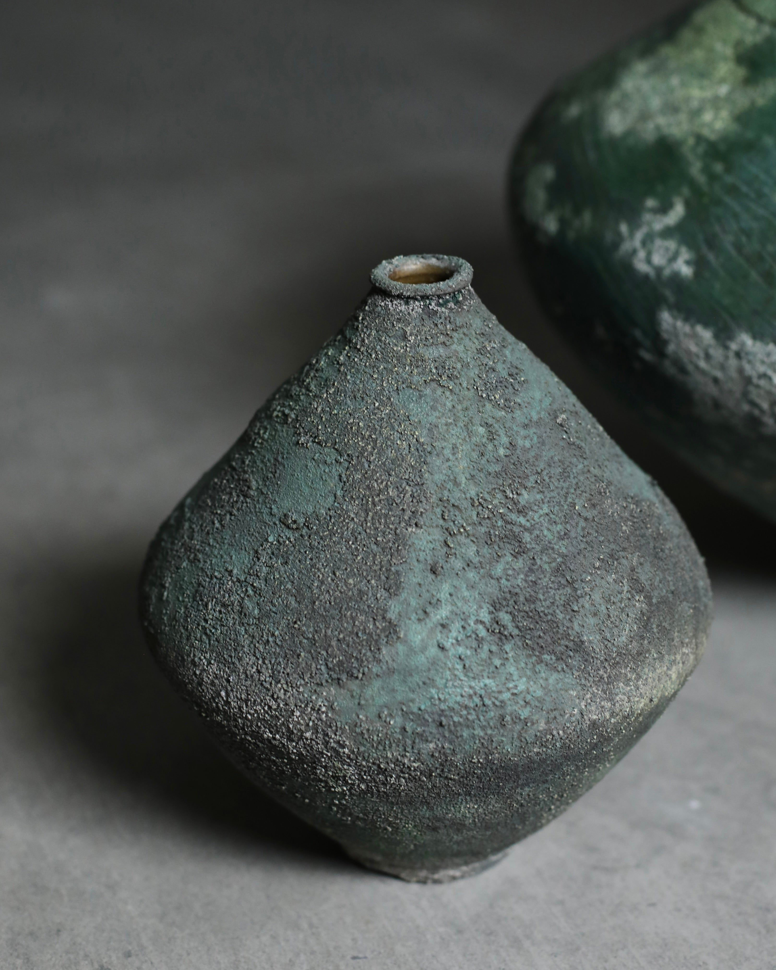 Noguchi's mastery of firewood kilns is particularly evident in his latest series, Verdigris Green. These dynamic, finely made pieces murmur through hues of chromium oxide to rich copper green. This hum of colour is echoed in the tactile moss-like surfaces he achieves by adding an accumulation of ash during the firing processes. The resulting works blur the line between contemporary pottery and historical artefacts, endowing them with an enigmatic beauty that leaves the origins of these pieces unclear, an ideal that Noguchi is seeking within his work.