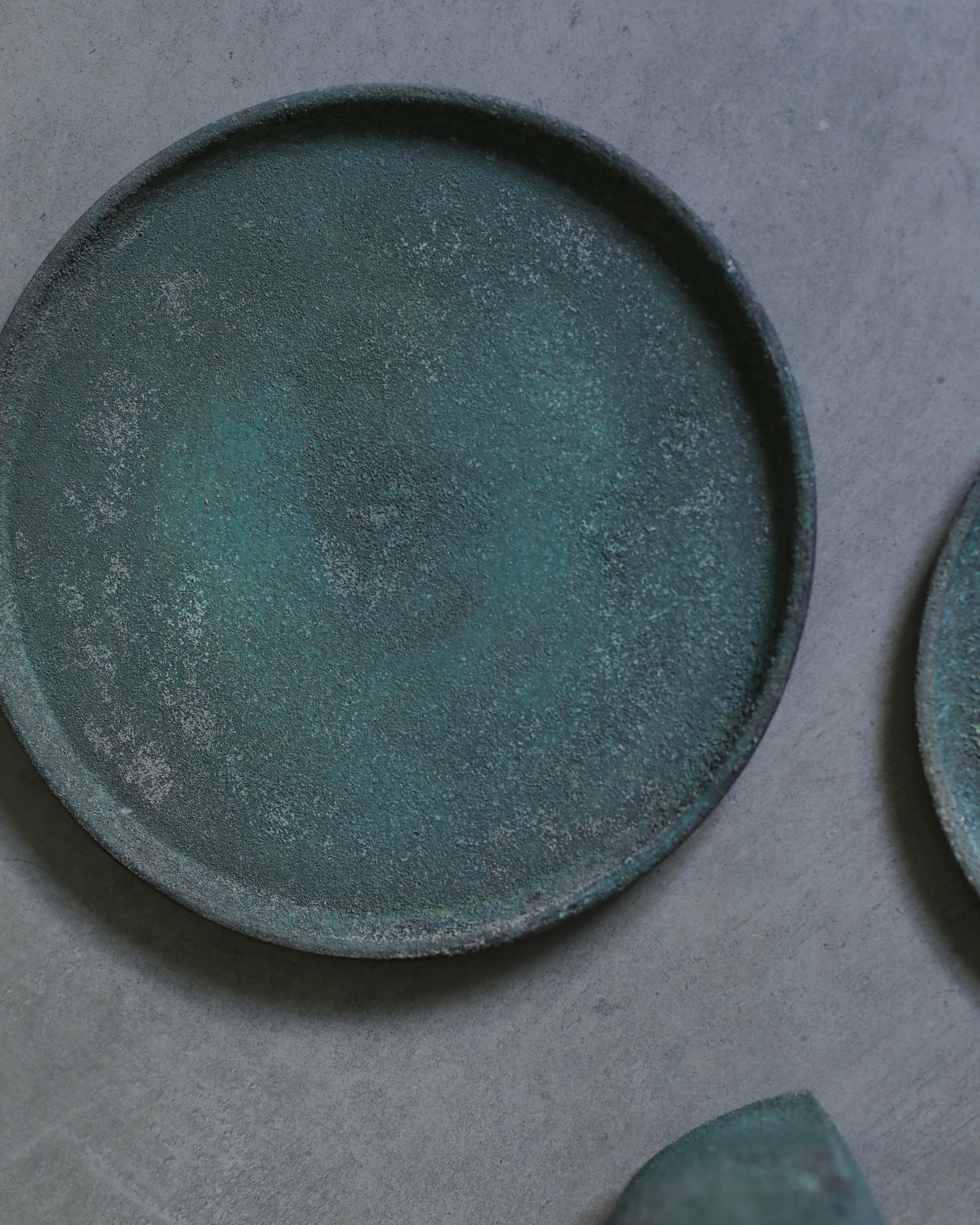 An artisanal small plate hand-crafted by Etsuji Noguchi. This plate is made from naturally sourced materials and has been exquisitely hand-turned before being fired in a textured lichen-like glaze. The plates surface is a rich chroma of dappled blue-green verdigris and moss green with areas of crystallization towards its centre. A small step at the plate’s lip exposes the deep chard-red clay beneath, accentuating its sophisticated forms.