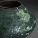 This vessel rises from a narrow base, expanding swiftly into a full, rounded body before tapering inward to a defined lip. The silhouette is both bold and contained, balancing volume with restraint. This vessel is made from naturally sourced materials and has been exquisitely hand-turned before being fired in a textured lichen-like glaze. The surface bears a crystalline texture, enriched by a deep chromatic blend of natural colours.