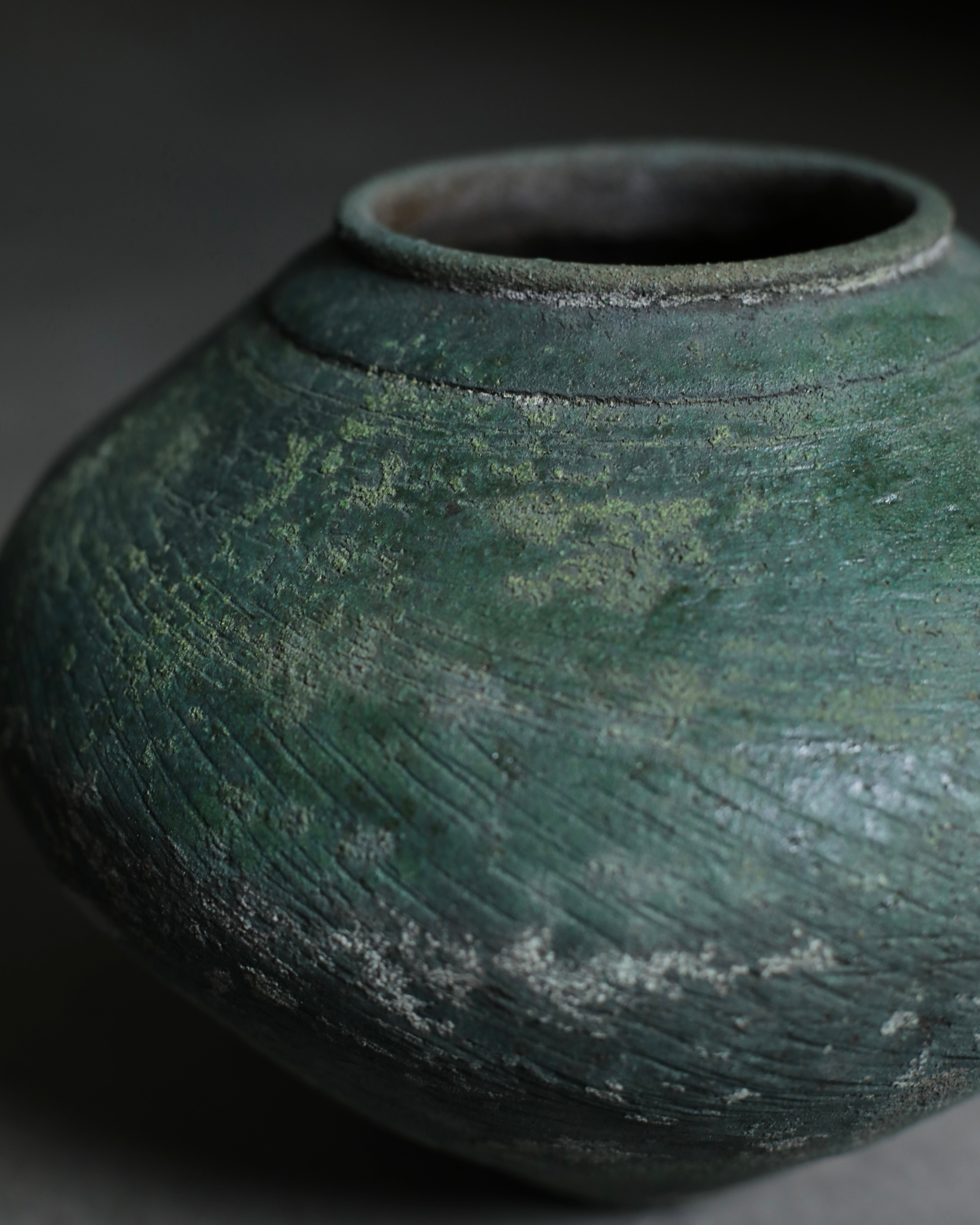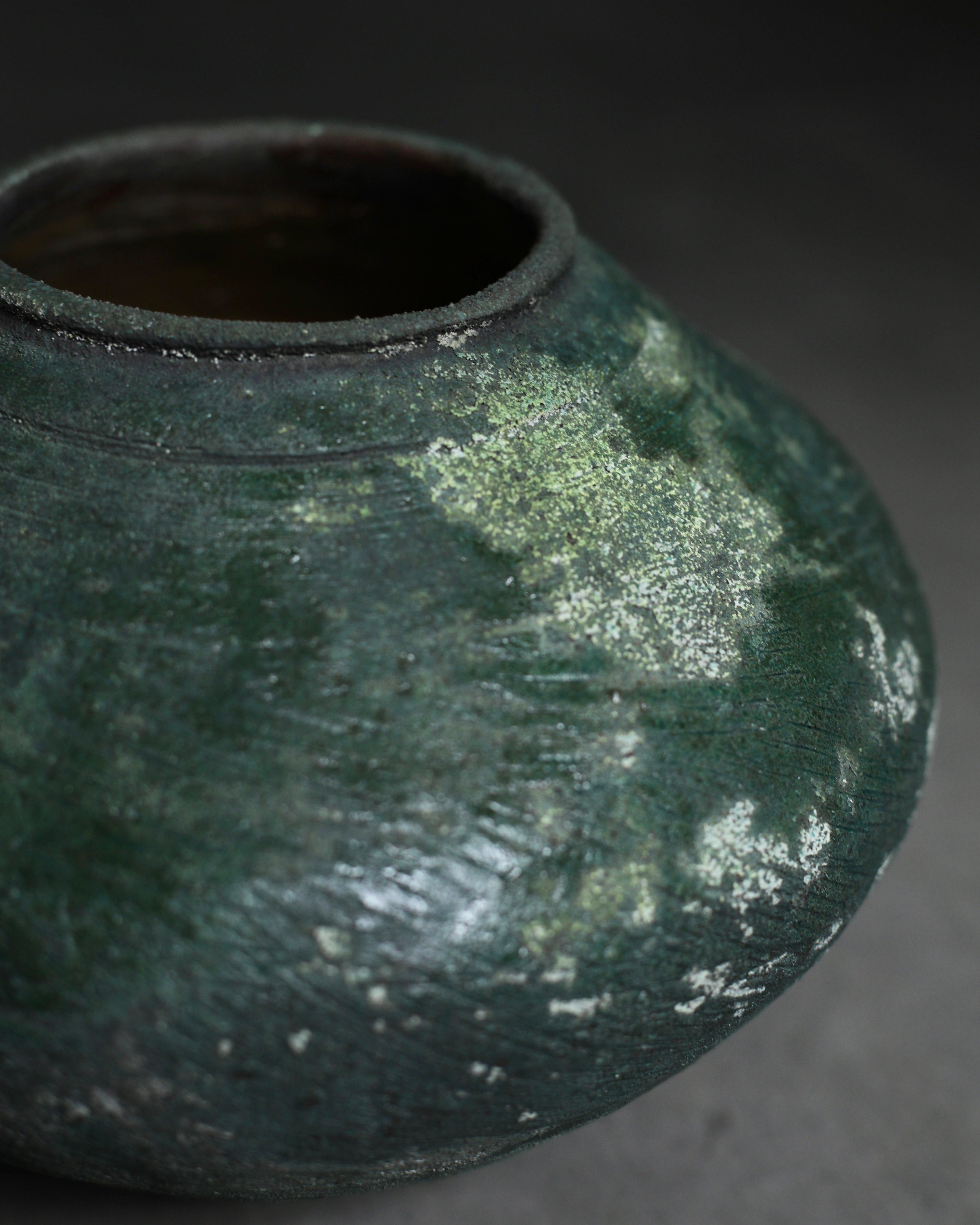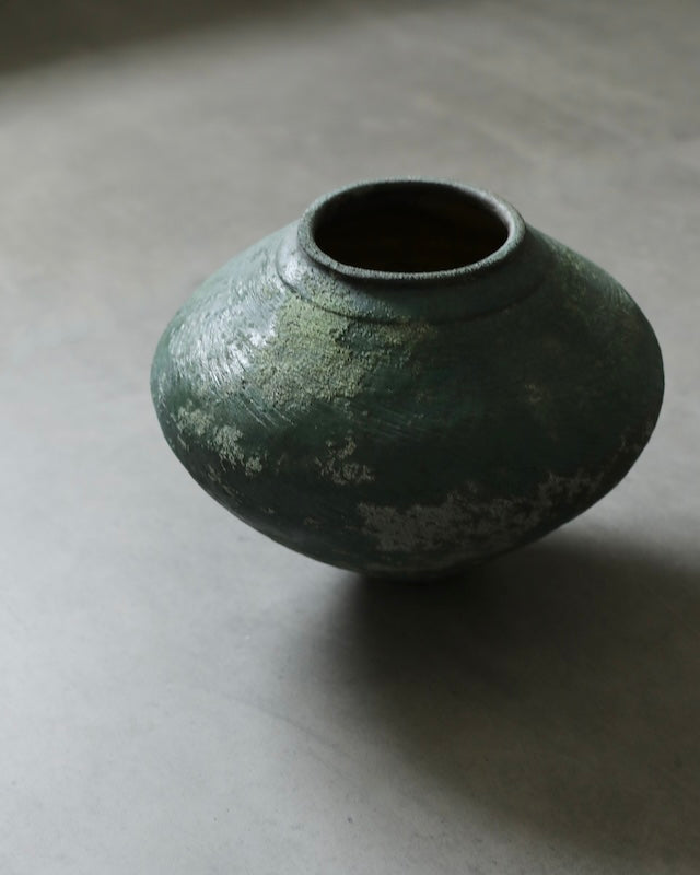Noguchi's mastery of firewood kilns is particularly evident in his latest series, Verdigris Green. These dynamic, finely made pieces murmur through hues of chromium oxide to rich copper green. This hum of colour is echoed in the tactile moss-like surfaces he achieves by adding an accumulation of ash during the firing processes. The resulting works blur the line between contemporary pottery and historical artefacts, endowing them with an enigmatic beauty that leaves the origins of these pieces unclear, an ideal that Noguchi is seeking within his work.